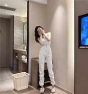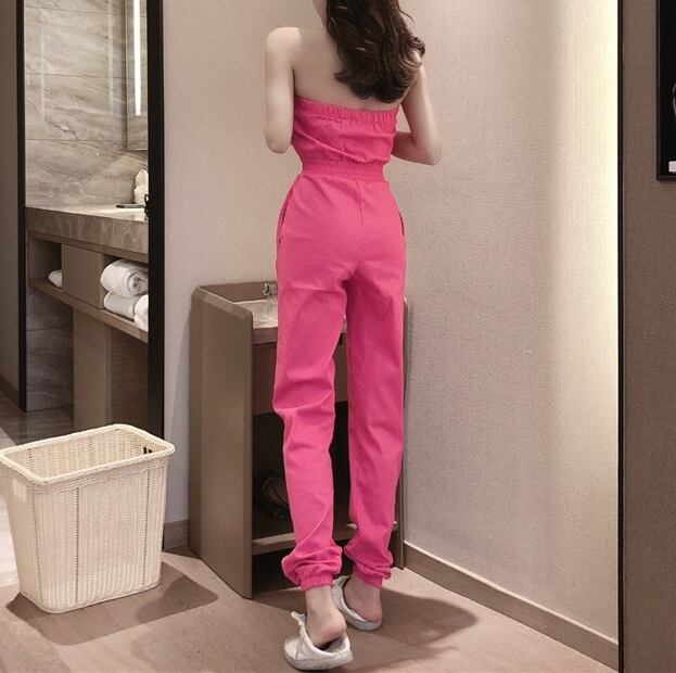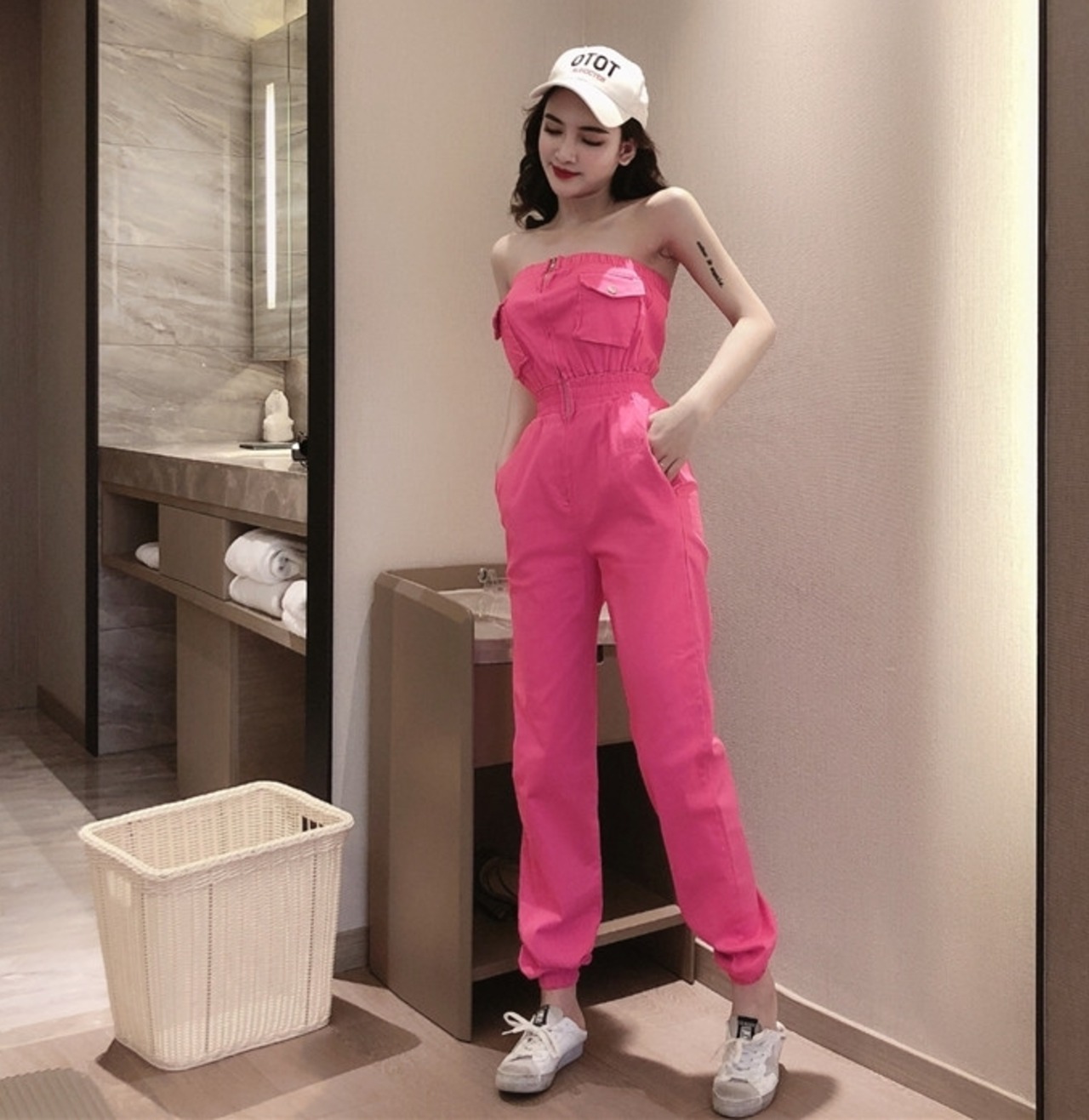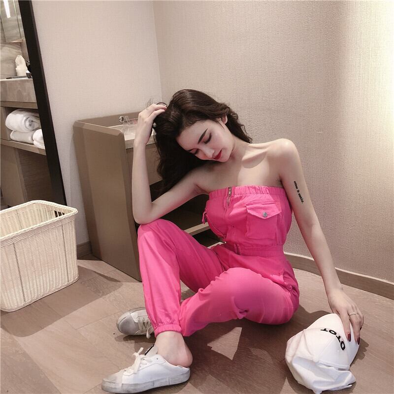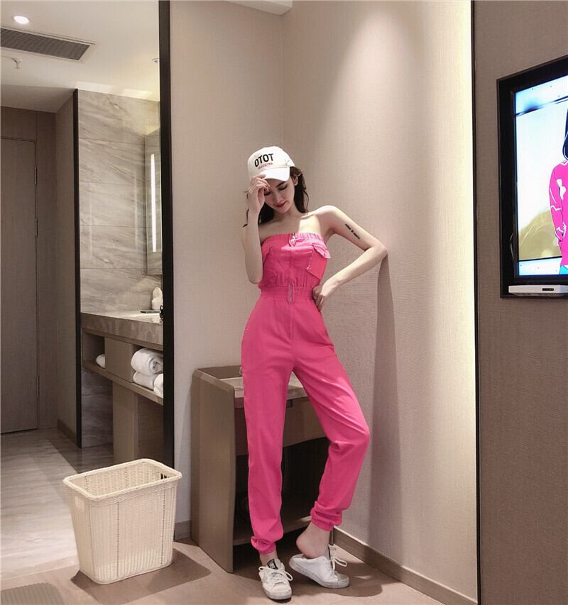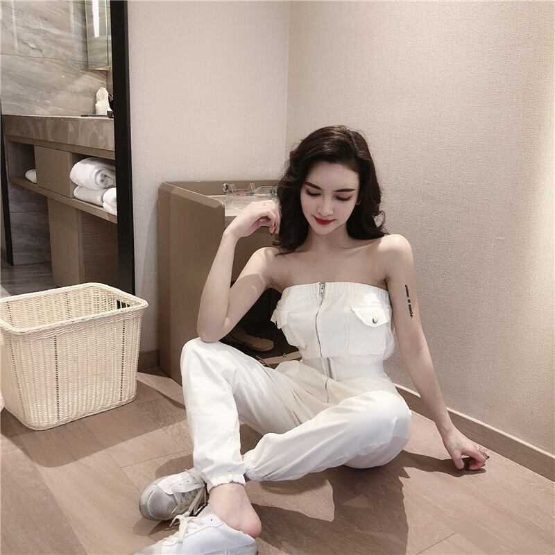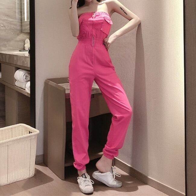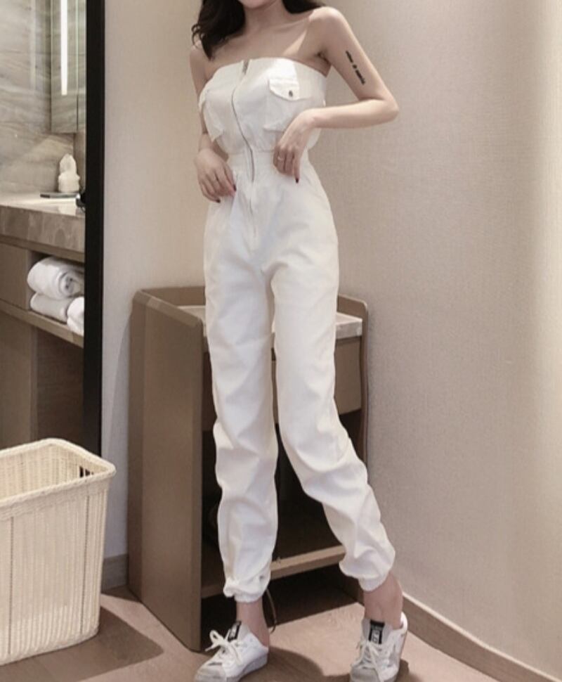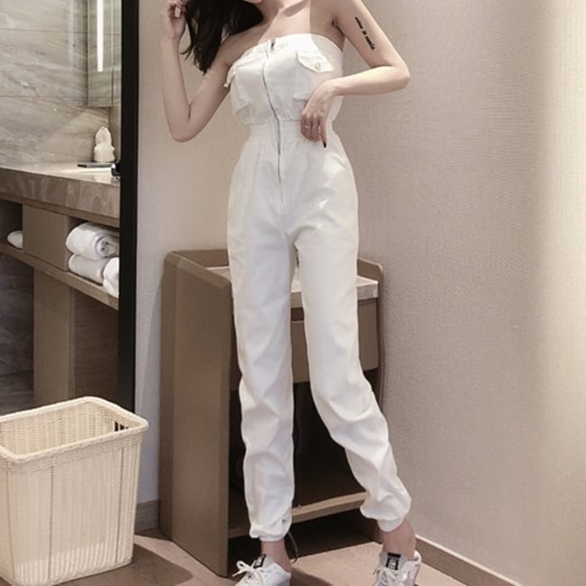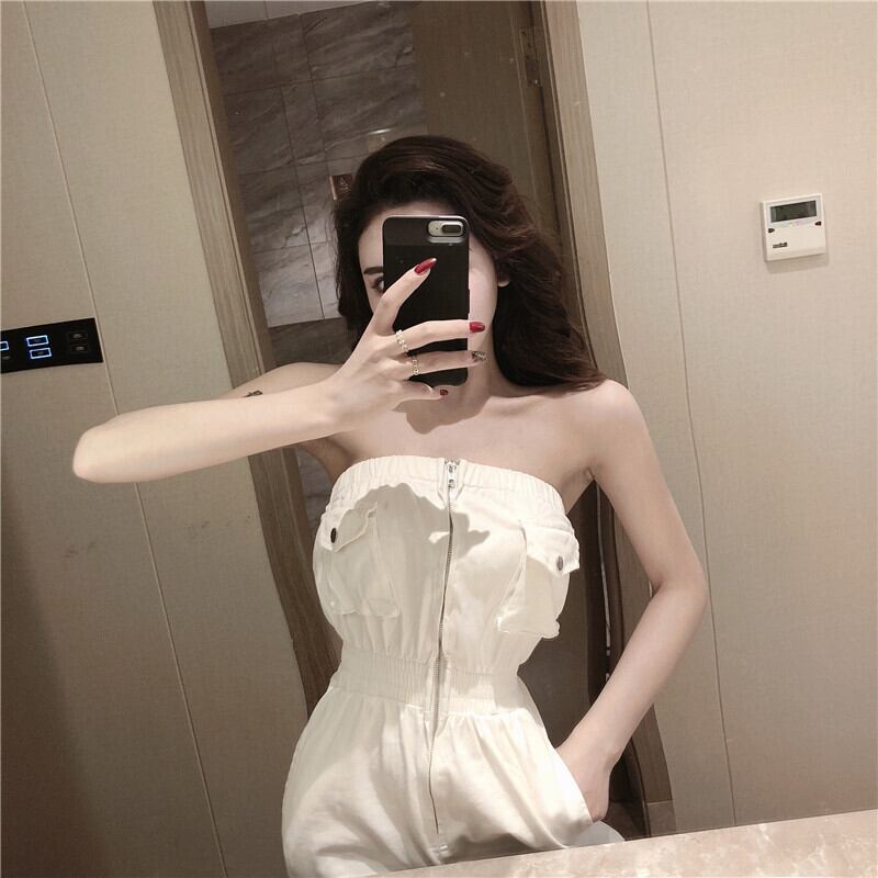 全2色 オールインワン ジャンプスーツ ベアトップ チューブトップ スリム フロントジッパー ハイウエスト カジュアル お出かけ デート デイリー 夏