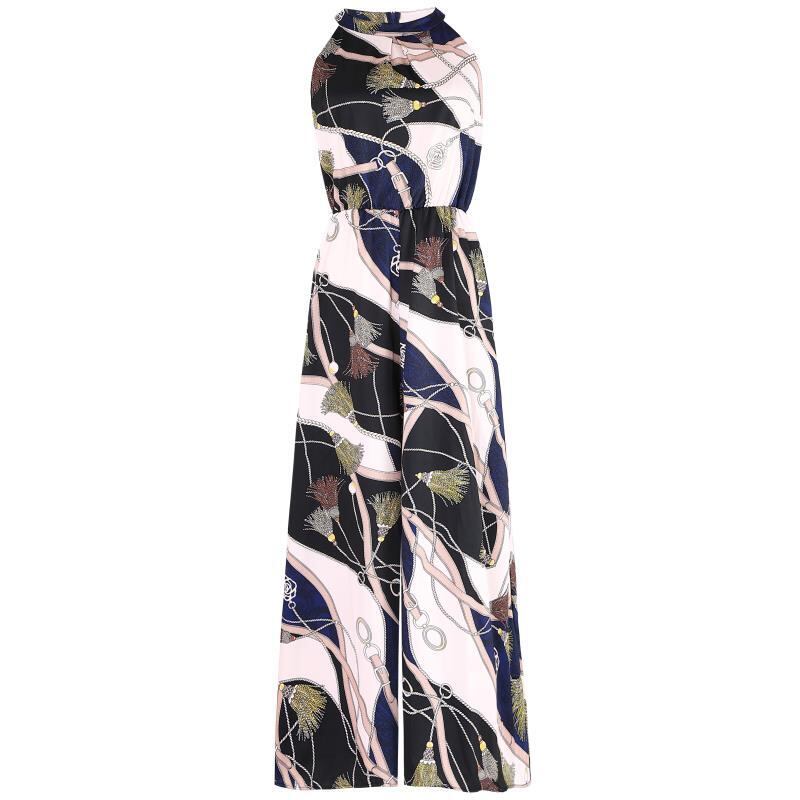 全3色 ジャンプスーツ オールインワン ホルターネック ハイネック 柄 プリント ノースリーブ ワイドレッグ シック 上品 エレガント 大人 カジュアル きれいめ 女子会 デート 夏 秋