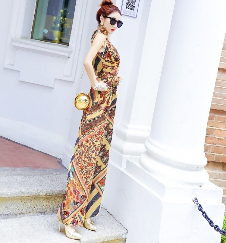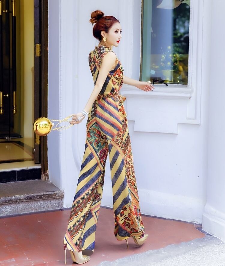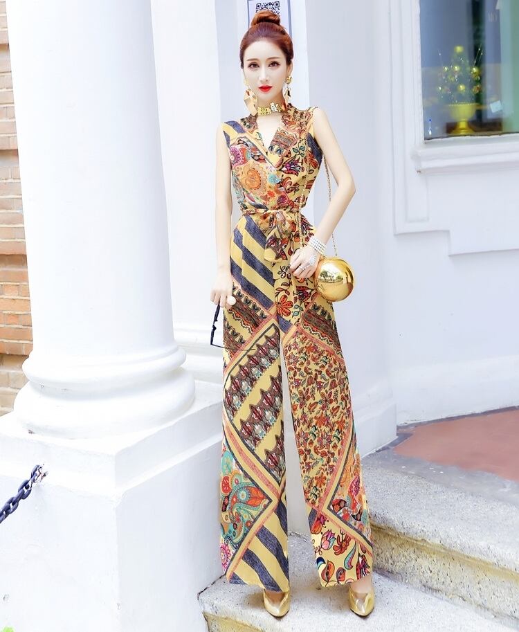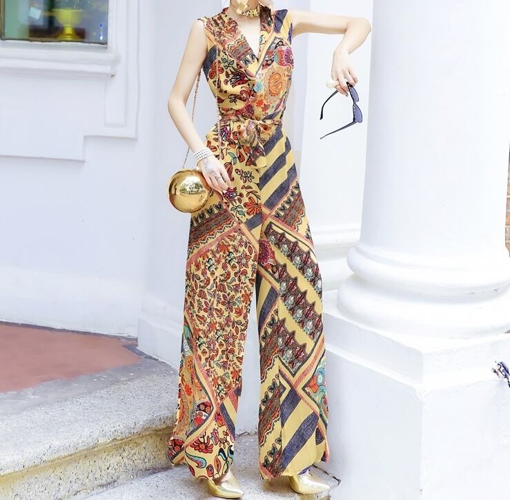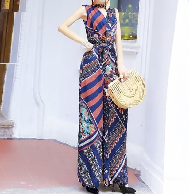 ジャンプスーツ オールインワン Vネック カシュクールネック ペイズリー柄 プリント ノースリーブ ハイウエスト ウエストリボン ワイドレッグ シック エスニック 上品 エレガント 大人 カジュアル きれいめ 女子会 デート 夏 秋