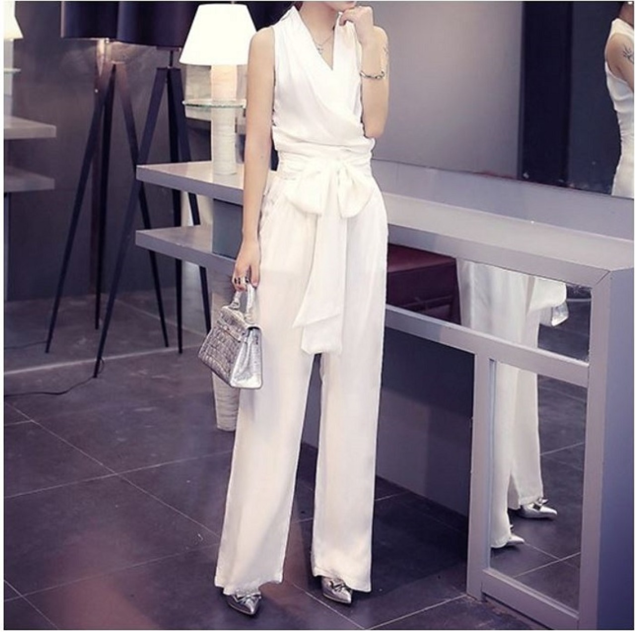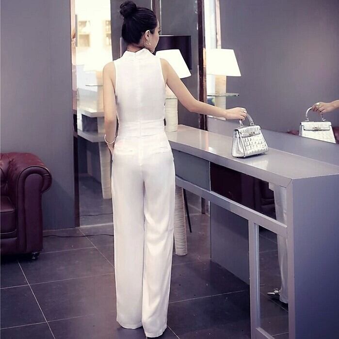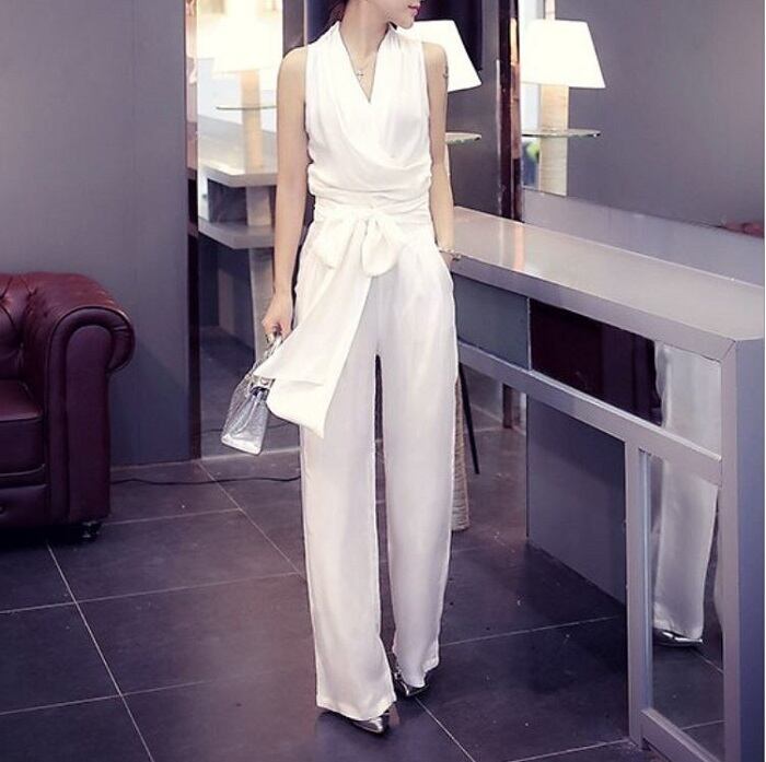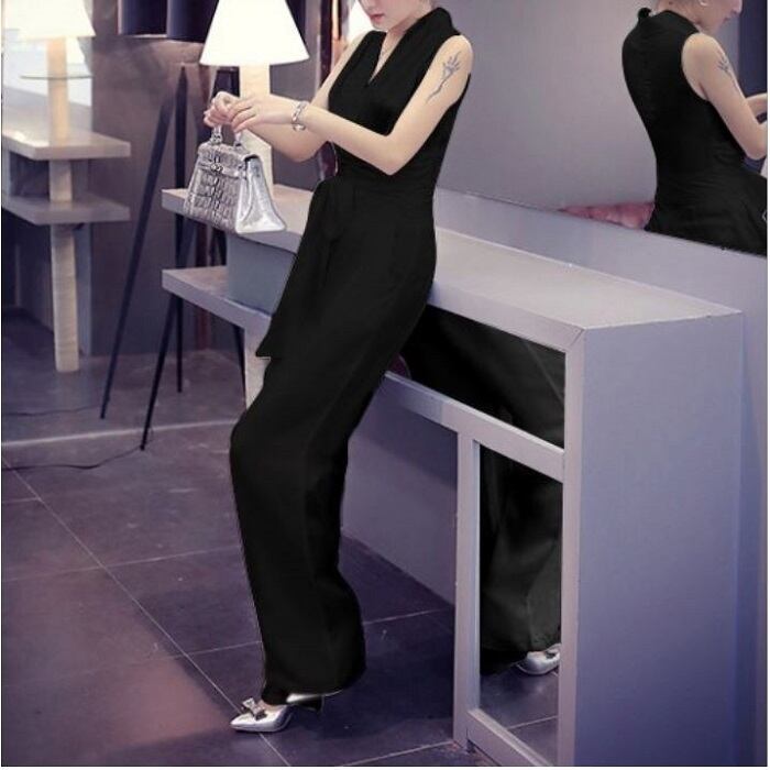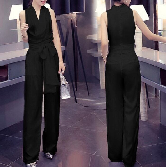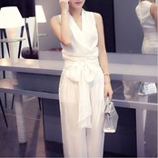 ノースリーブのカシュクールデザインが綺麗でクールな印象のジャンプスーツ。