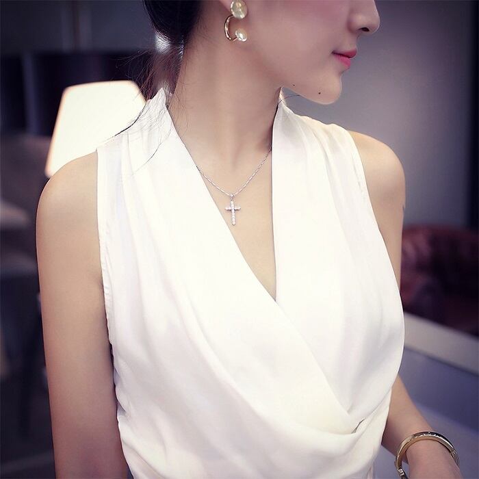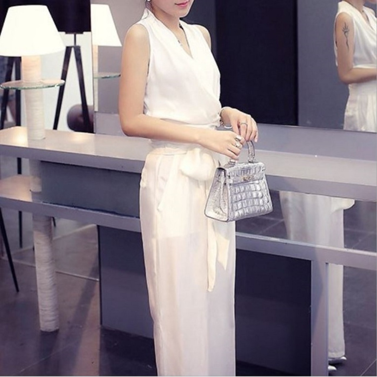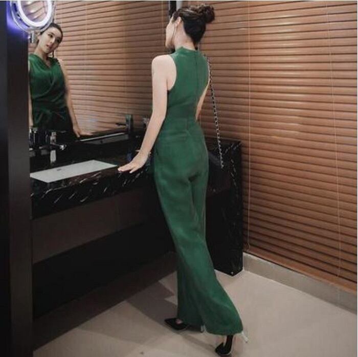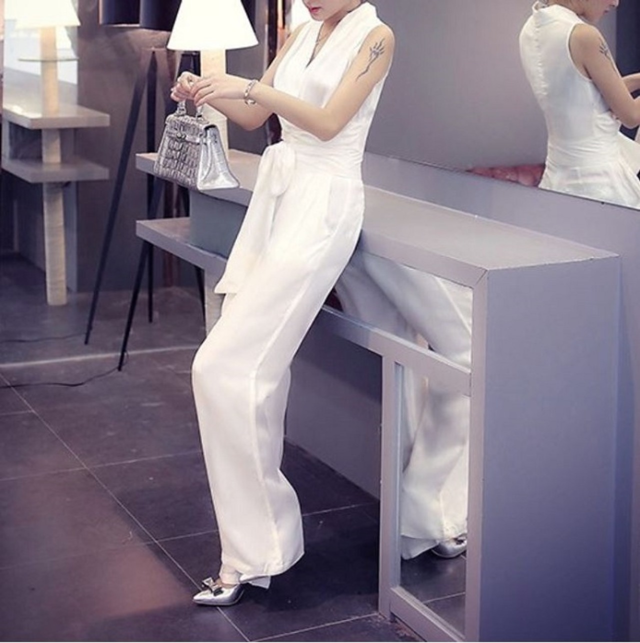 ノースリーブのカシュクールデザインが綺麗でクールな印象のジャンプスーツ。