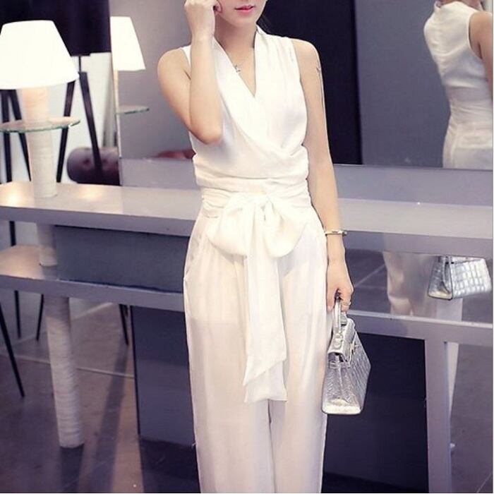 全3色 ジャンプスーツ オールインワン カシュクール ノースリーブ Vネック ウエストリボン ワイドパンツ ロングパンツ きれいめ カジュアル シンプル レトロ セクシー お出かけ デート 女子会 リゾート パーティ 結婚式 夏 ホワイト ブラック グリーン