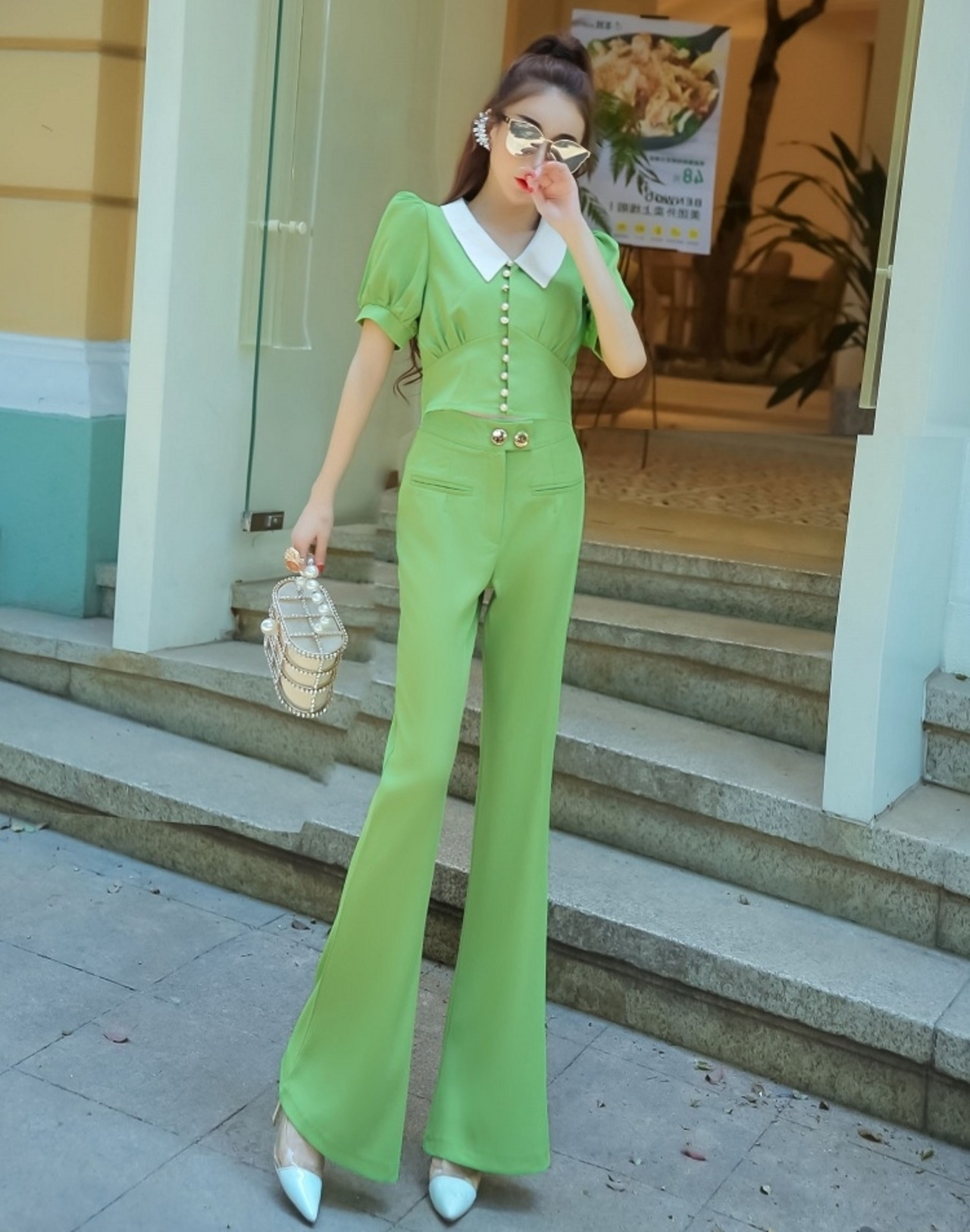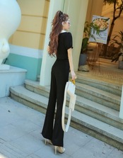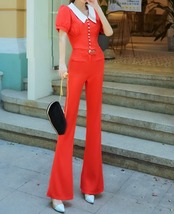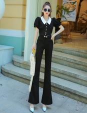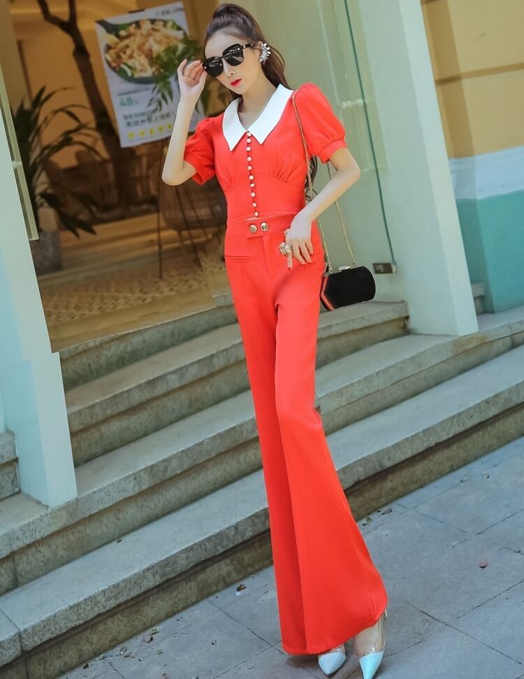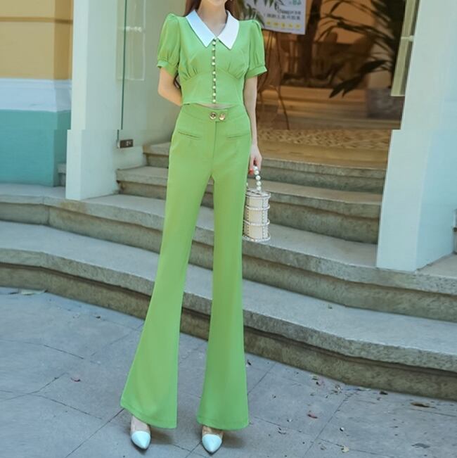 全3色 セットアップ ツーピース ブラウス フレアパンツ ブーツカット 半袖 襟 フロントボタン ハイウエスト 上品 お呼ばれ シック 女子会 デート カジュアル きれいめ 夏 秋