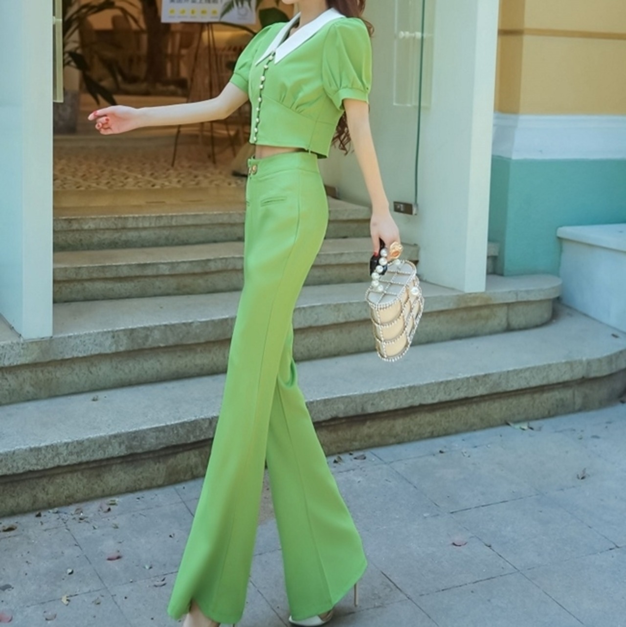 上品で大人っぽい印象のトップスとパンツのセットアップ。