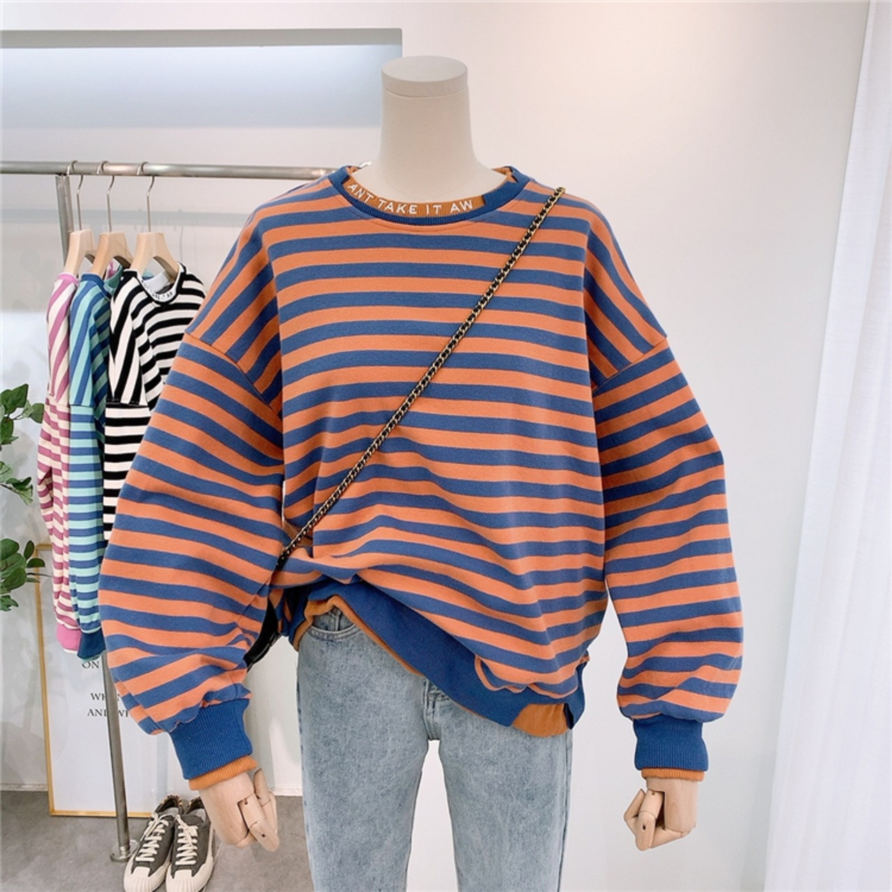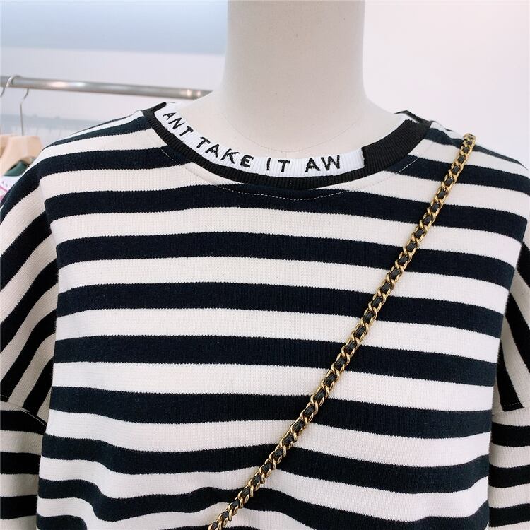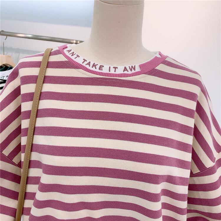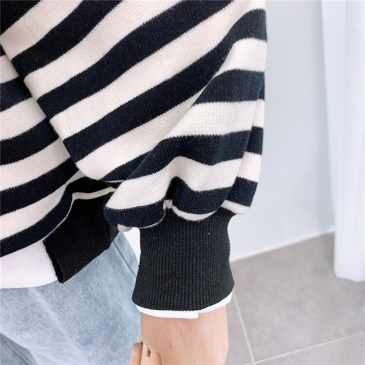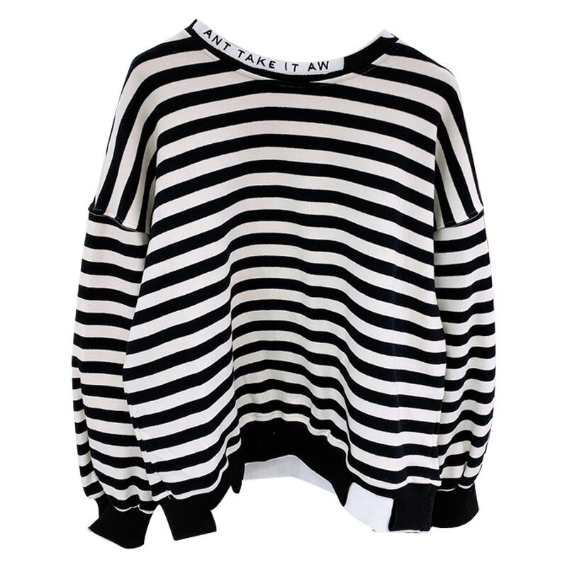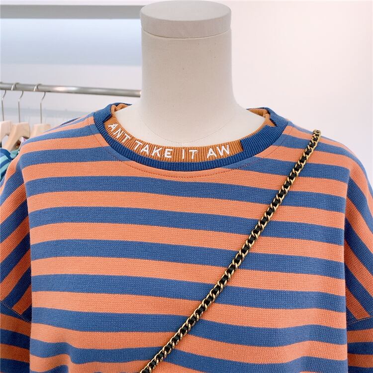 全2色 トップス トレーナー オーバーサイズ ゆったり ボーダー セーター カジュアル 配色 学生 ロゴ入り クール ダメージ加工 デイリー リラックス お出かけ デート あったか 韓国ファッション 秋 冬