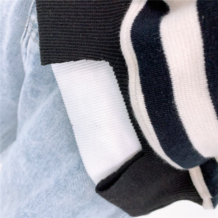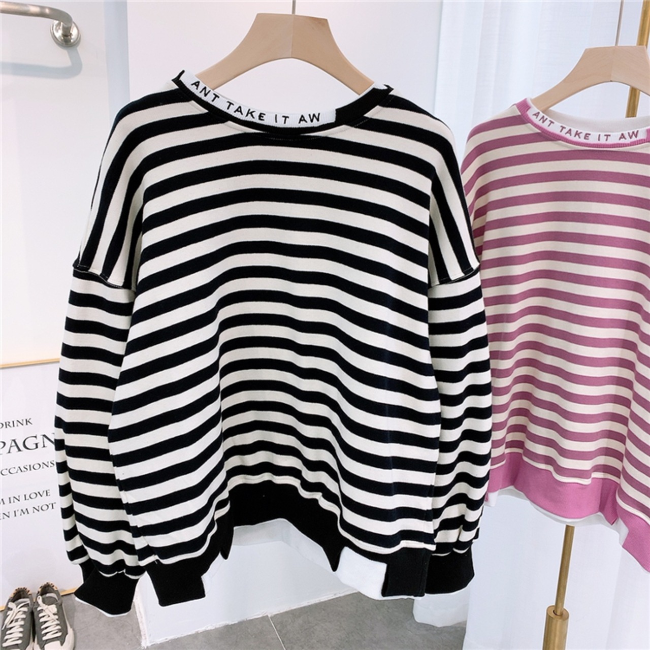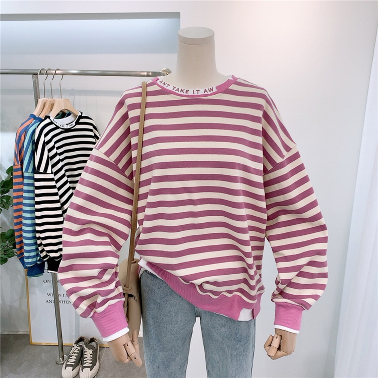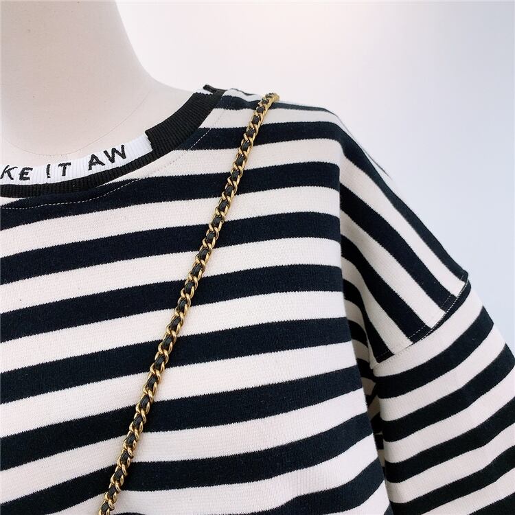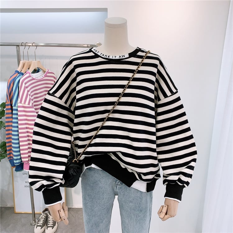 全2色 トップス トレーナー オーバーサイズ ゆったり ボーダー セーター カジュアル 配色 学生 ロゴ入り クール ダメージ加工 デイリー リラックス お出かけ デート あったか 韓国ファッション 秋 冬