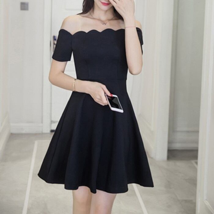 ワンピース ドレス オフショルダー 半袖 ミニ丈 フレアスカート ハイウエスト ガーリー きれいめ シンプル レトロ お出かけ お呼ばれ デート 女子会 リゾート 結婚式 二次会 夏 ブラック
