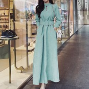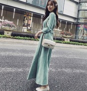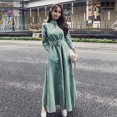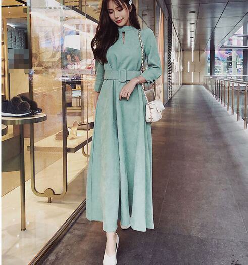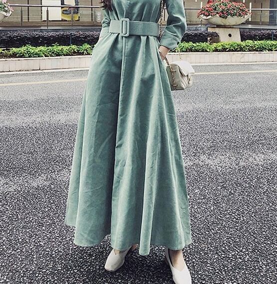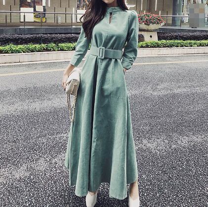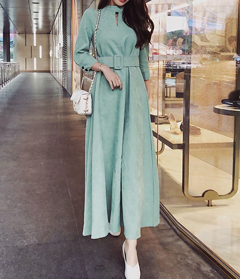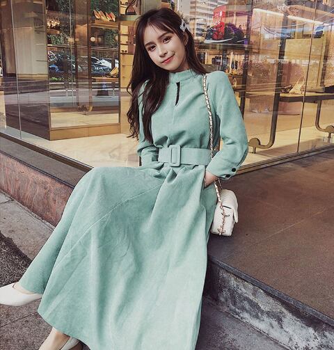 選べる丈 ワンピース ロング丈 ミモレ丈 長袖 ハイネック コーデュロイ ウエストベルト 大人 ハイウエスト フレア 上品 カジュアル シック デート お出かけ 秋 冬