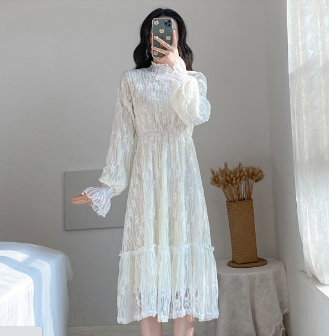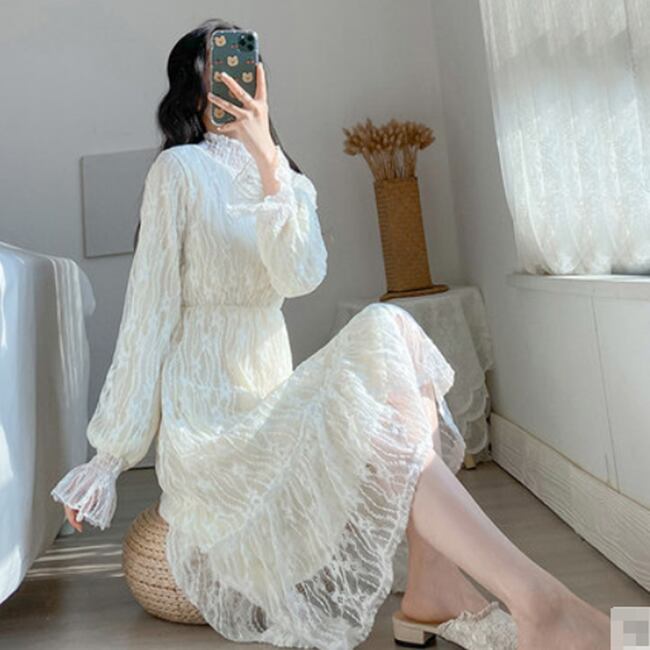 全2種類 ワンピース 総レース ミモレ丈 長袖 ティアード ハイネック Aライン トランペットスリーブ 上品 カジュアル 大人可愛い お出かけ 女子会 デート 秋 冬