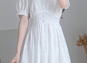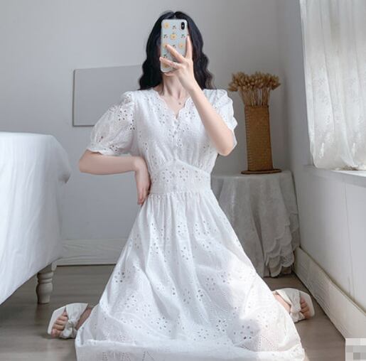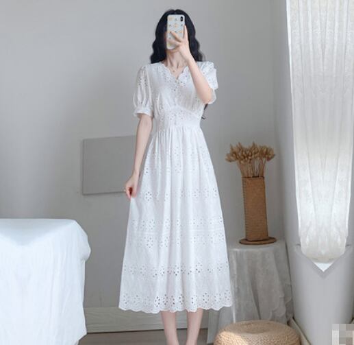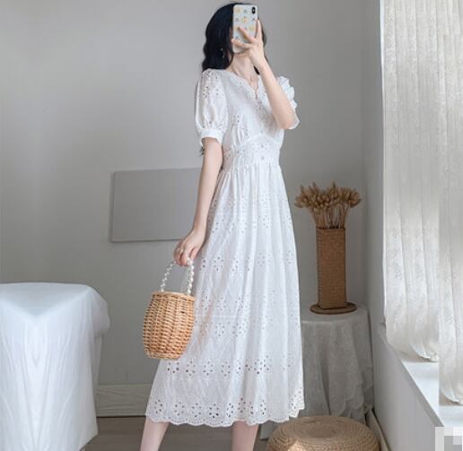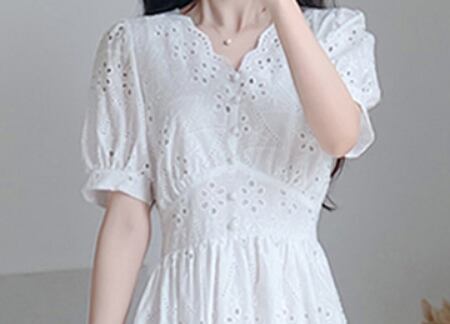 ワンピース レース ミモレ丈 半袖 ティアード Vネック フロントボタン Aライン パフスリーブ ハイウエスト フレア 上品 カジュアル 大人可愛い お出かけ デイリー デート リゾート 夏
