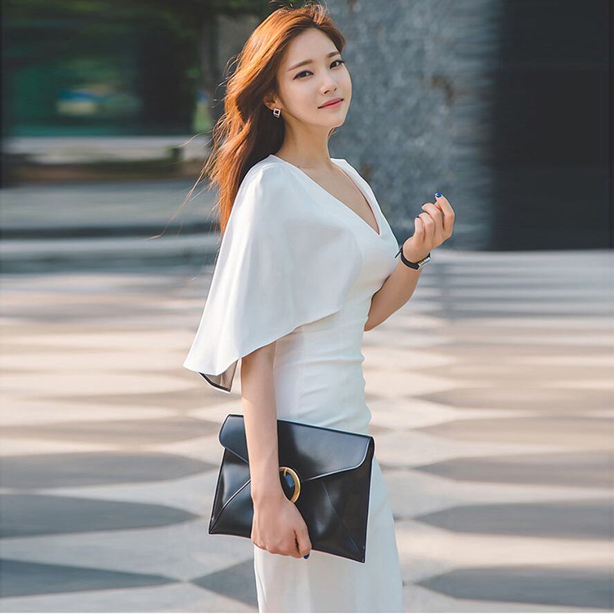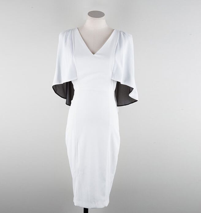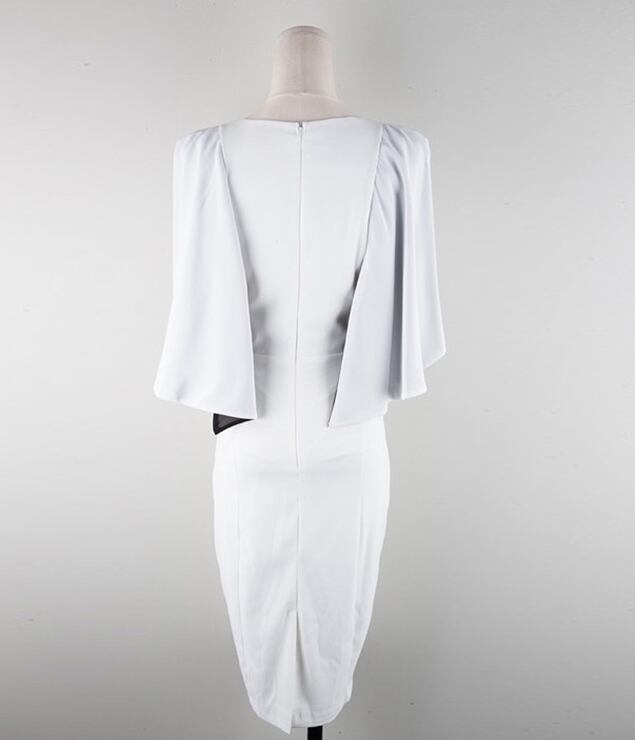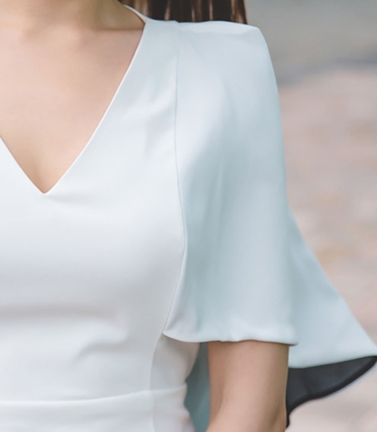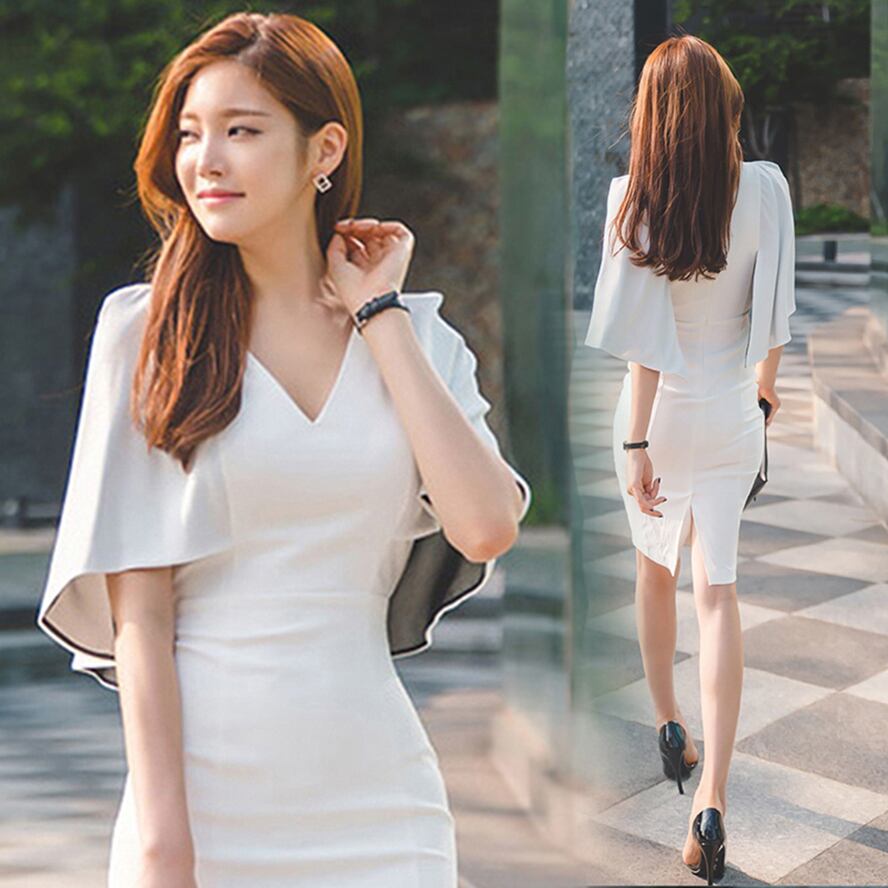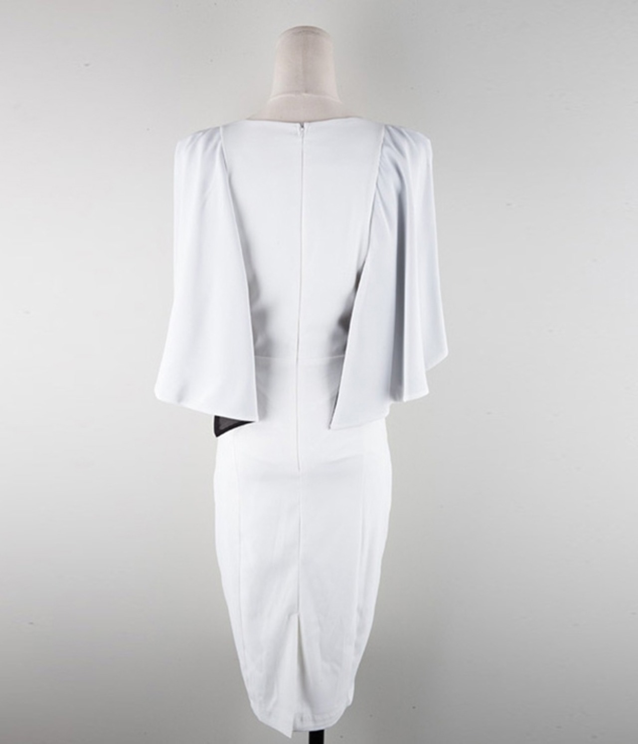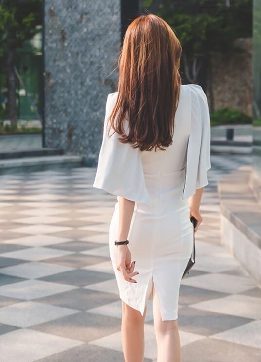 ワンピース ドレス ひざ丈 ポンチョスリーブ 袖コンシャス フレアスリーブ バックスリット タイト Vネック 上品 エレガント お呼ばれ フォーマル 結婚式 スリム 大人 パーティー 韓国ファッション 夏 秋
