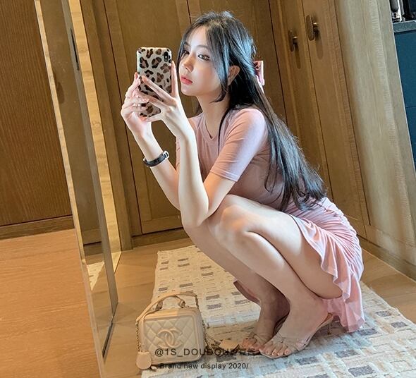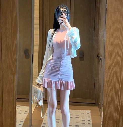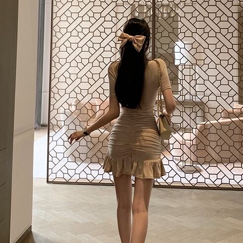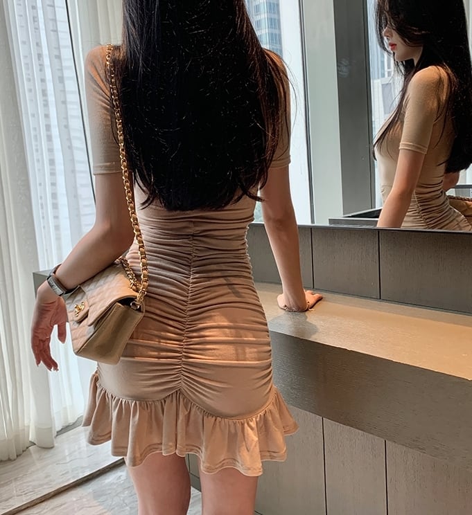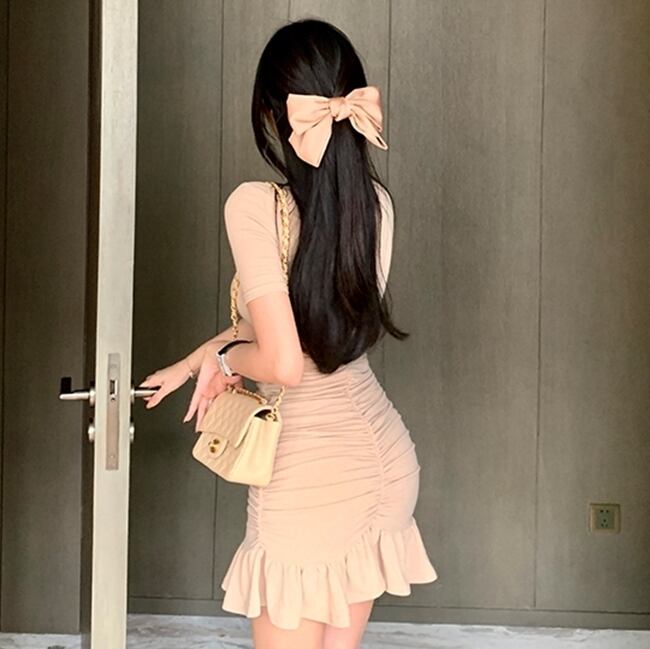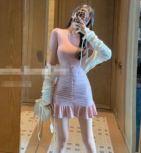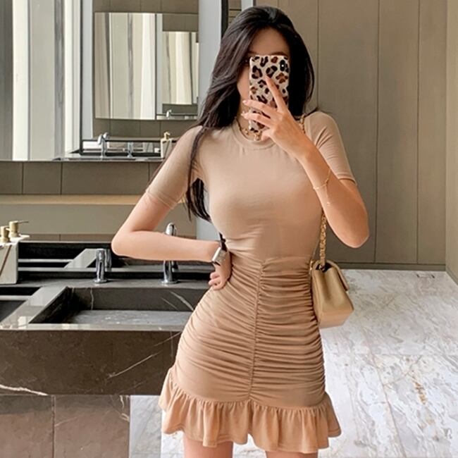全2色 ワンピース ミニ丈 フリル 半袖 ガーリー タイト スリム 可愛い マーメイド クルーネック セクシー キャバ デート カジュアル デイリー シック フロントシャーリング きれいめ 夏 秋