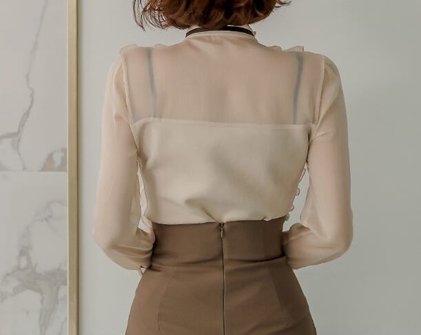 上品で大人っぽい印象のブラウスとスカートのセットアップ。