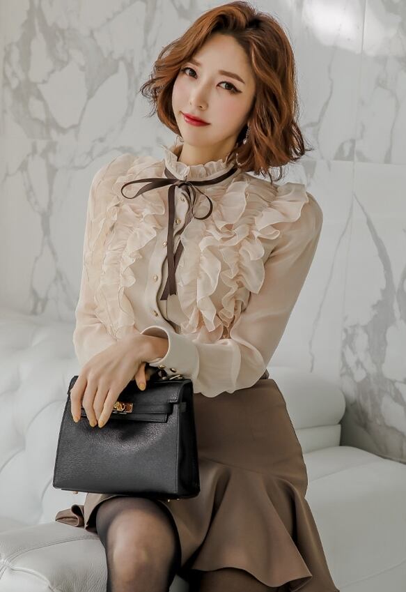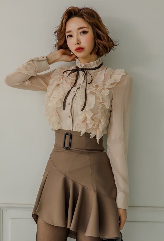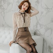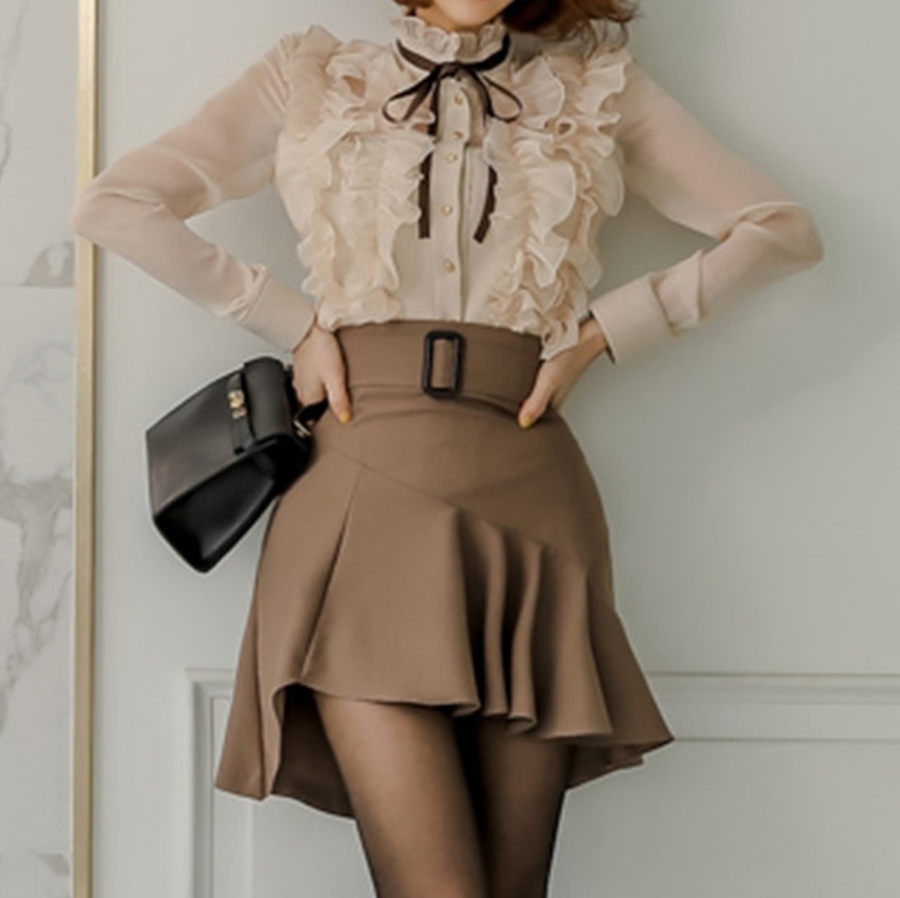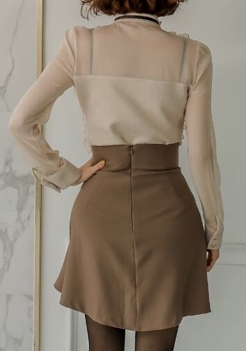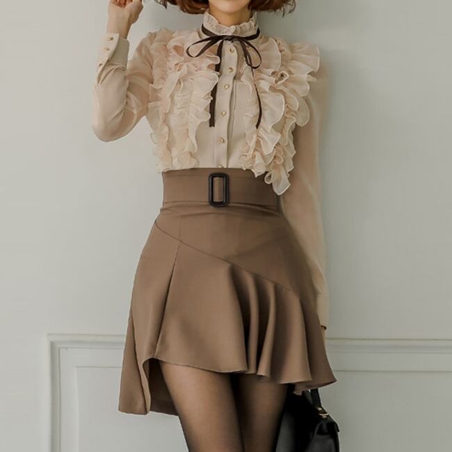 セットアップ ツーピース ブラウス ミニ丈 スカート フロントボタン フリル Aライン フレア ウエストベルト ハイウエスト 長袖 ボウタイネック ハイネック リボン 上品 エレガント 大人 女子会 きれいめ カジュアル デート ディナー 秋 冬