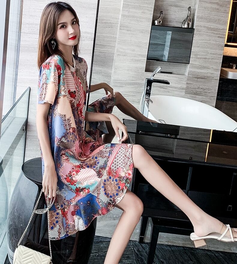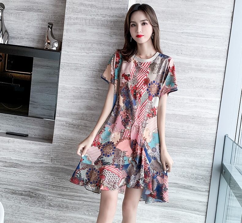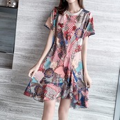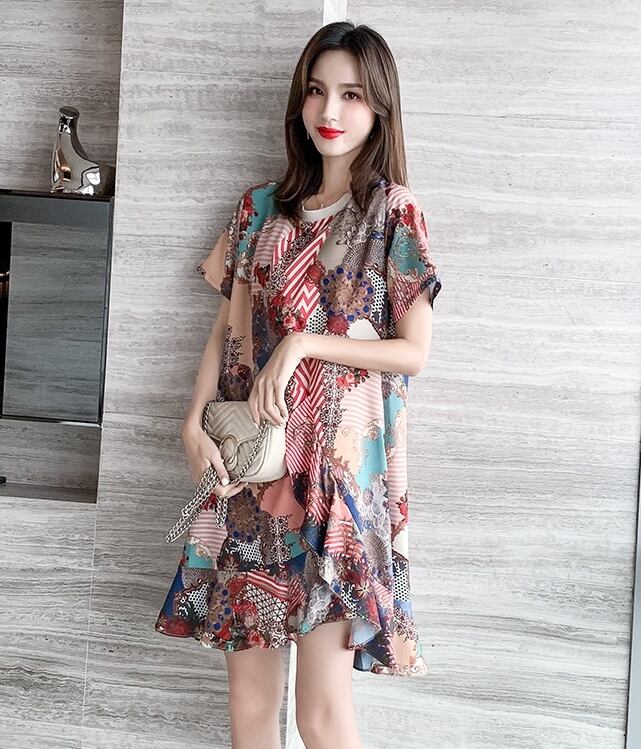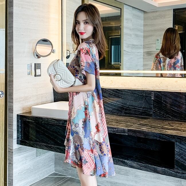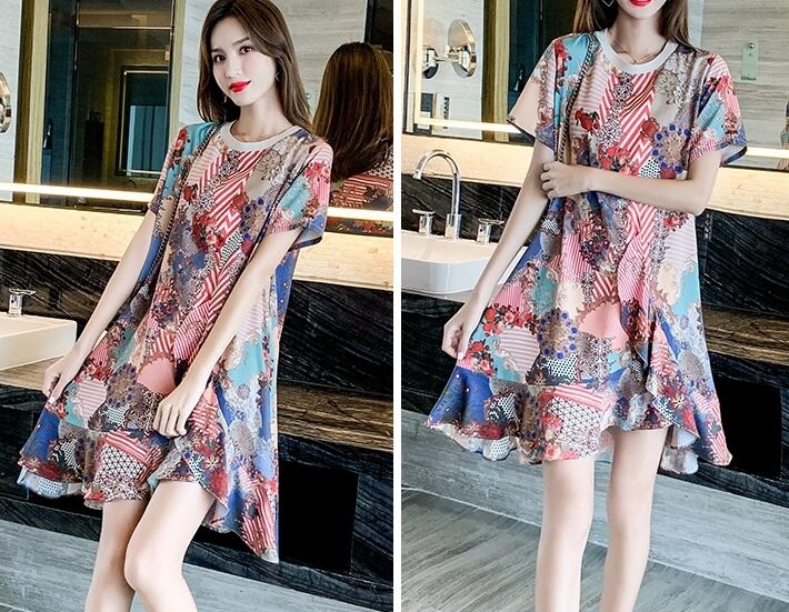 ワンピース アシンメトリー ミニ丈 柄 プリント フレア Aライン クルーネック 半袖 チュニック 大人可愛い 配色 カジュアル デイリー デート お出かけ リゾート 韓国ファッション 夏