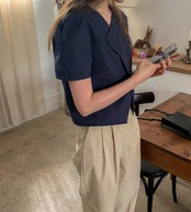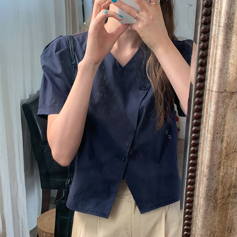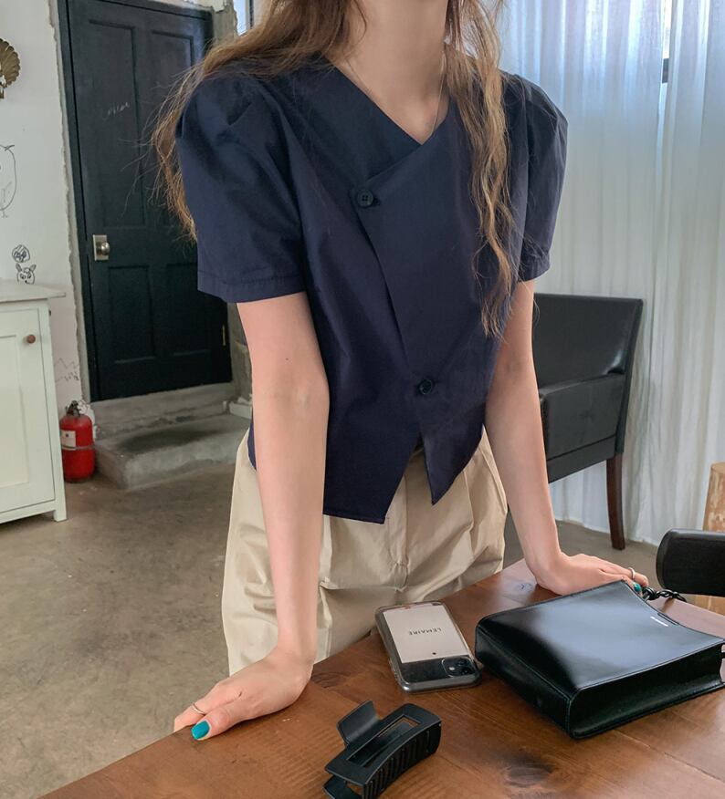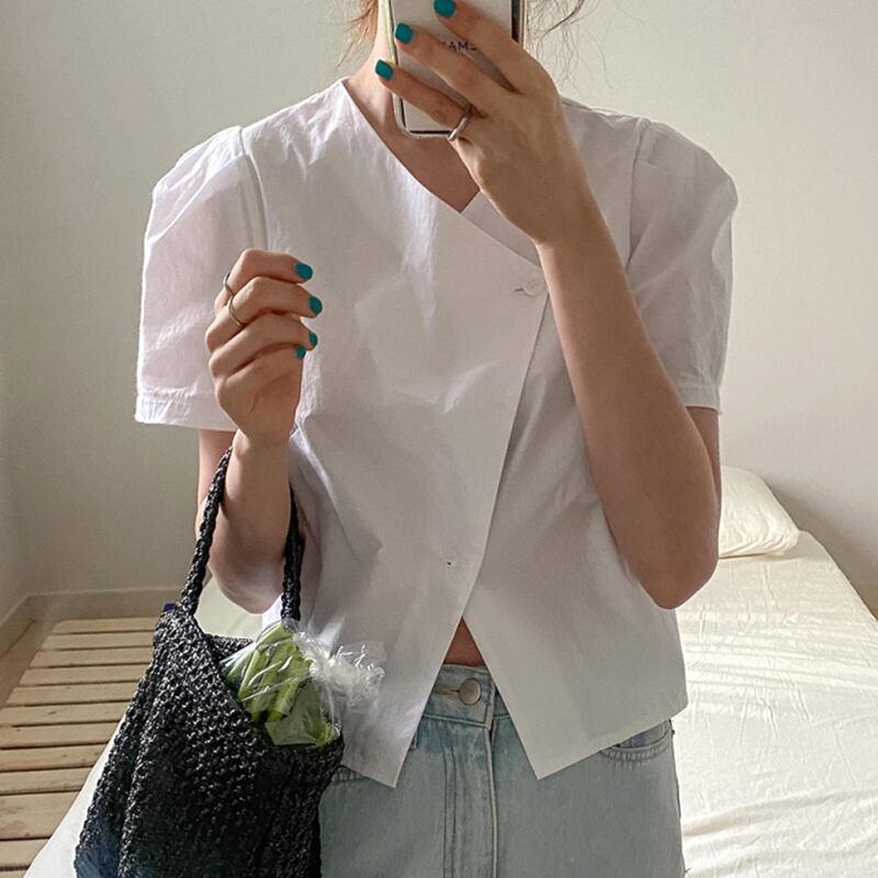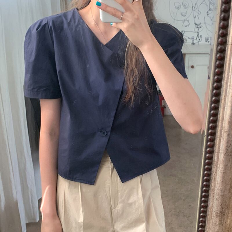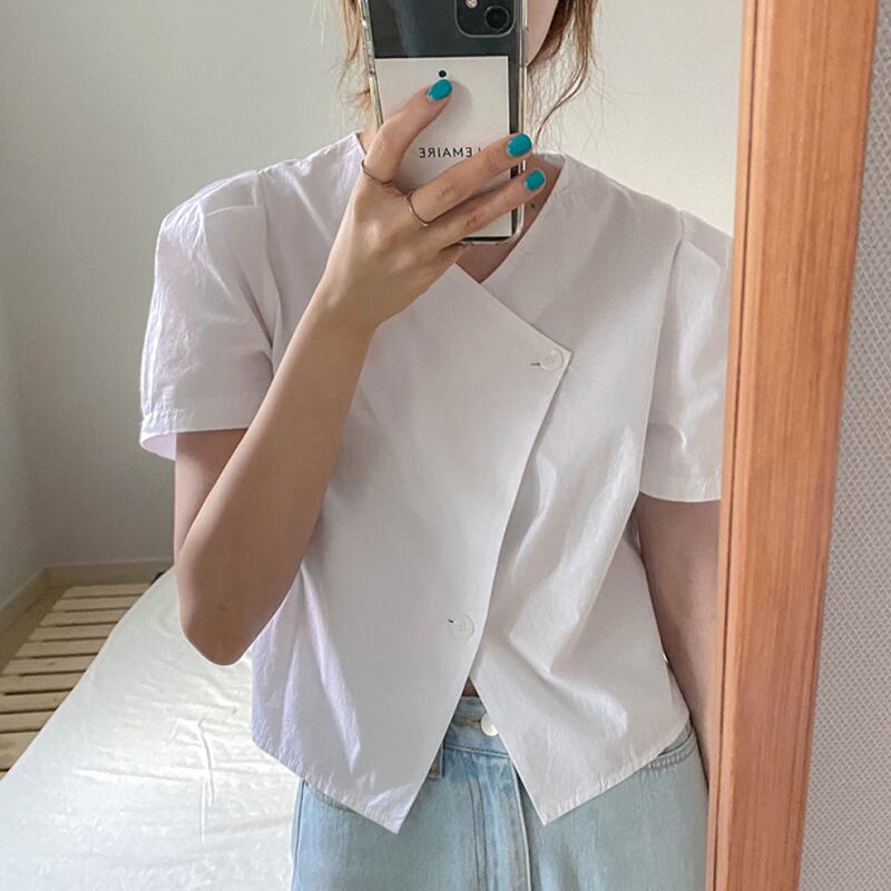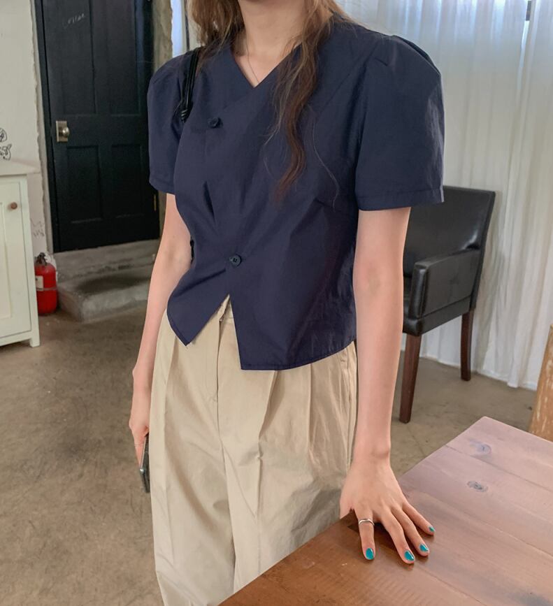 トップス ブラウス シャツ ショート丈 Vネック カシュクール フロントボタン 半袖 ユニーク 大人 カジュアルデイリー きれいめ お出かけ アシンメトリー きれいめ 夏
