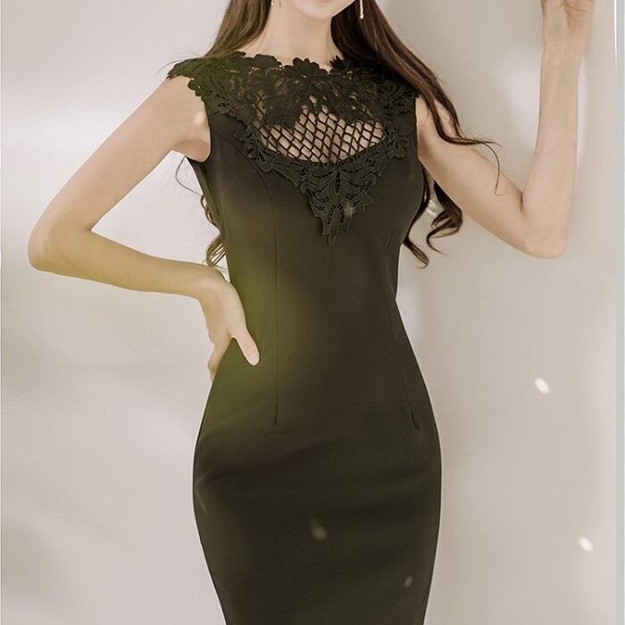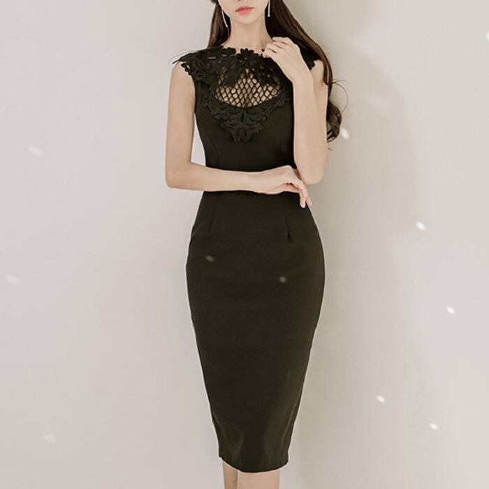 ワンピース ドレス レース スリム タイトスカート ひざ丈 透け感 ノースリーブ ハイウエスト きれいめ シンプル レトロ お出かけ お呼ばれ デート 女子会 デイリー 夏 ブラック