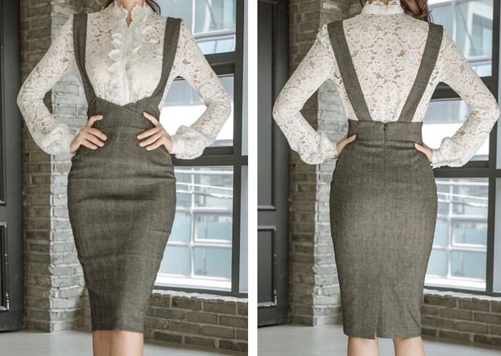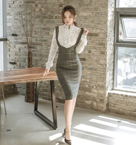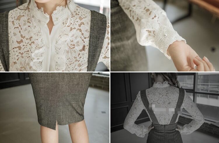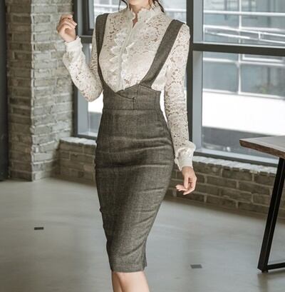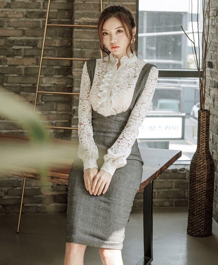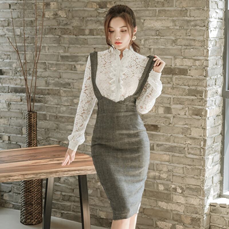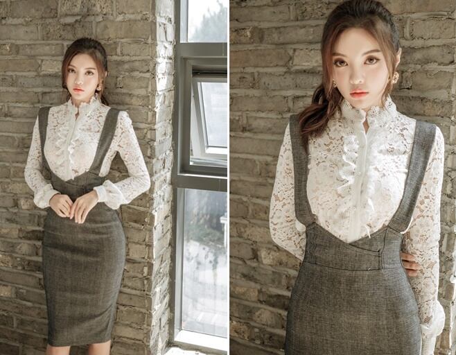 全2種 ブラウス レース ハイネック フリル シースルー 長袖 サロペットスカート サスペンダースカート スリム タイト ミひざ丈 バックスリット 大人 デート お出かけ カジュアル きれいめ 女子会 韓国ファッション 秋 冬