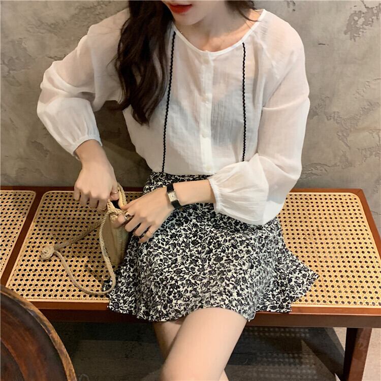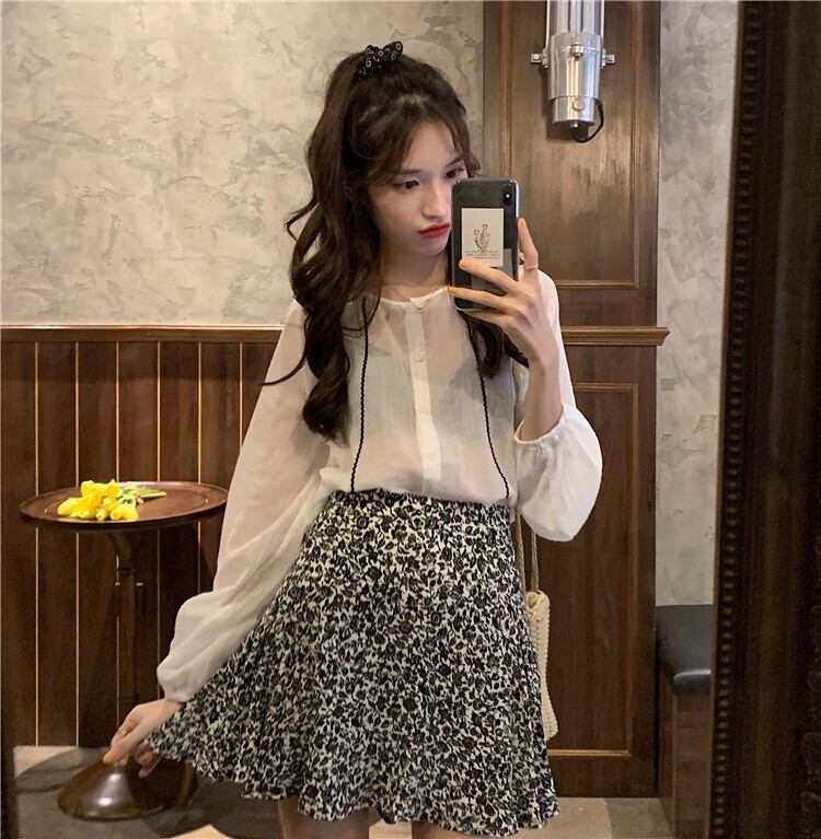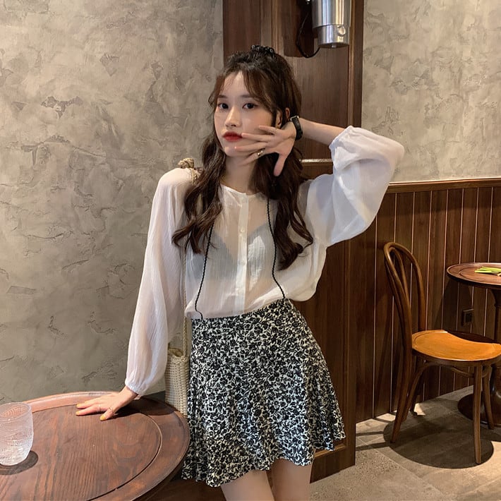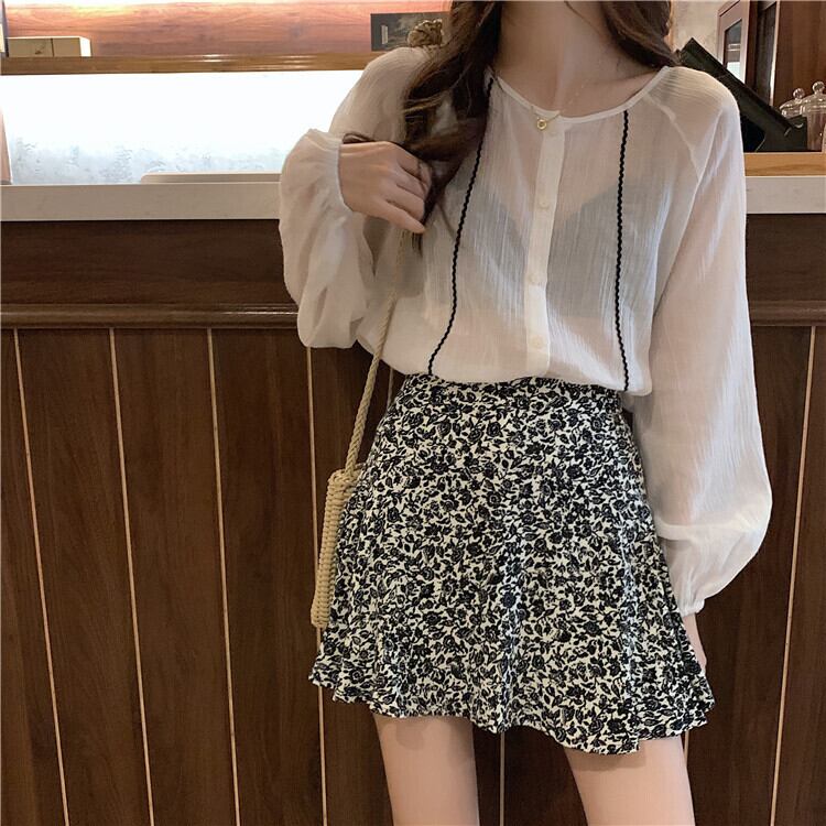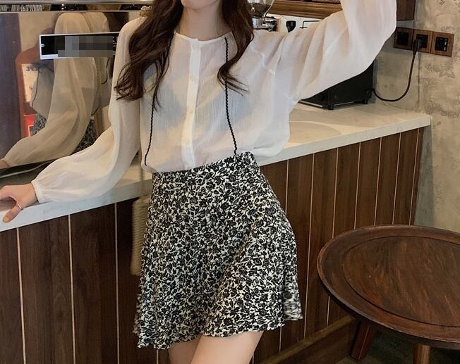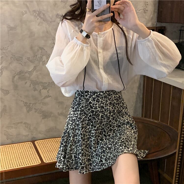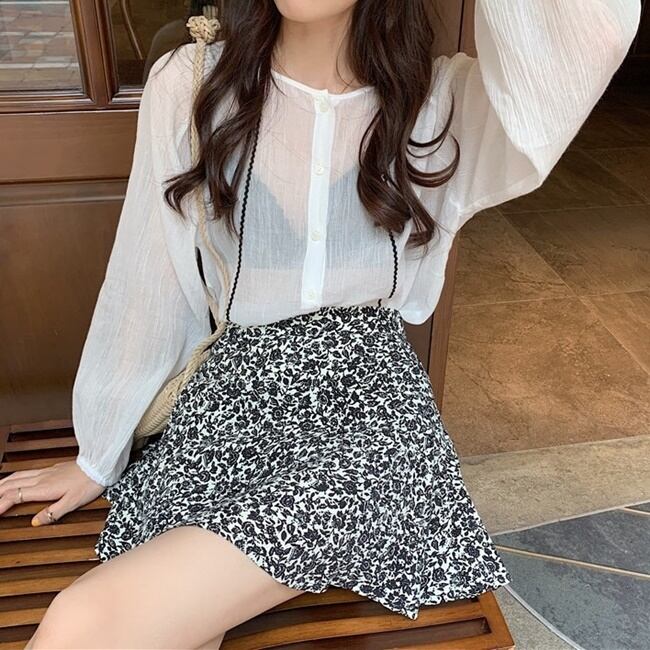 全2種 ブラウス シャツ シースルー 長袖 ランタンスリーブ スカート ノーカラー フロントボタン ミニ丈 フレア Aライン 花柄 可愛い ハイウエスト お出かけ カジュアル デート デイリー 韓国ファッション 夏 秋