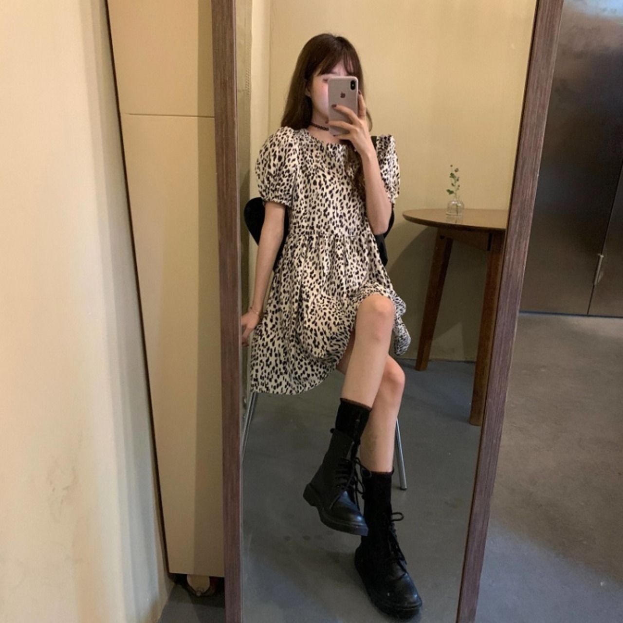ワンピース ヒョウ柄 レオパード ミニ丈 半袖 パフスリーブ ラウンドネック フレアスカート ゆったり ハイウエスト カジュアル かわいい フェミニン シンプル レトロ お出かけ デート お呼ばれ デイリー 普段着 夏