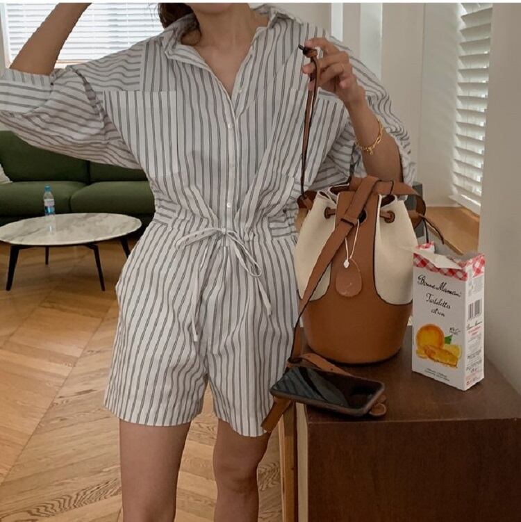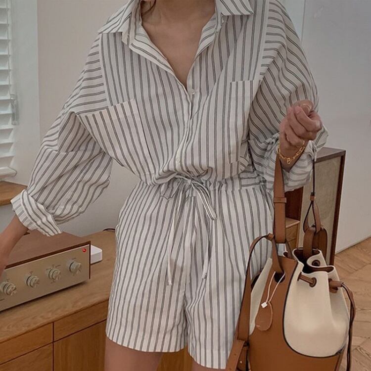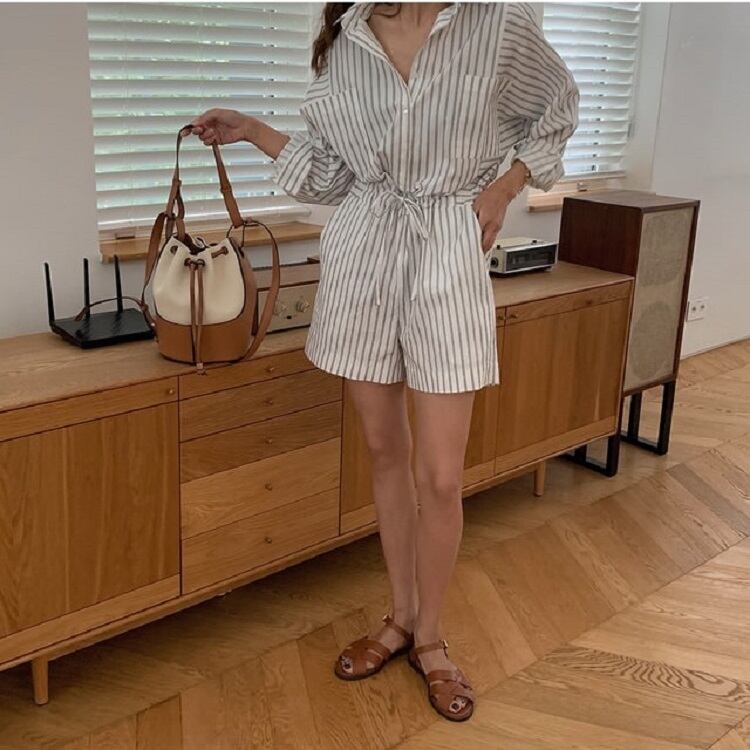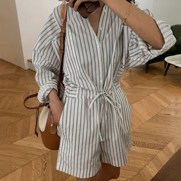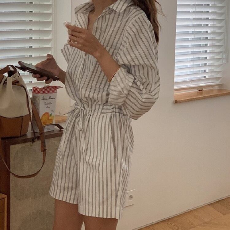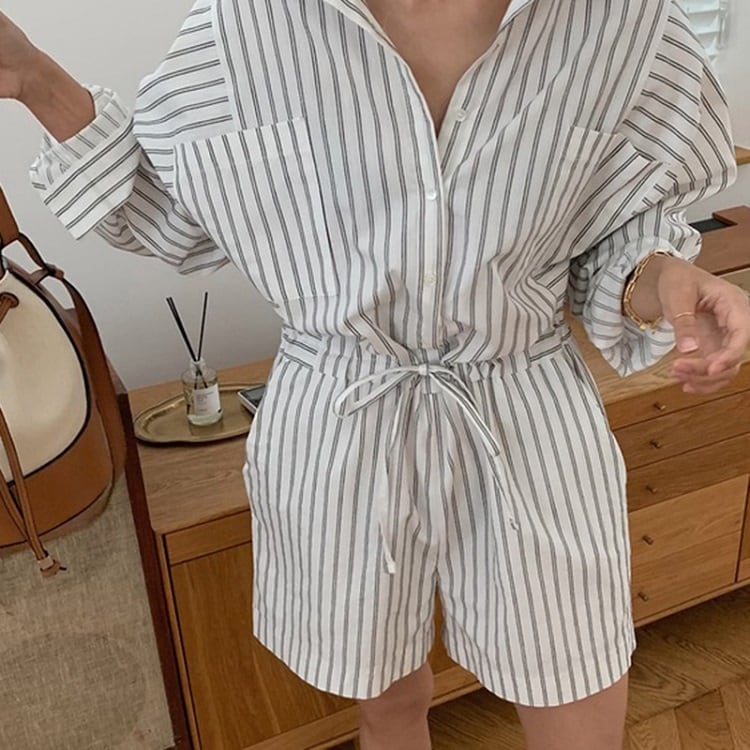 ジャンプスーツ オールインワン ショートパンツ シャツ ウエストリボン 長袖 ゆったり カジュアル かわいい シンプル レトロ お出かけ デート お呼ばれ デイリー 普段着 ストライプ 夏