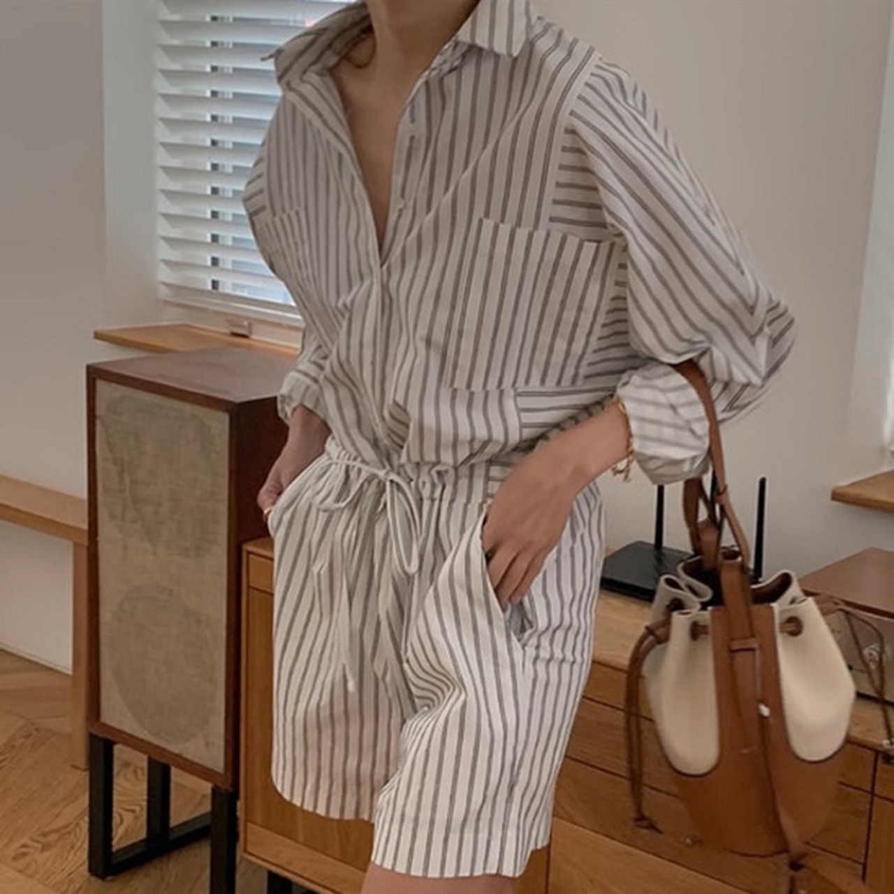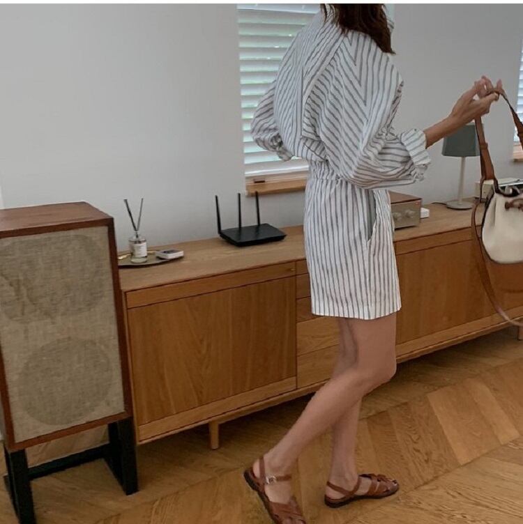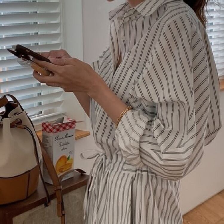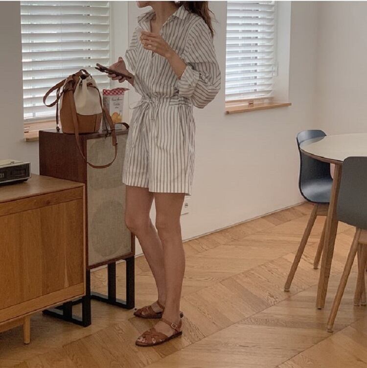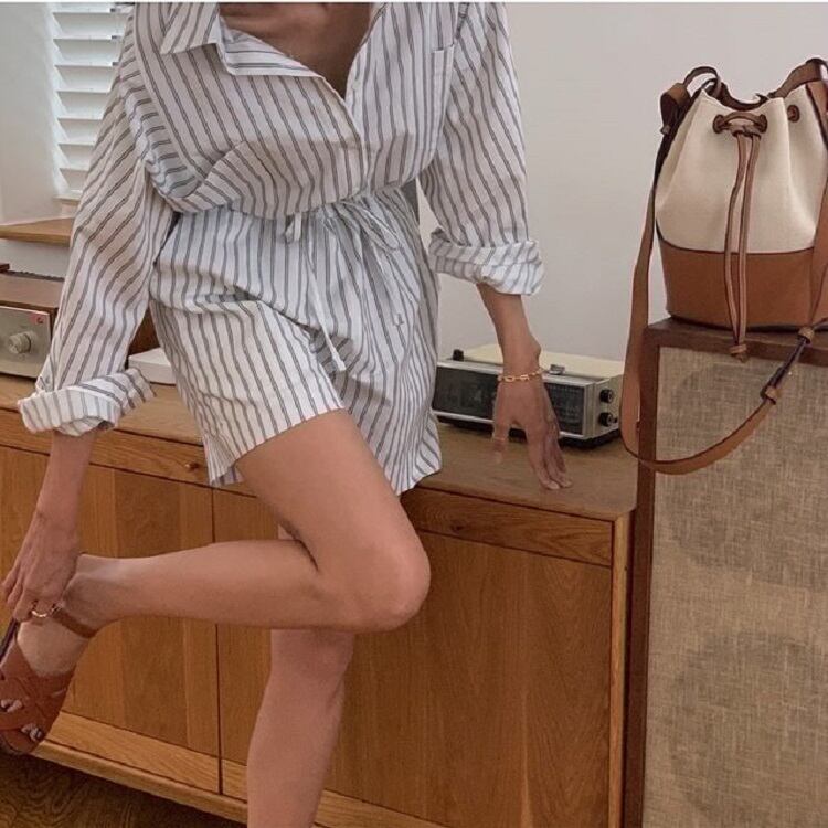 ジャンプスーツ オールインワン ショートパンツ シャツ ウエストリボン 長袖 ゆったり カジュアル かわいい シンプル レトロ お出かけ デート お呼ばれ デイリー 普段着 ストライプ 夏