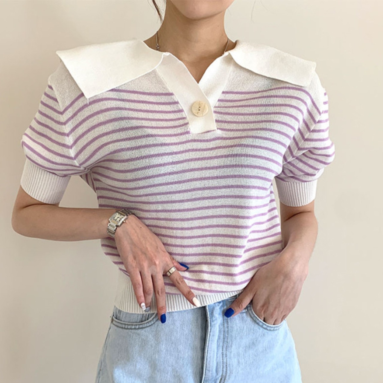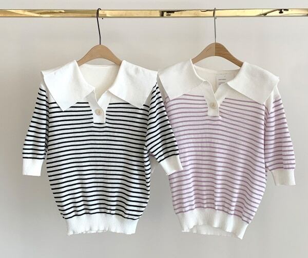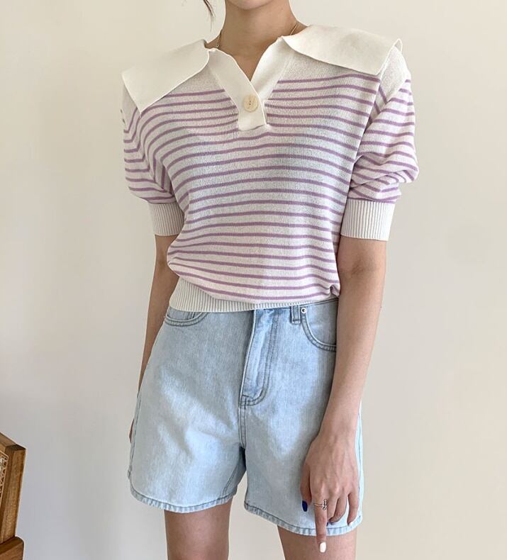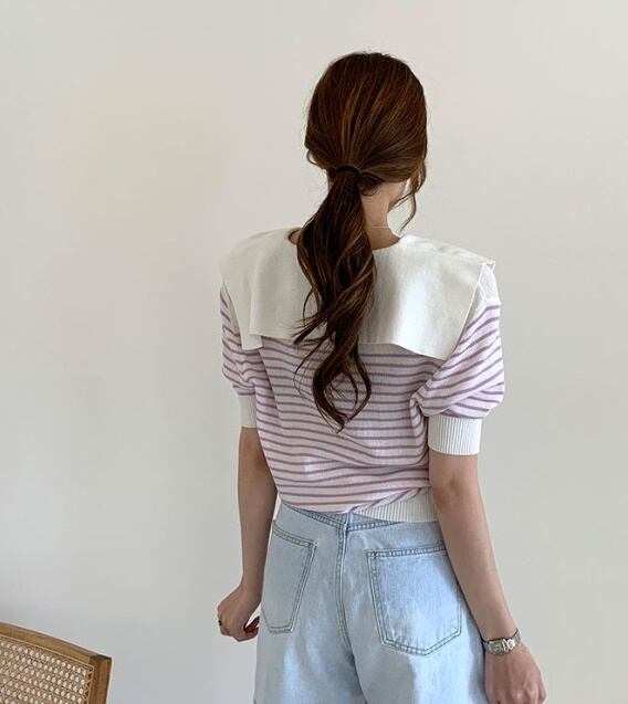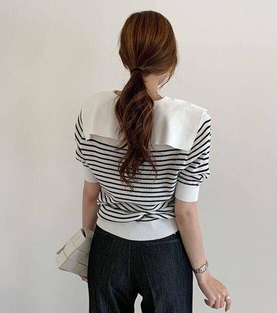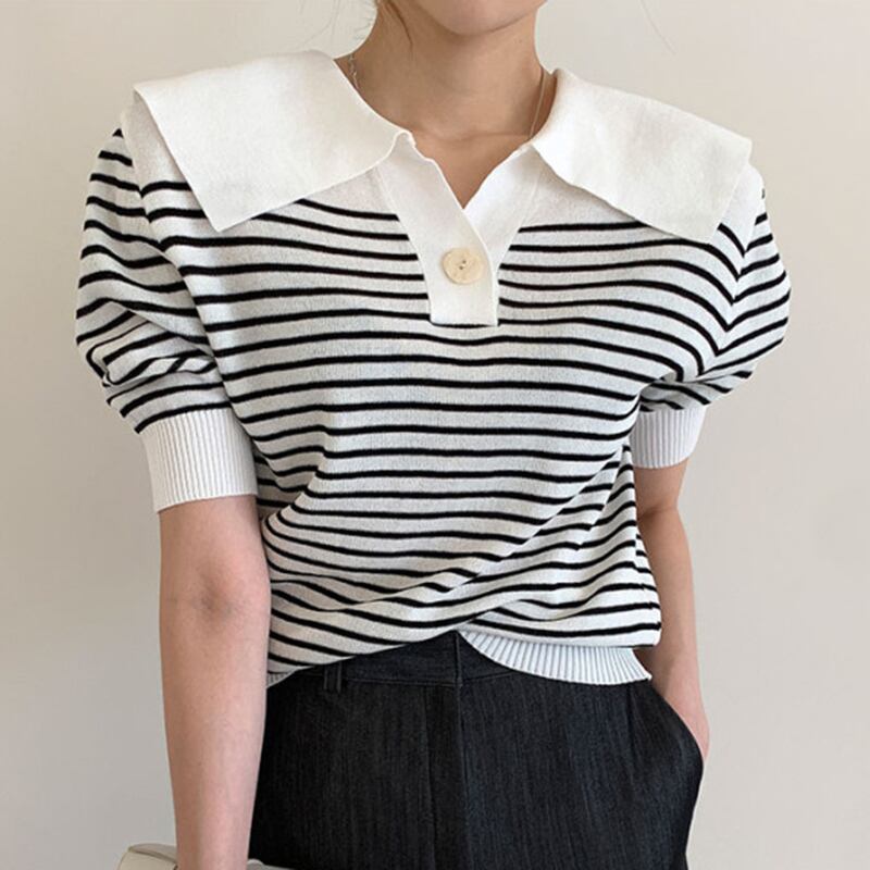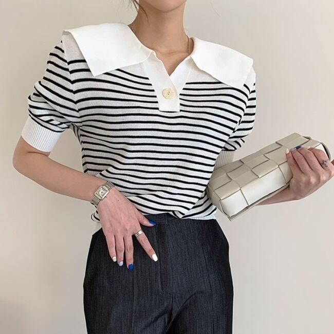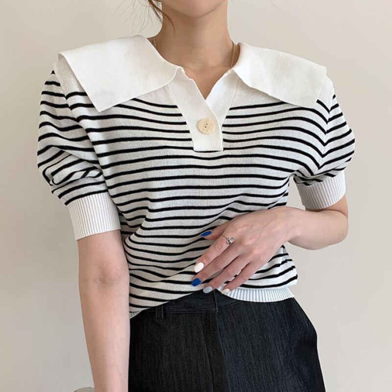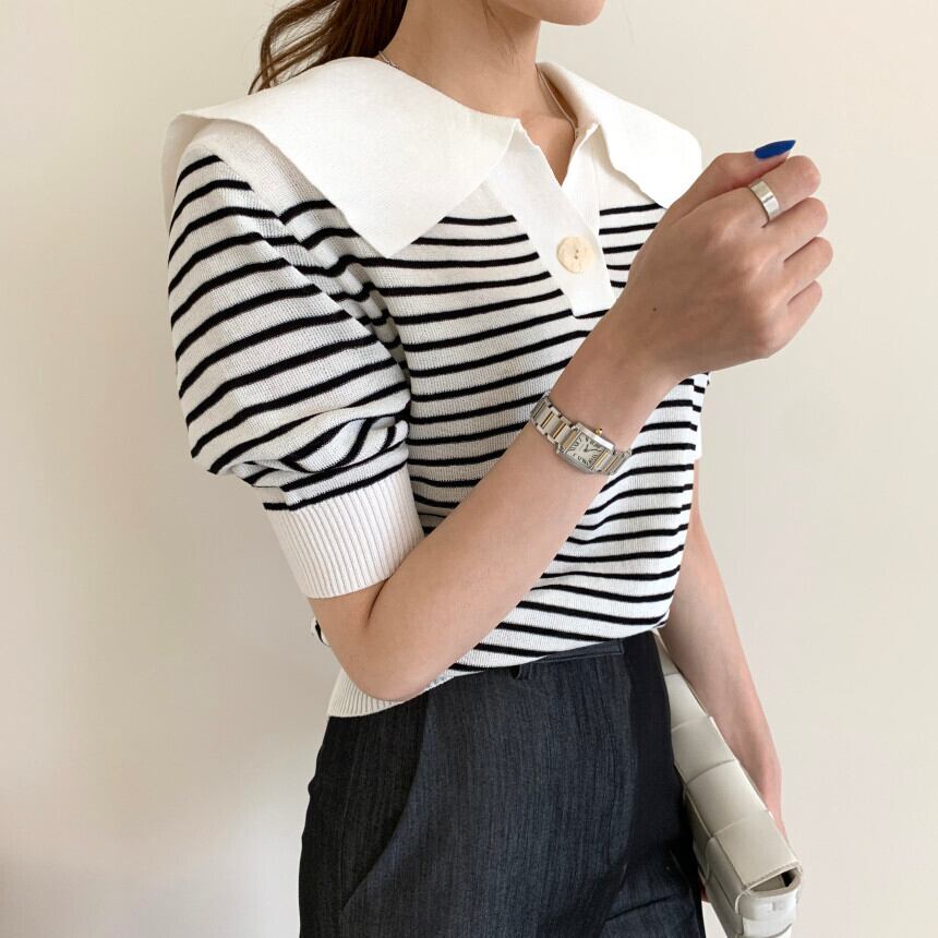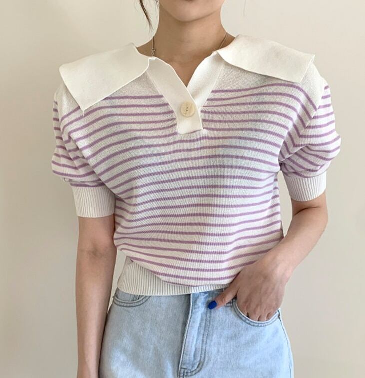 全2色 トップス ブラウス プルオーバー ニット ボーダー Vネック ボタン パフスリーブ 半袖 セーター セーラーカラー カジュアル デイリー お出かけ デート 大人可愛い 夏 秋