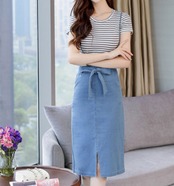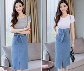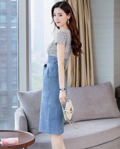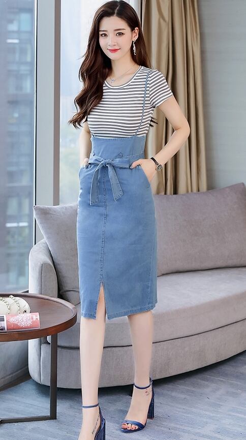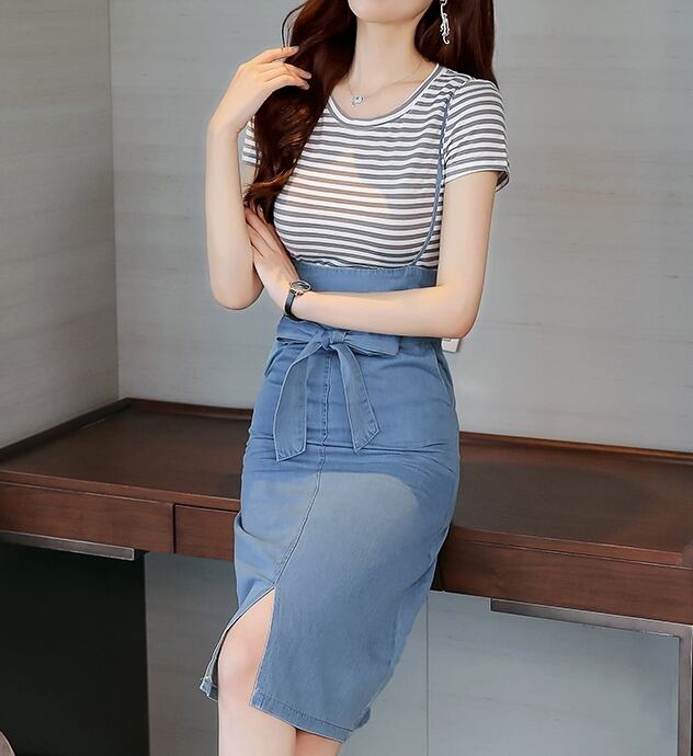 全2色 セットアップ ツーピース サロペットスカート Tシャツセット ボーダー サスペンダースカート ウエストリボン タイト デニムスカート スリム フロントスリット 半袖 カジュアル デイリー デート お出かけ 夏