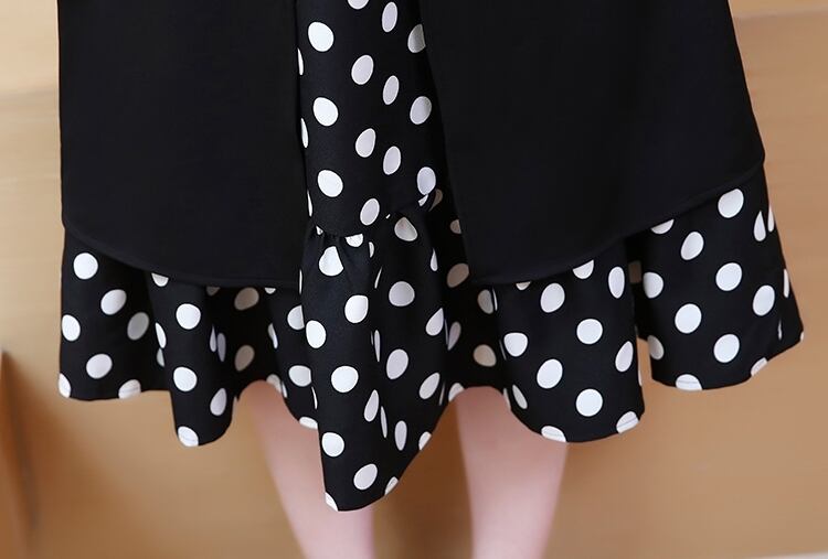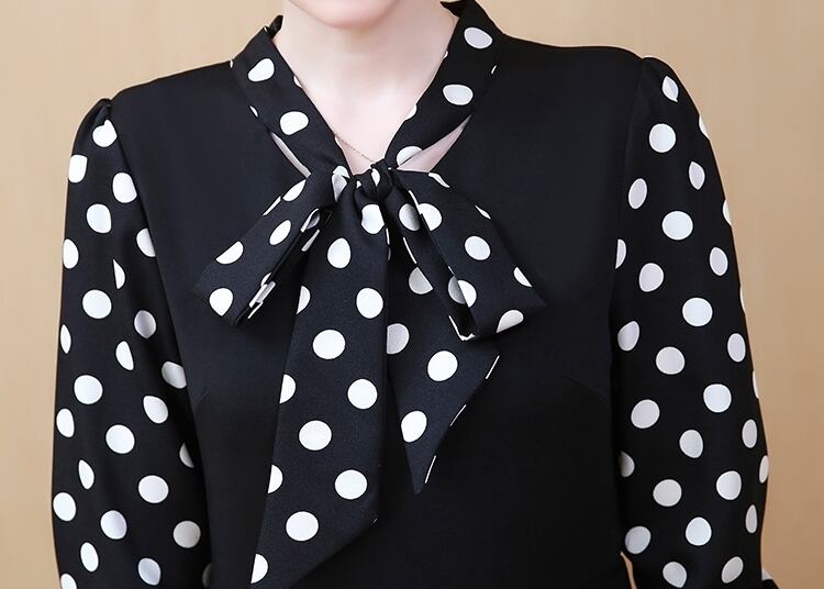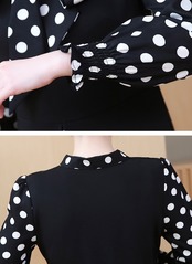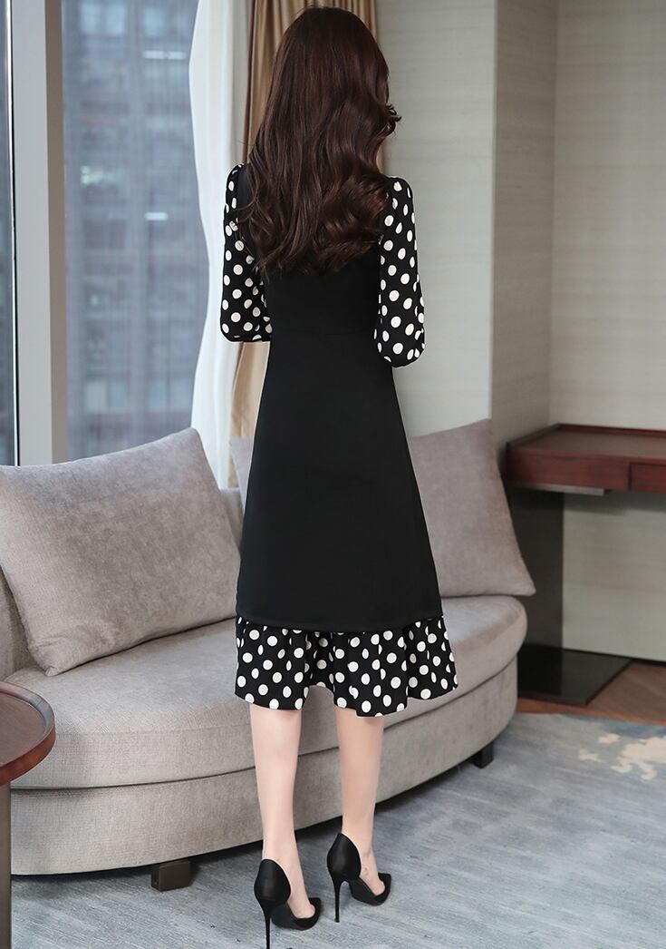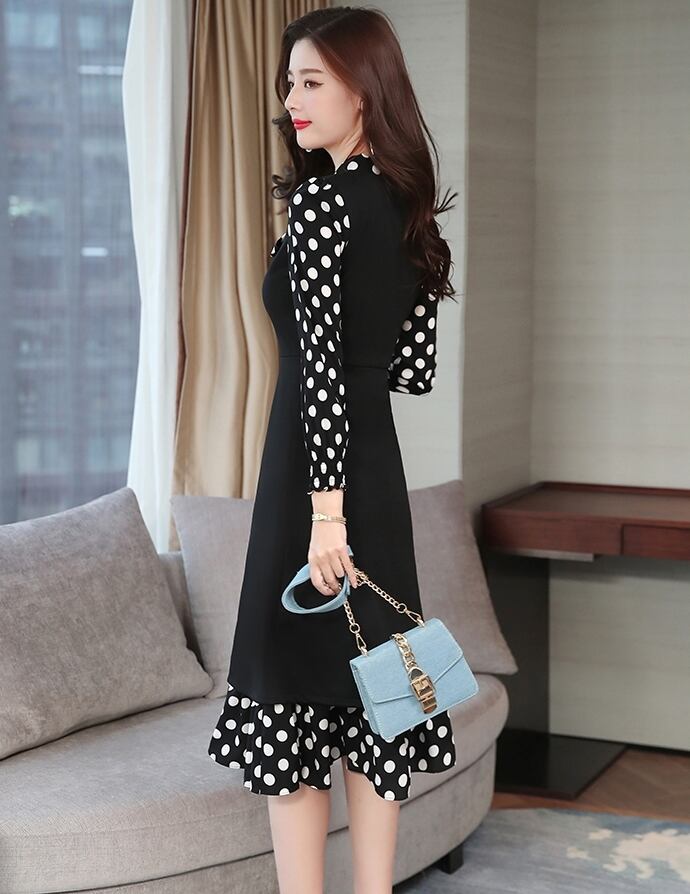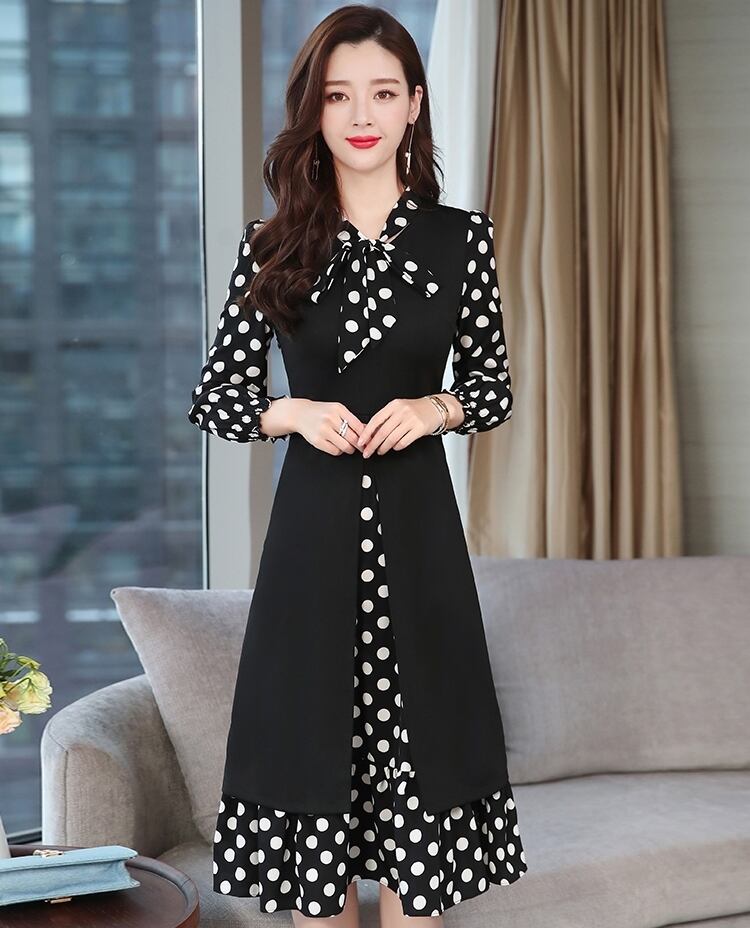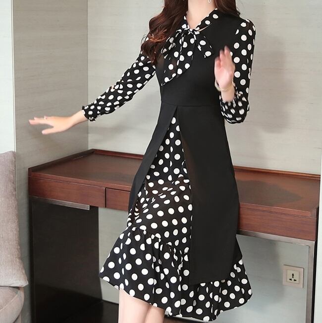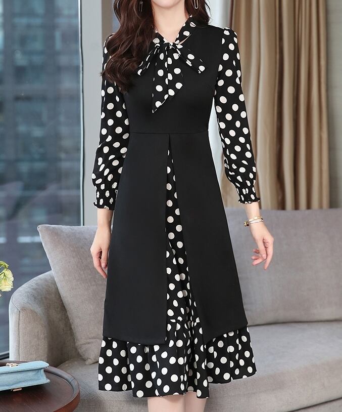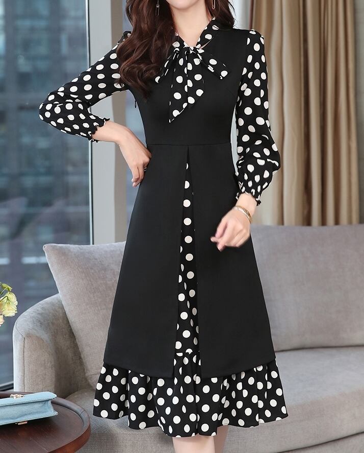 ワンピース ドレス ドット柄 長袖 フェイクツーピース ボウタイネック リボン フレア ミモレ丈 Aライン 上品 大人 カジュアル 女子会 きれいめ お出かけ シック 秋 冬