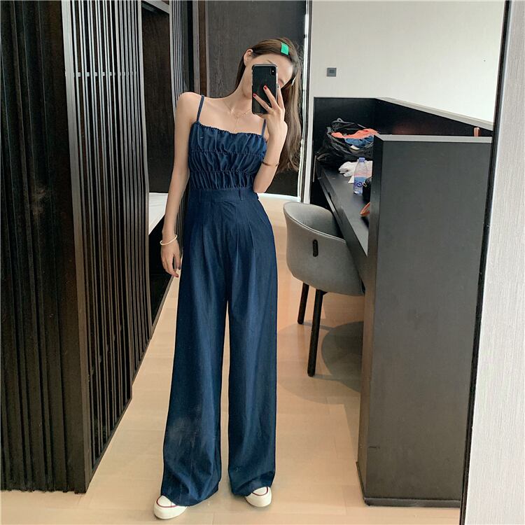 ジャンプスーツ オーバーオール サロペット デニム ハイウエスト ノースリーブ ロング丈 ワイドレッグパンツ カジュアル 大人可愛い ガーリー シンプル 夏 お出かけ リゾート 女子会 買い物