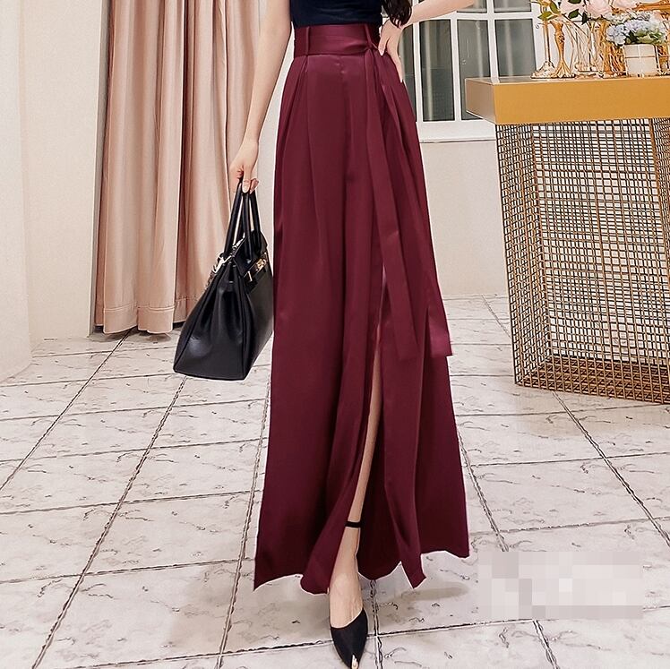 ワイドパンツ ハイウエスト ウエストリボン サイドスリット Aライン シック 上品 エレガント 光沢 カジュアル 大人 ワイトレッグ ゆったり きれいめ デート 女子会 秋 冬
