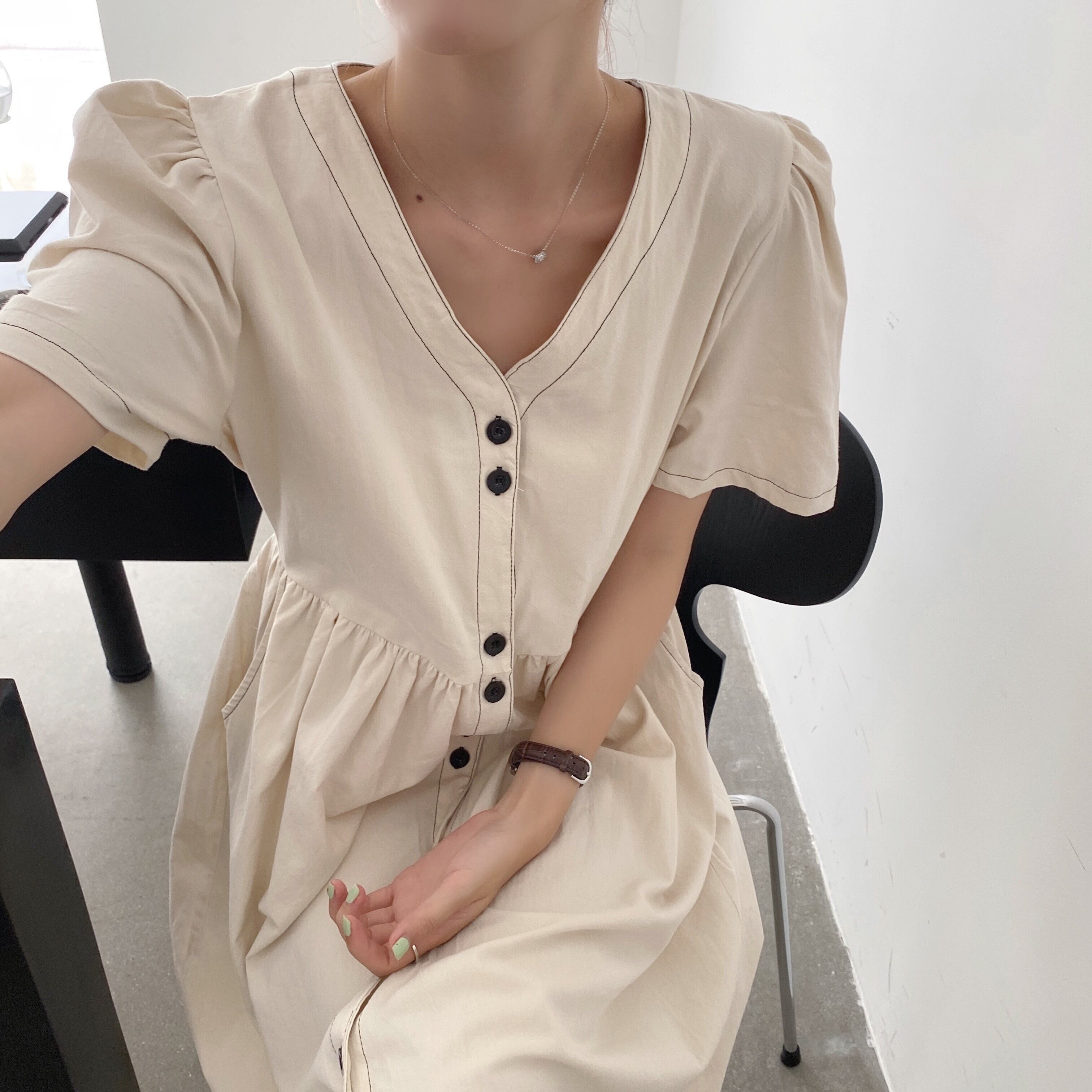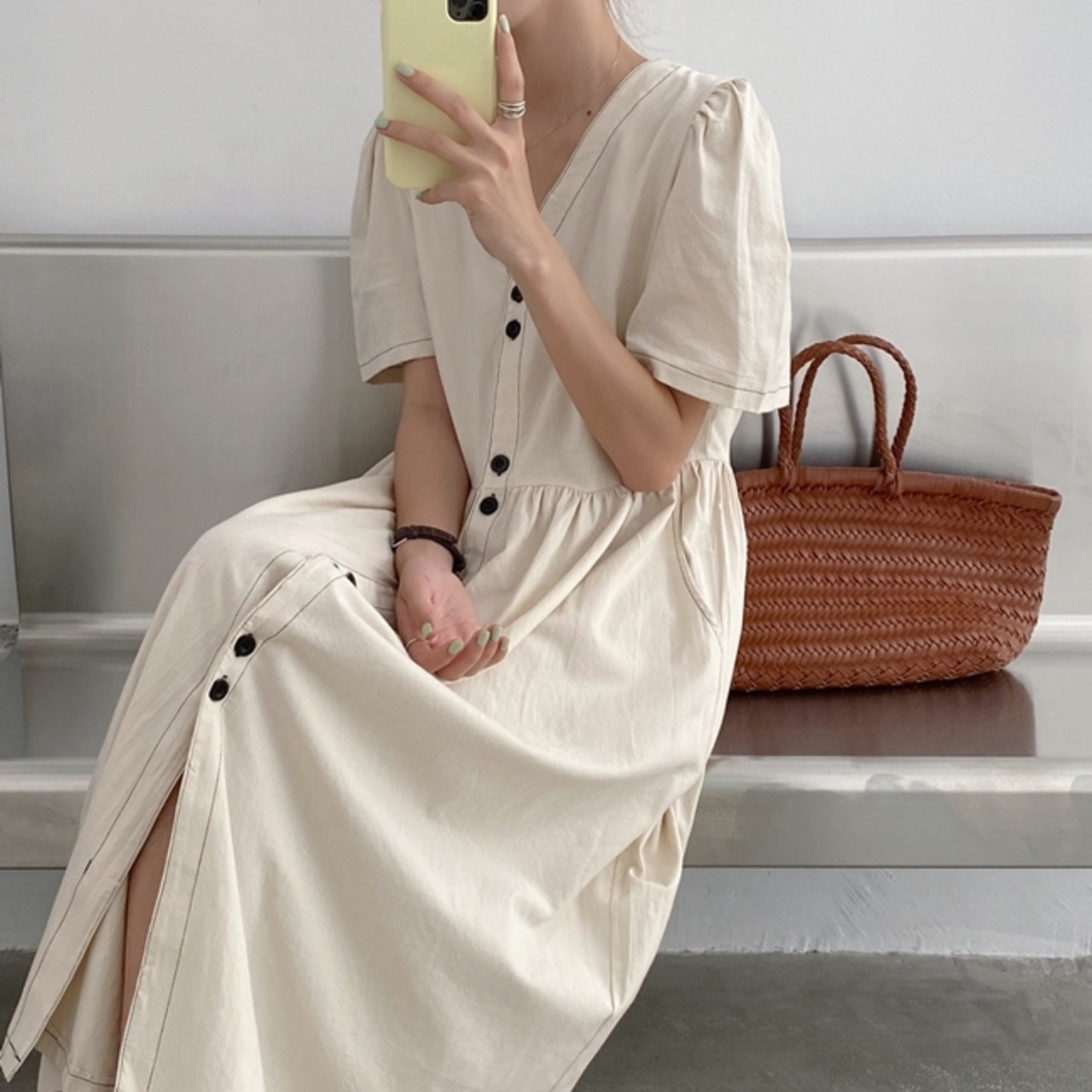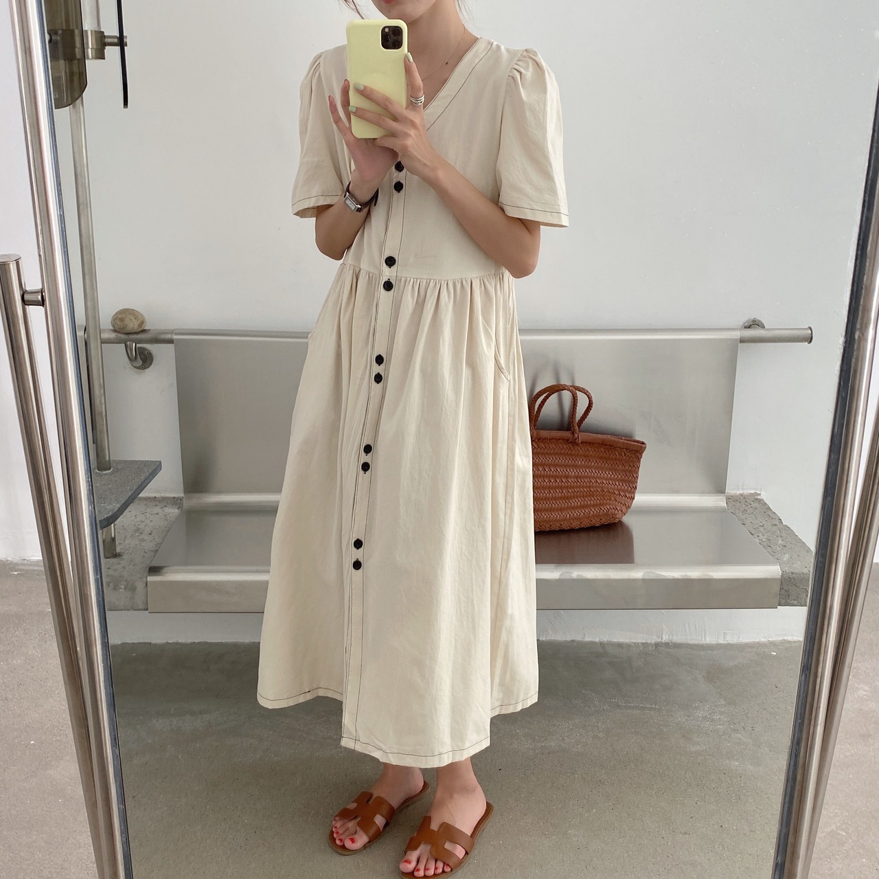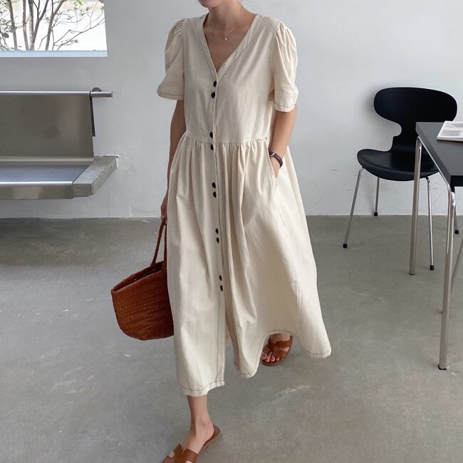 ワンピース ロング丈 フロントボタン フレア Vネック 半袖 ゆったり 大人 カジュアル デイリー シンプル お出かけ Aライン リゾート レトロ 夏