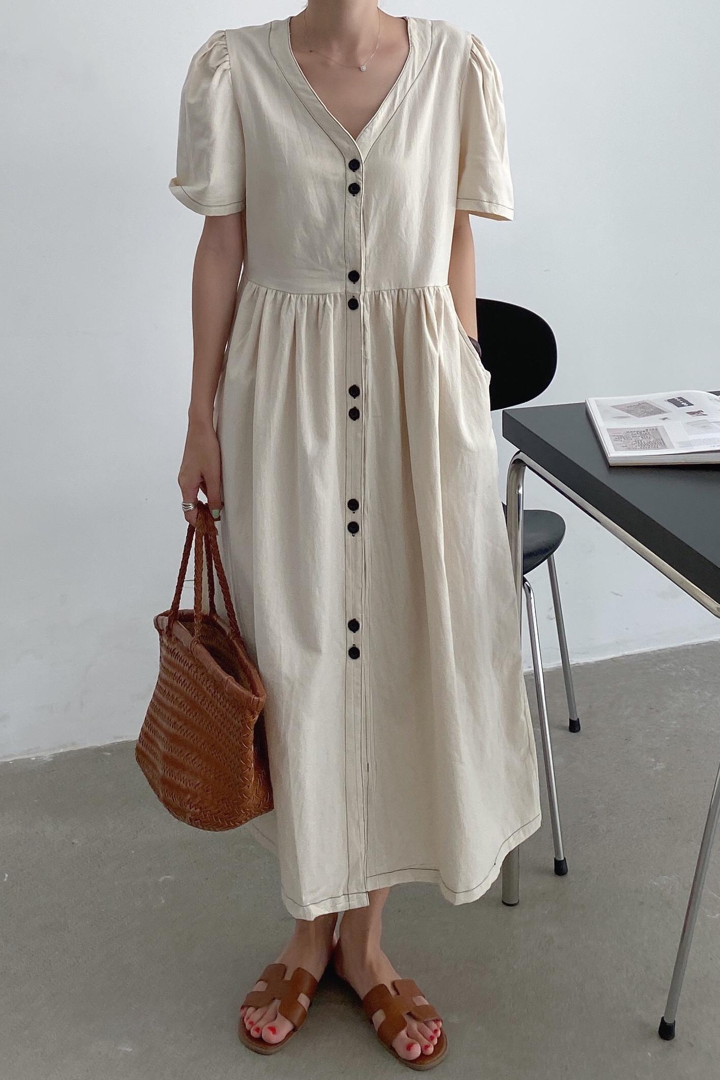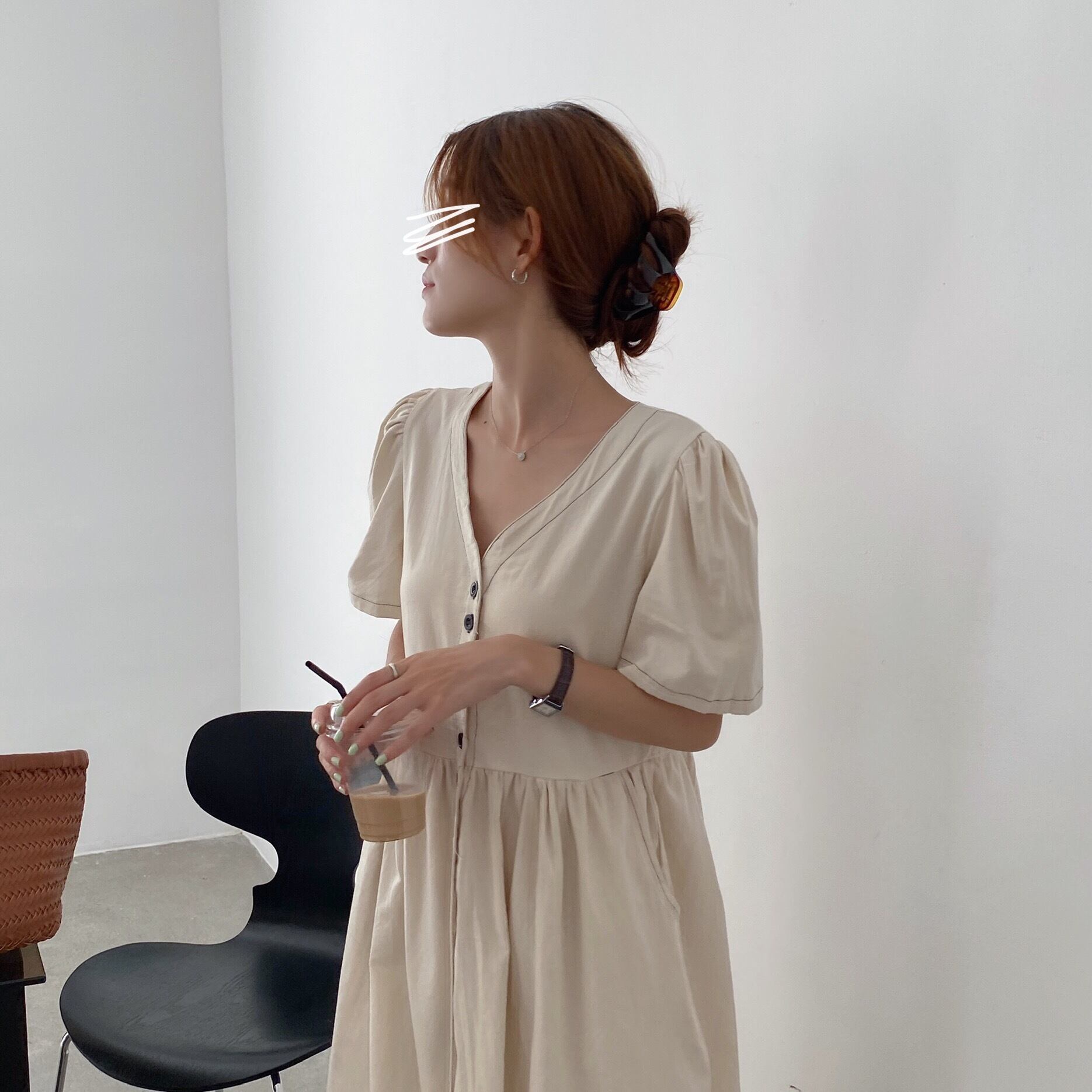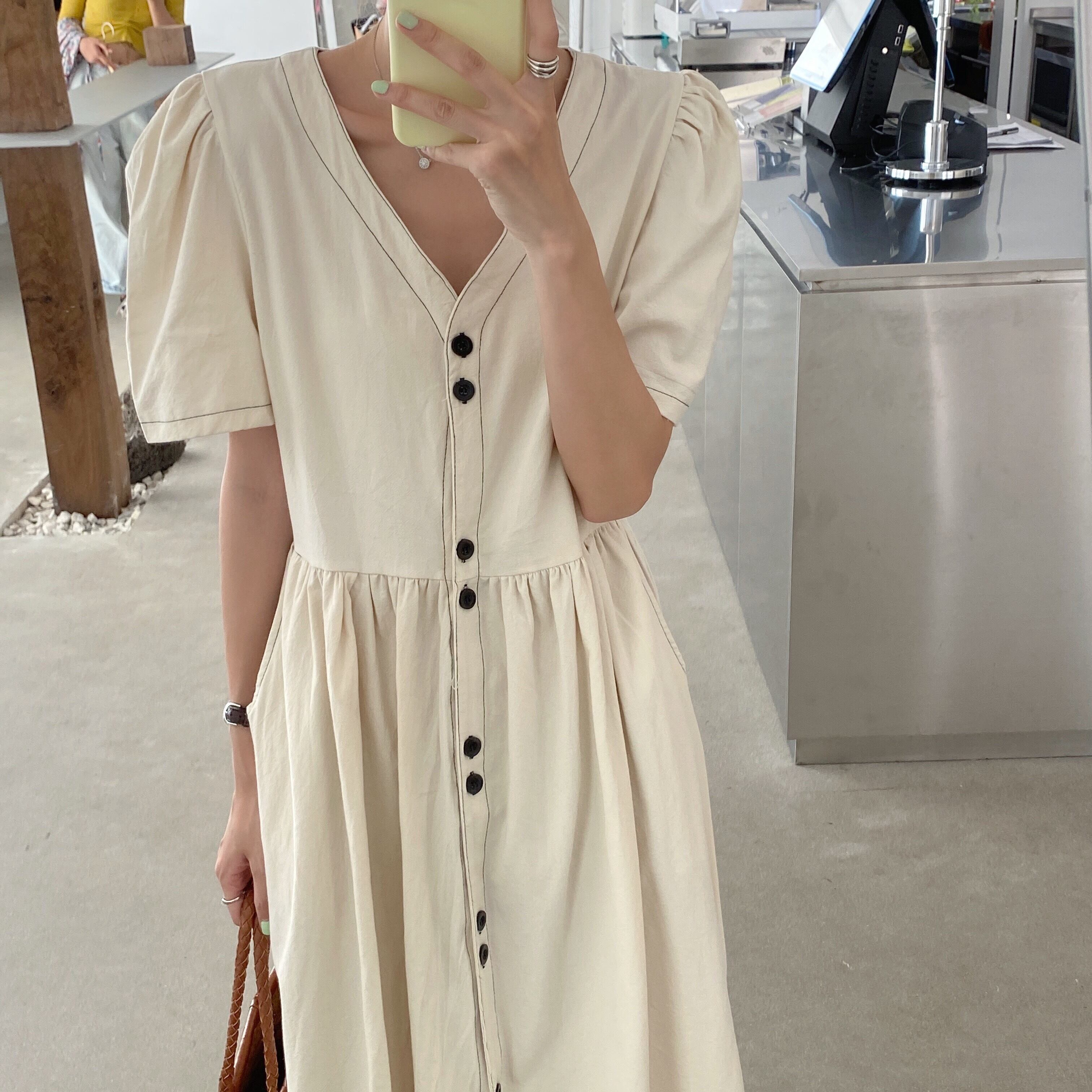 ワンピース ロング丈 フロントボタン フレア Vネック 半袖 ゆったり 大人 カジュアル デイリー シンプル お出かけ Aライン リゾート レトロ 夏