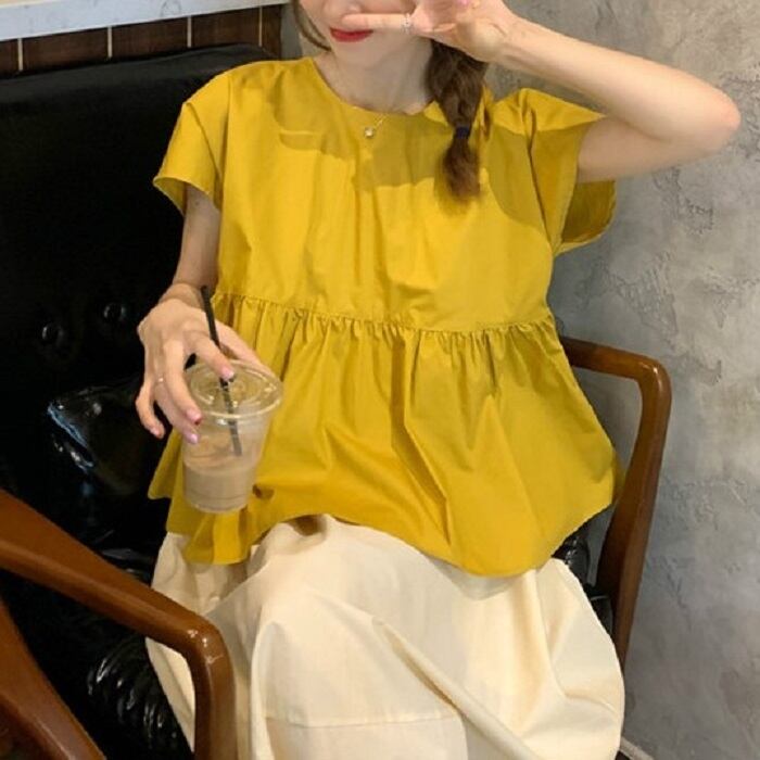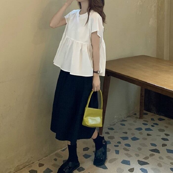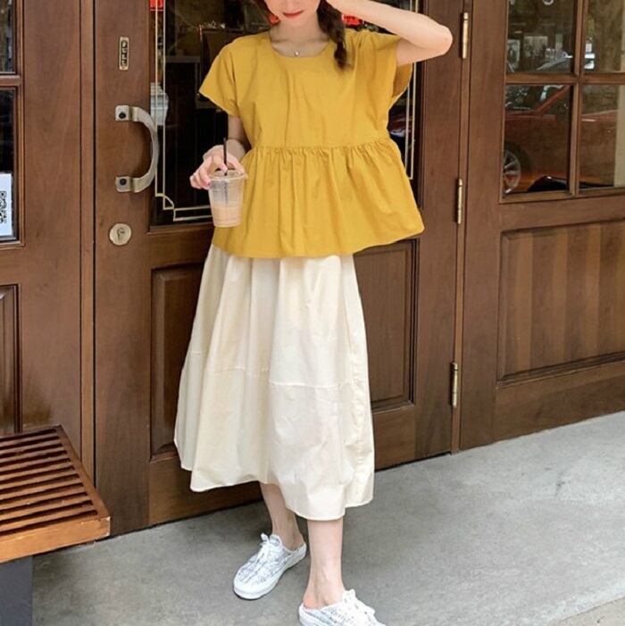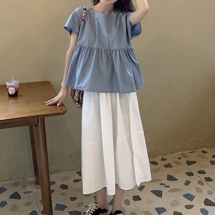 ギャザーの切替えが可愛らしいブラウスとゆったりシルエットのひざ丈スカート。