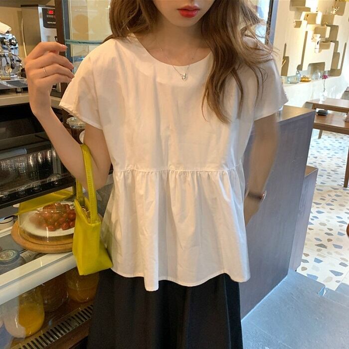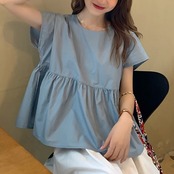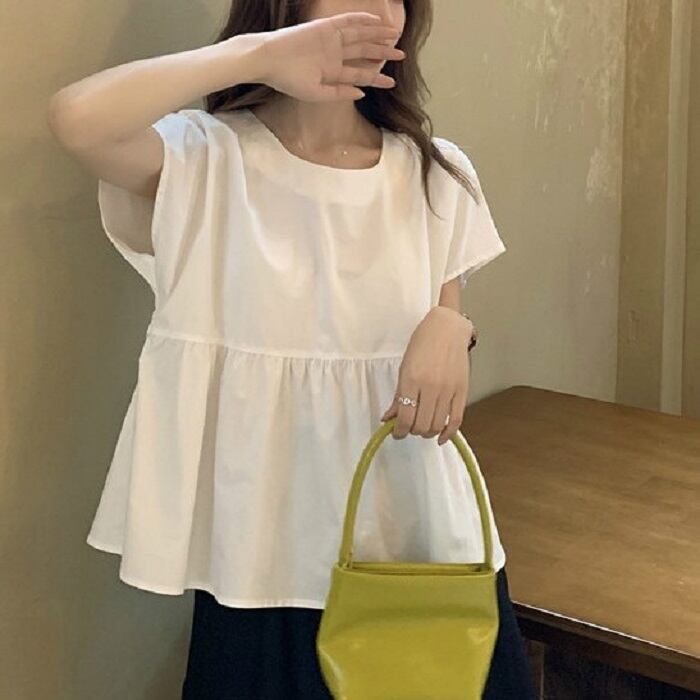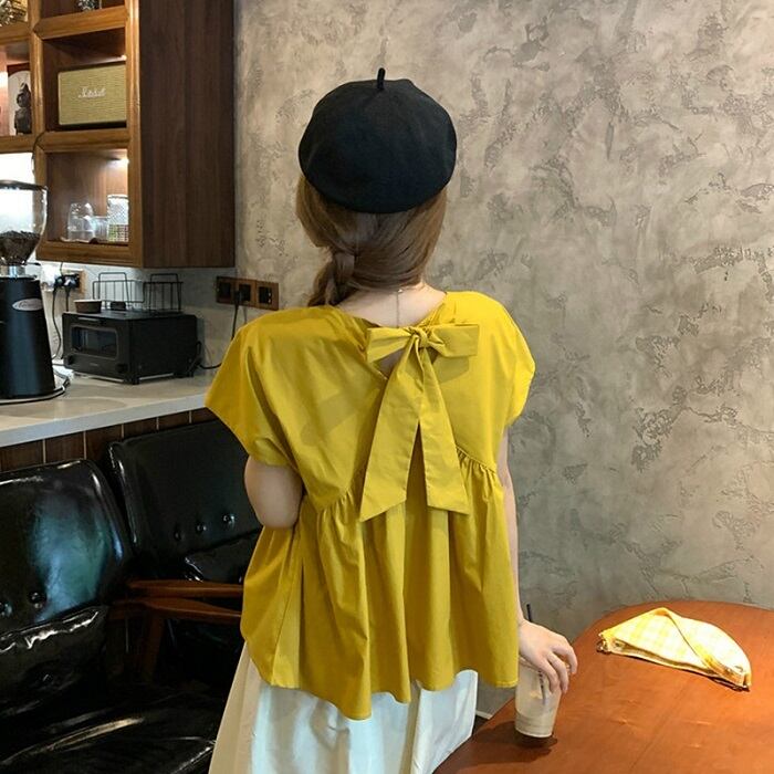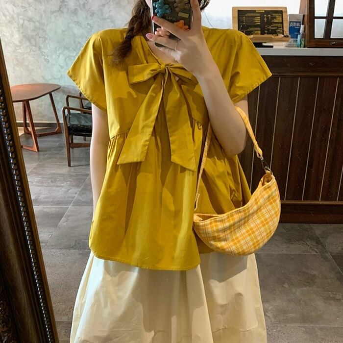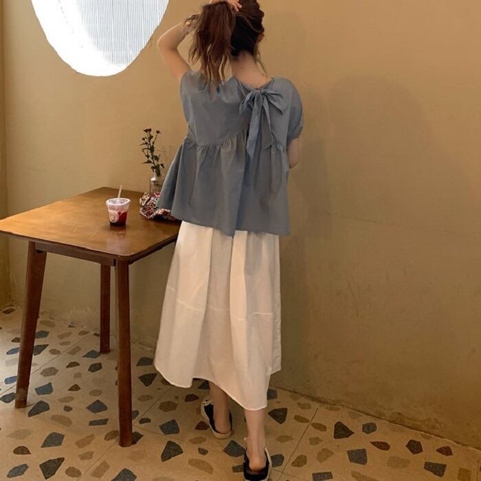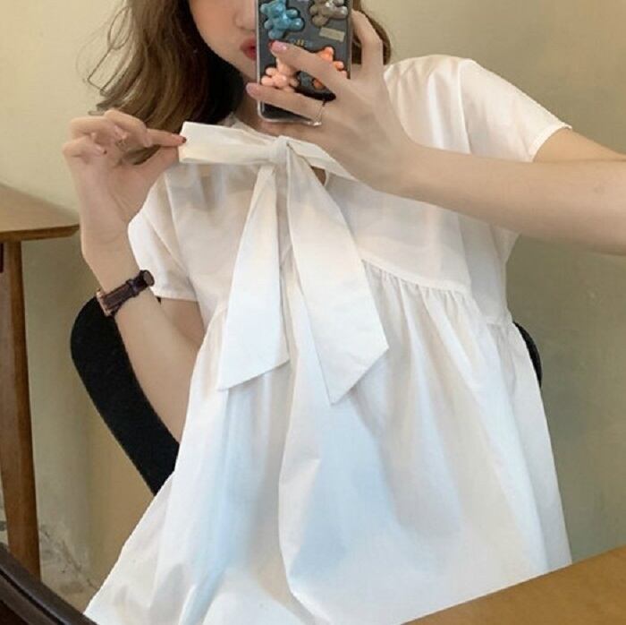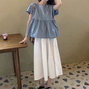 全2種3色 ブラウス トップス リボン フレンチスリーブ ゆったり 体型カバー 2WAY スカート フレアスカート ひざ丈 ミディ丈 きれいめ カジュアル かわいい ガーリー シンプル レトロ お出かけ デート お呼ばれ リゾート デイリー 普段着 夏