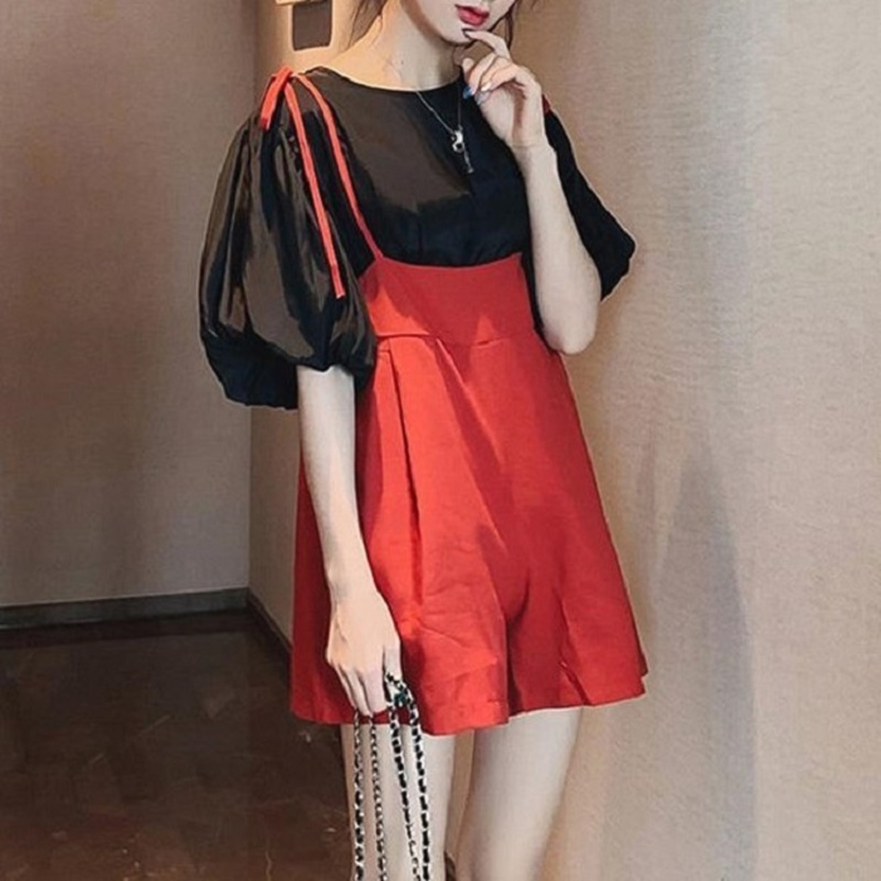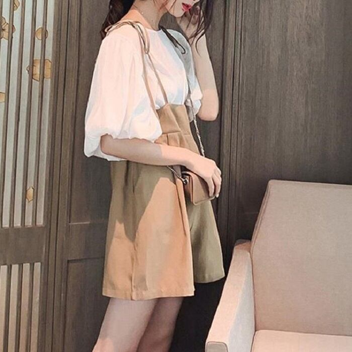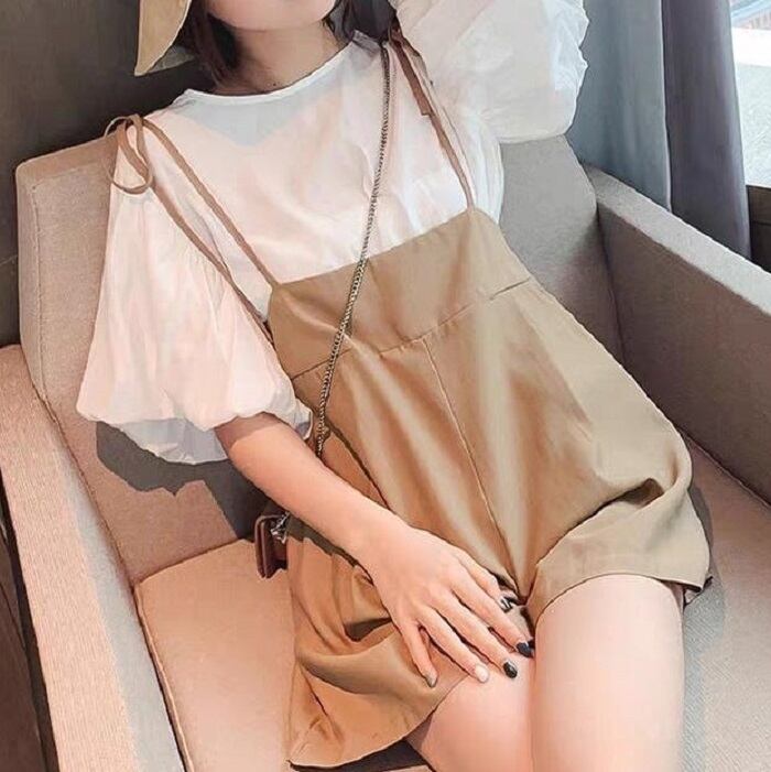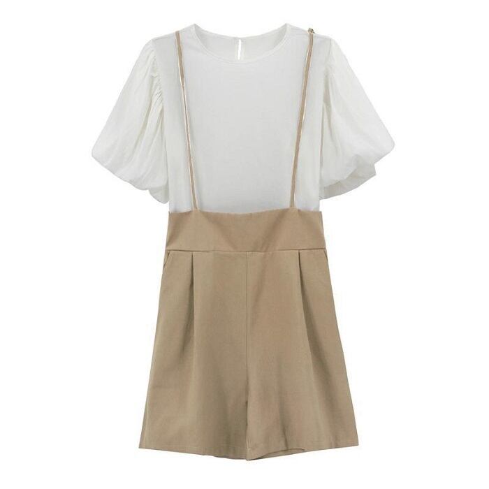 全2色 セットアップ 2点セット ブラウス トップス パフスリーブ ラウンドネック ゆったり 体型カバー ショートパンツ サスペンダーパンツ きれいめ カジュアル かわいい ガーリー シンプル レトロ お出かけ デート お呼ばれ リゾート デイリー 普段着 夏
