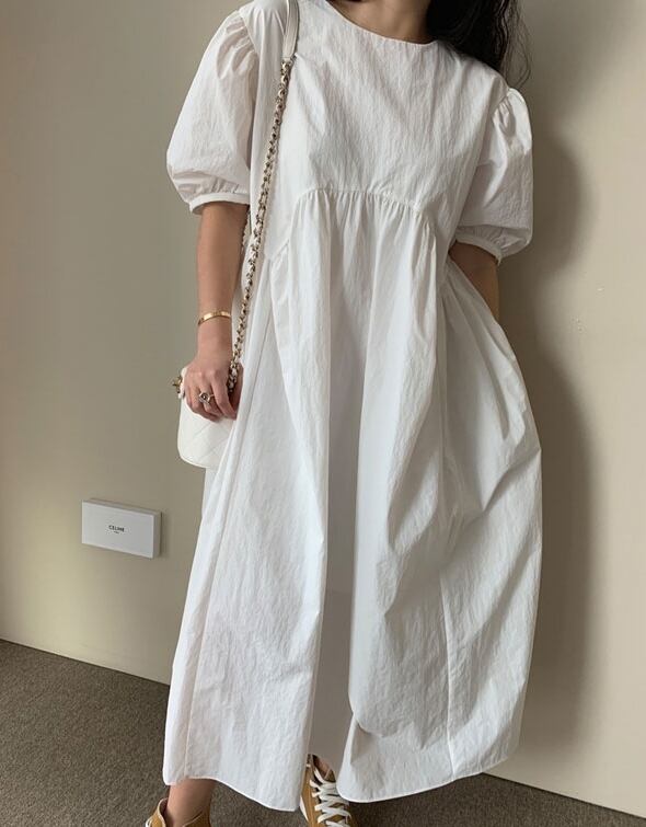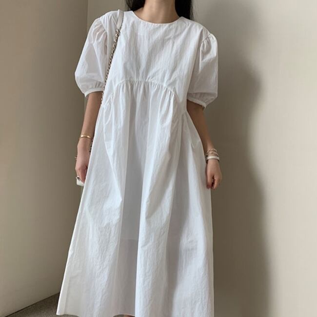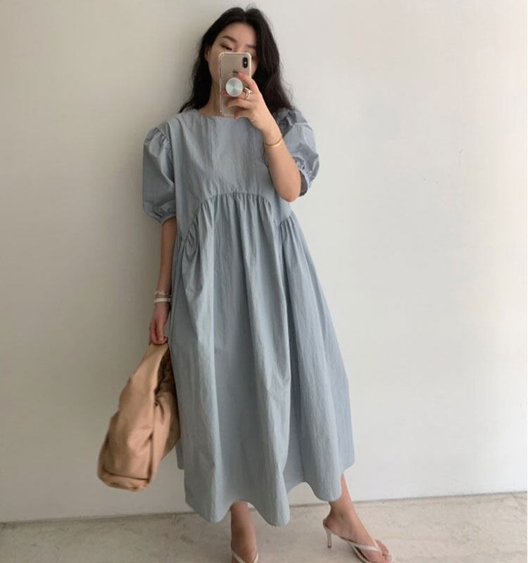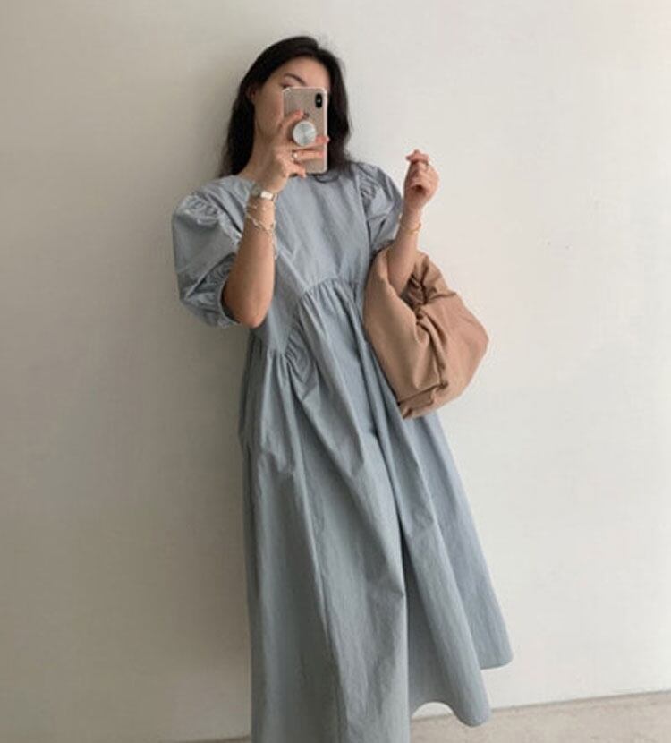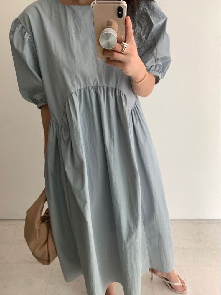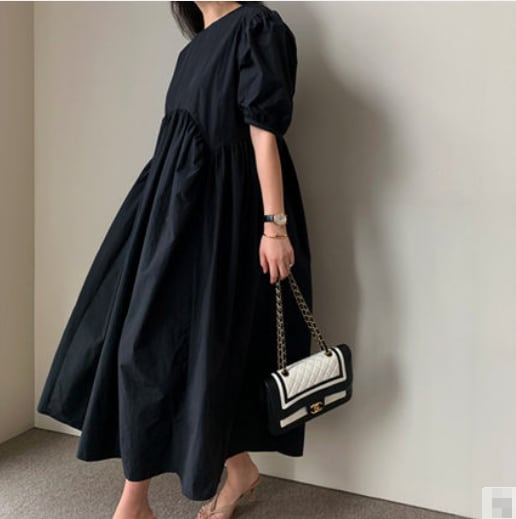 全3色 ワンピース ロング丈 ゆったり オーバーサイズ 5分袖 テント フレア 体型カバー パフスリーブ カジュアル 大人 お出かけ デート 韓国ファッション レトロ 夏 秋