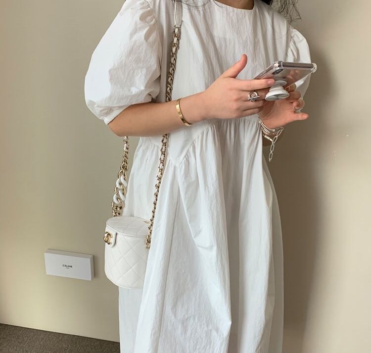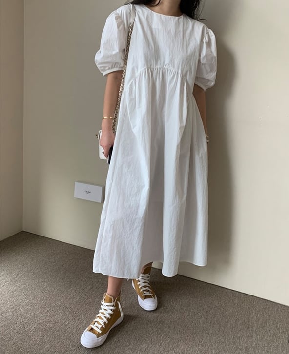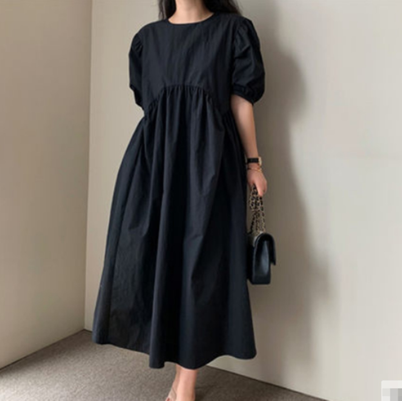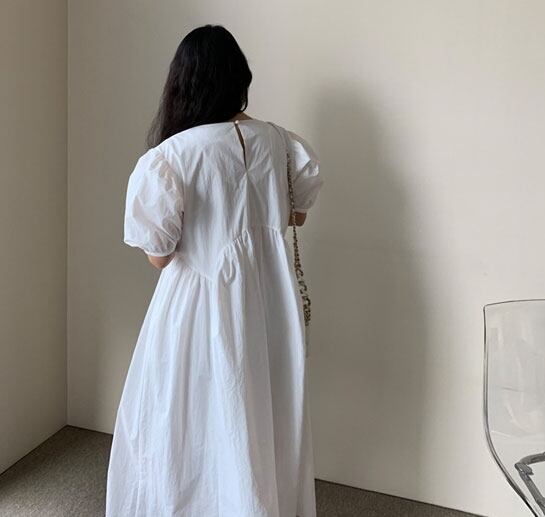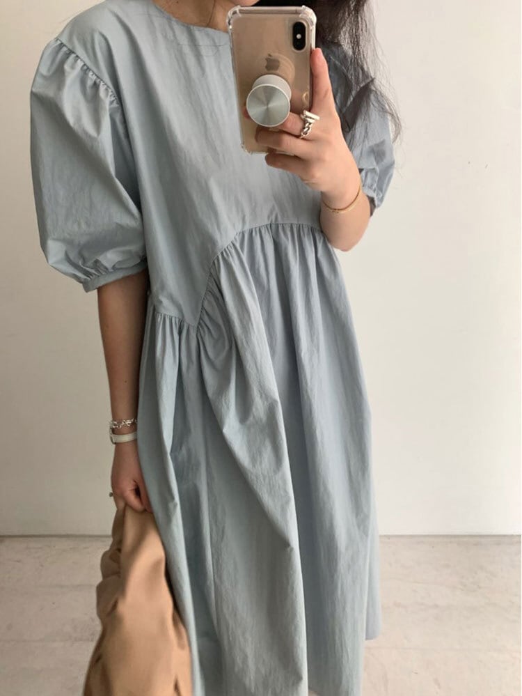 全3色 ワンピース ロング丈 ゆったり オーバーサイズ 5分袖 テント フレア 体型カバー パフスリーブ カジュアル 大人 お出かけ デート 韓国ファッション レトロ 夏 秋