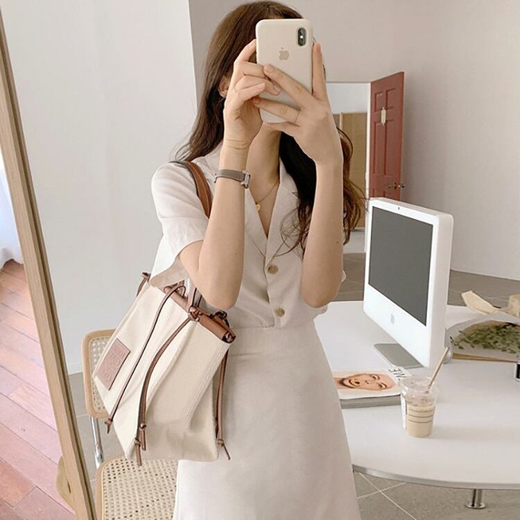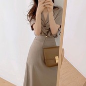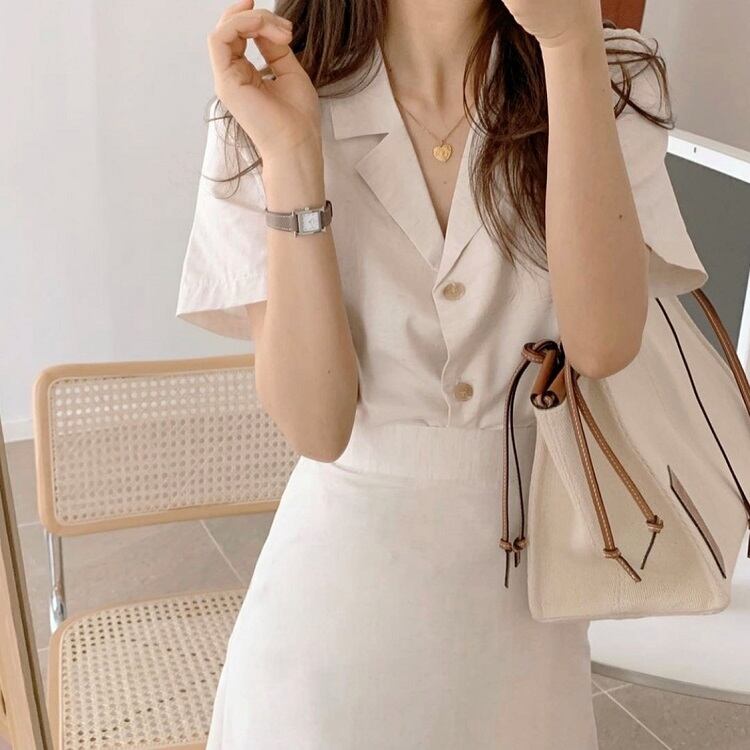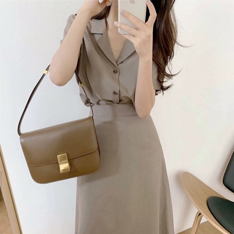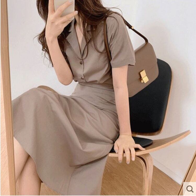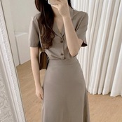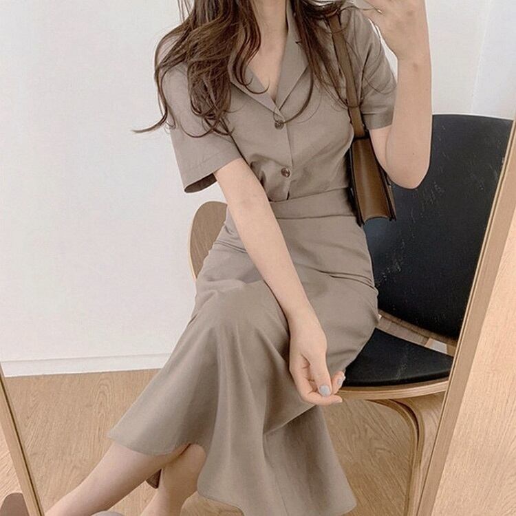 全2色 セットアップ ブラウススーツ 2点セット ツーピース 半袖 テーラーカラー ひざ下 ミディ丈 ロング丈 フレアスカート きれいめ カジュアル シンプル レトロ お出かけ デート お呼ばれ オフィス デイリー 普段着 夏 ブラウン ホワイト