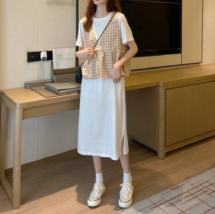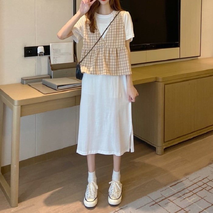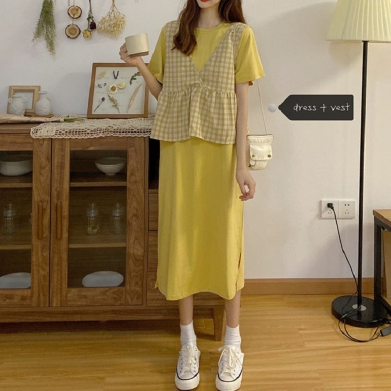 シンプルシルエットのワンピースとチェックベストのセットアップ。
