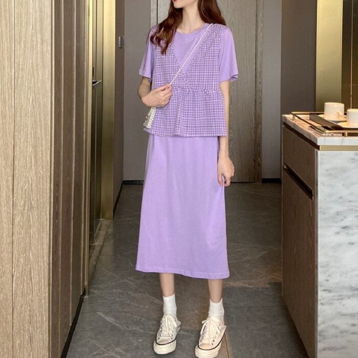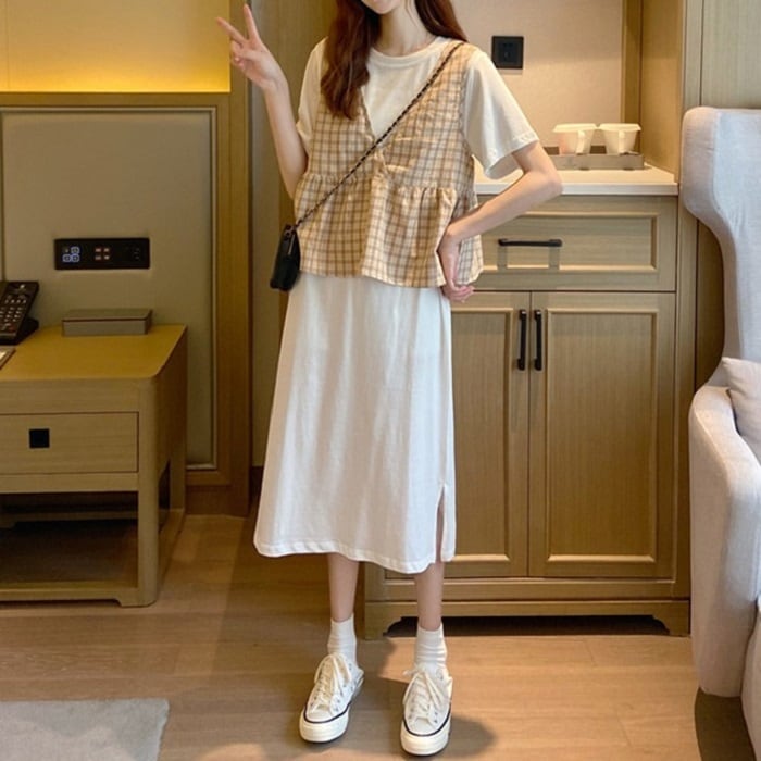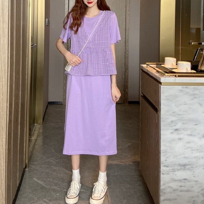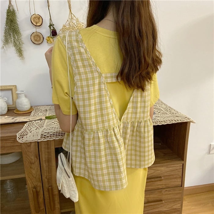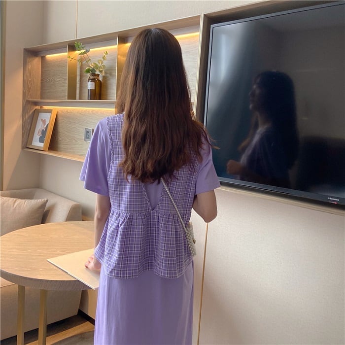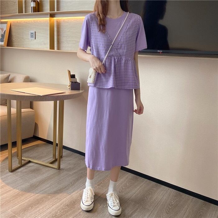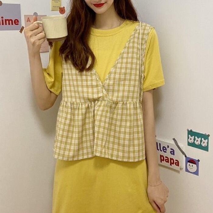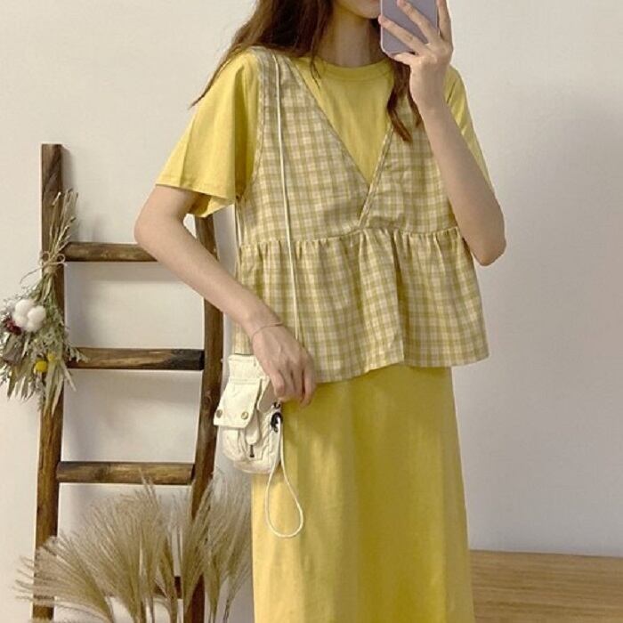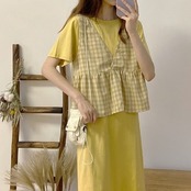 全3色 セットアップ 2点セット ワンピース ラウンドネック 半袖 ひざ丈 ミディ丈 ベスト チェック カジュアル シンプル レトロ ゆったり 体型カバー お出かけ デート デイリー 普段着 夏 カーキ パープル イエロー