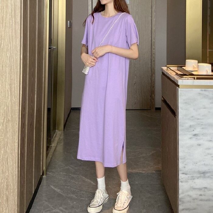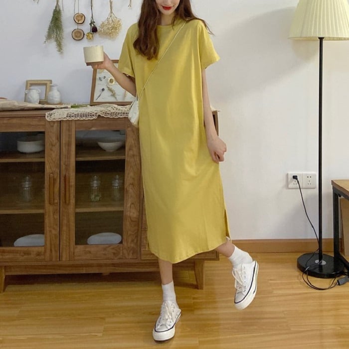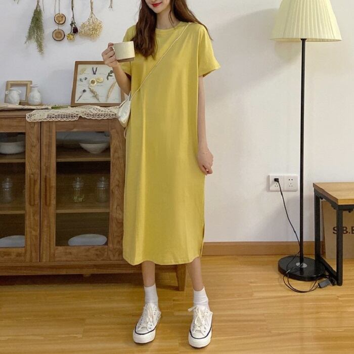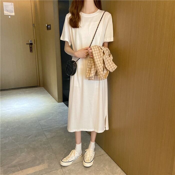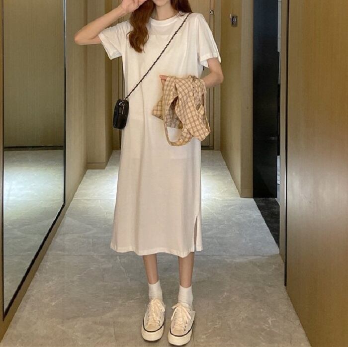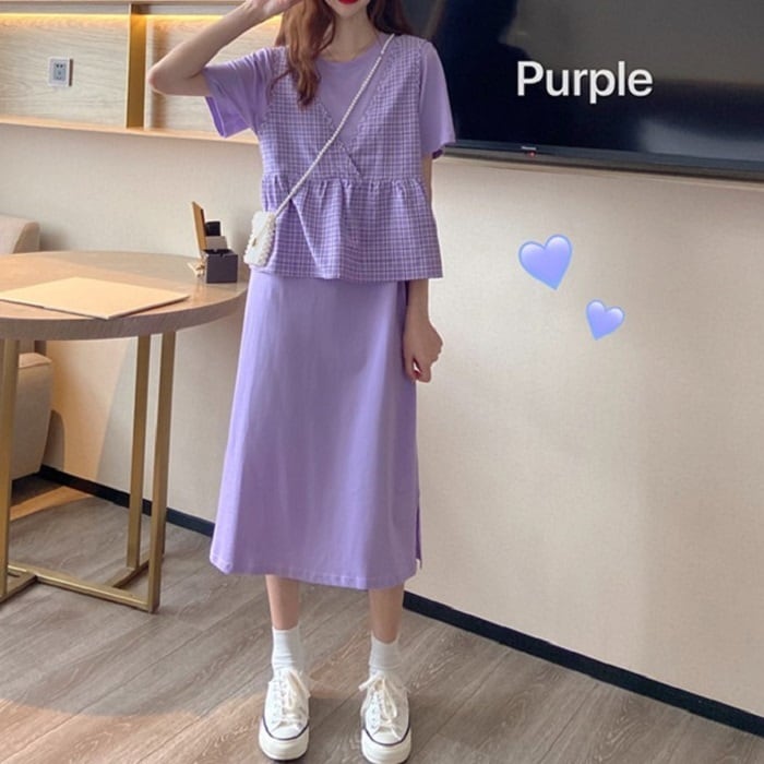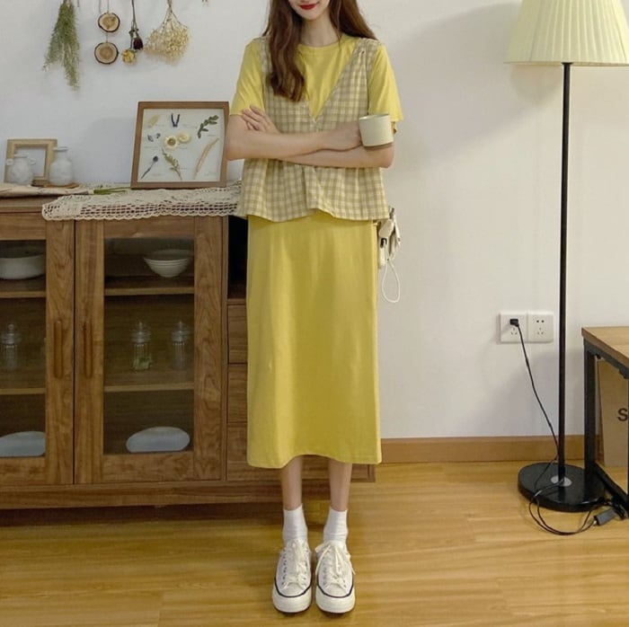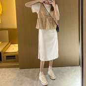 全3色 セットアップ 2点セット ワンピース ラウンドネック 半袖 ひざ丈 ミディ丈 ベスト チェック カジュアル シンプル レトロ ゆったり 体型カバー お出かけ デート デイリー 普段着 夏 カーキ パープル イエロー