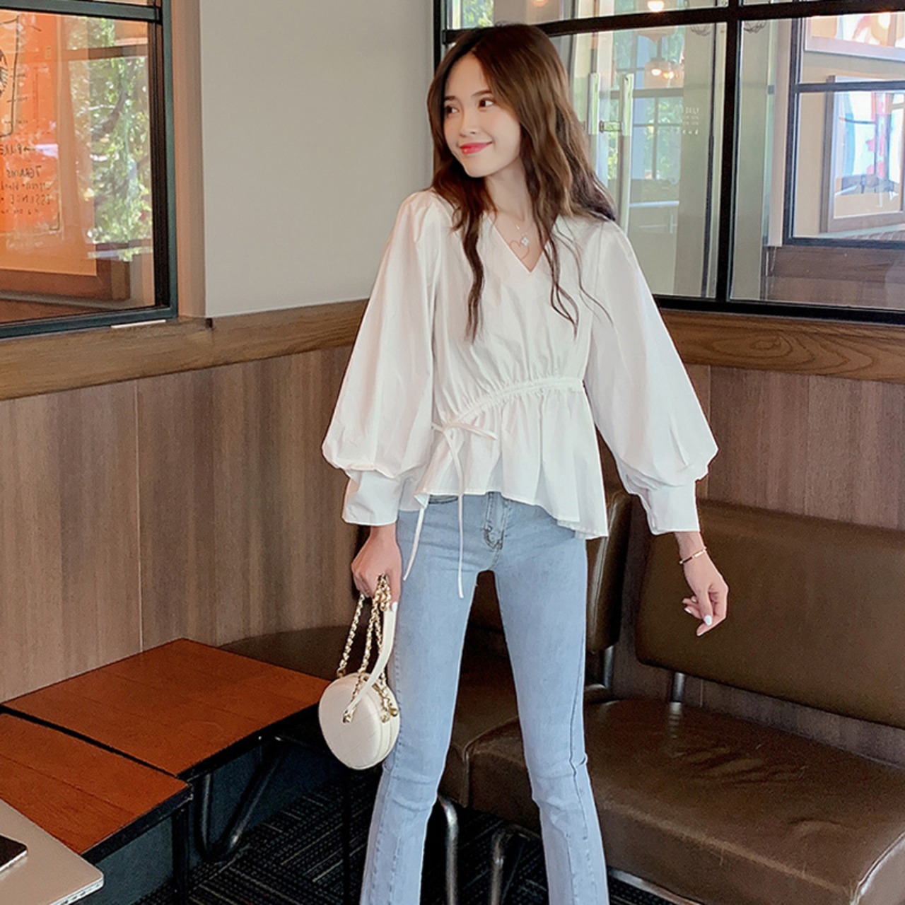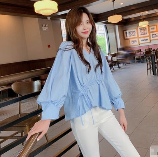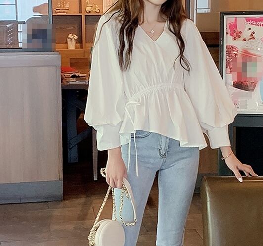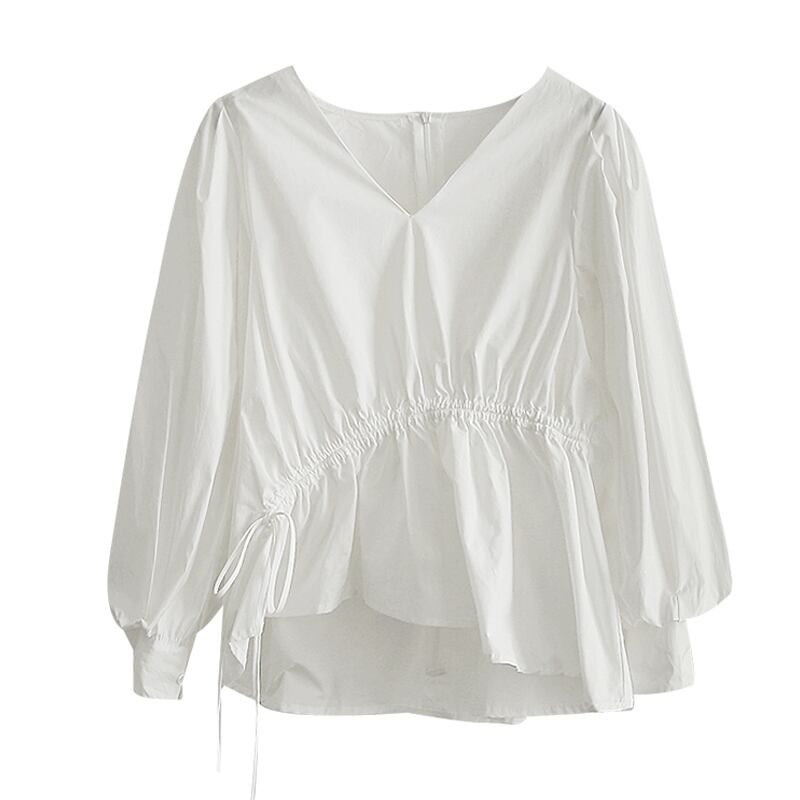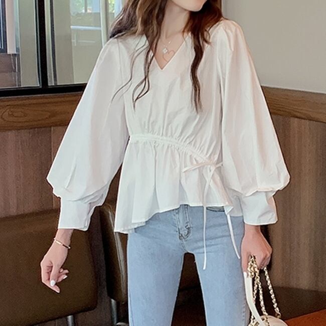 全2色 ブラウス トップス プルオーバー ゆったり オーバーサイズ 長袖 パフスリーブ Vネック ペプラム ランタンスリーブ フリル アシンメトリー 可愛い ガーリー カジュアル デイリー デート 秋