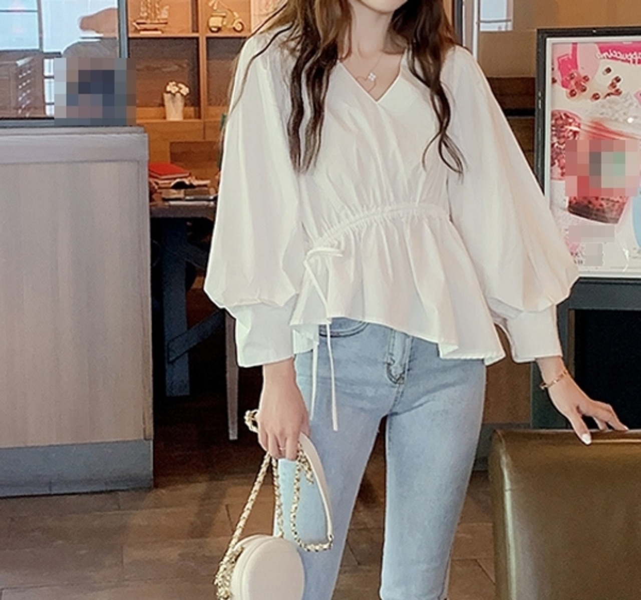 ランタンスリーブの程よいボリューム感が上品なブラウス。