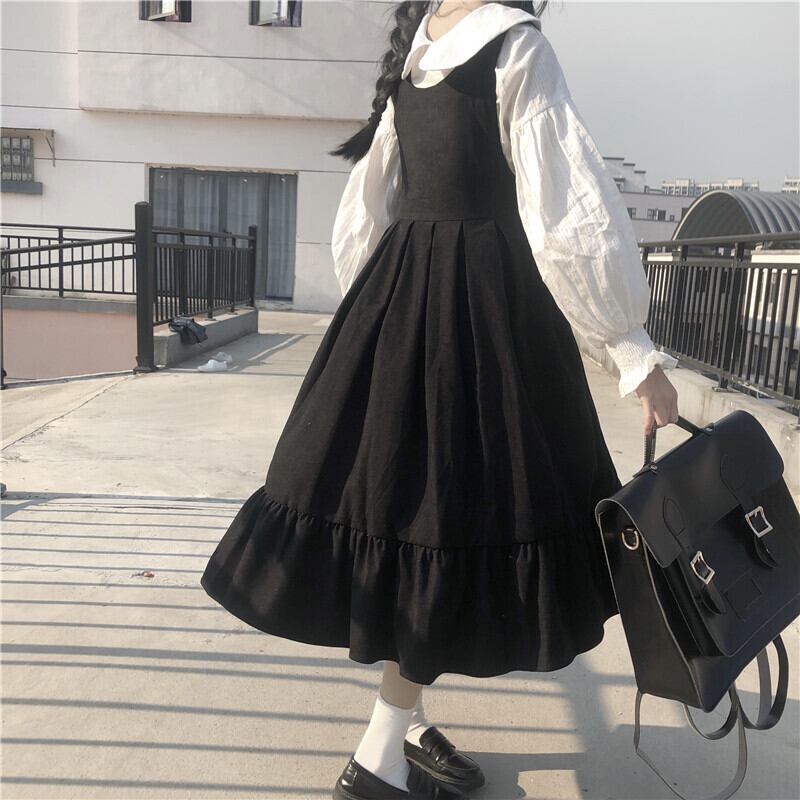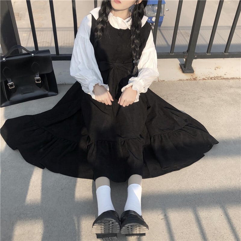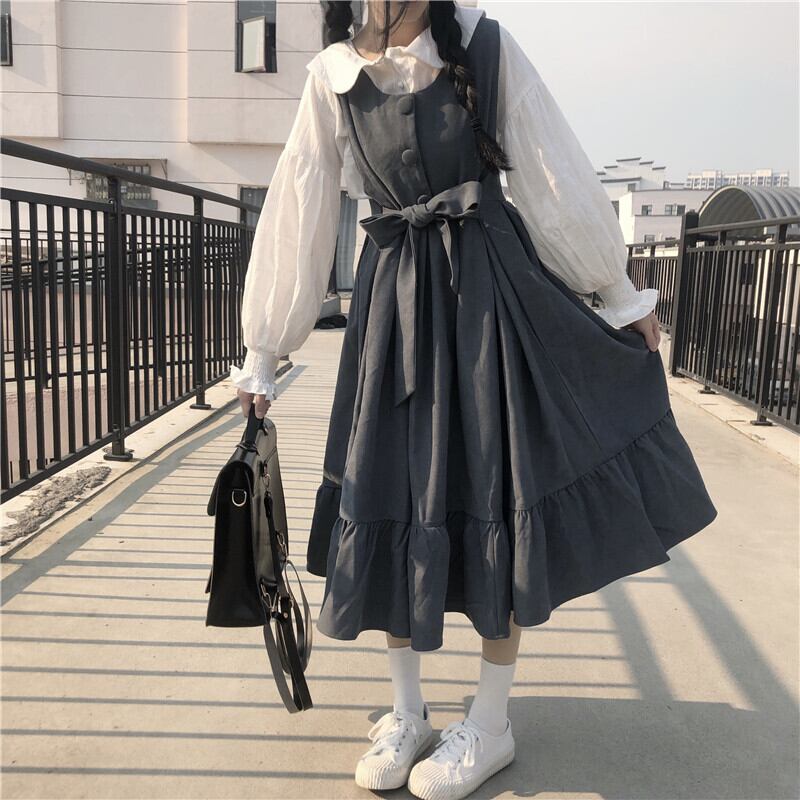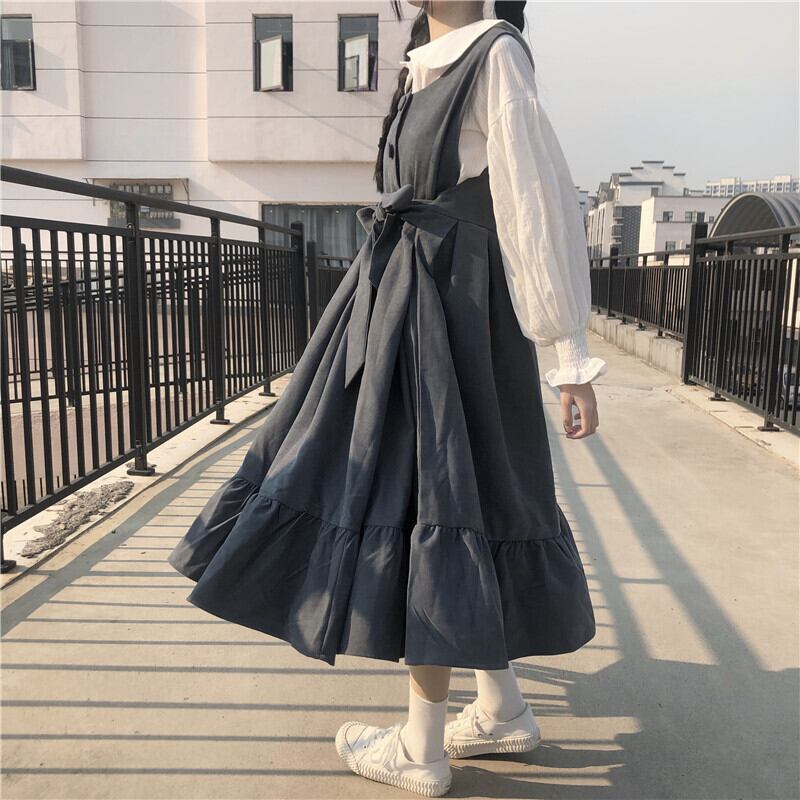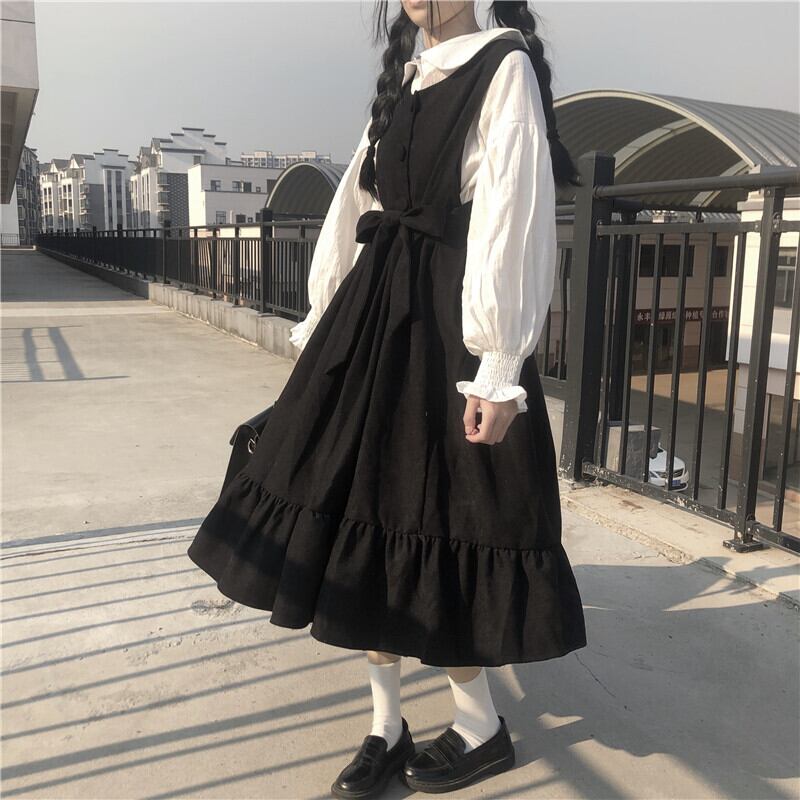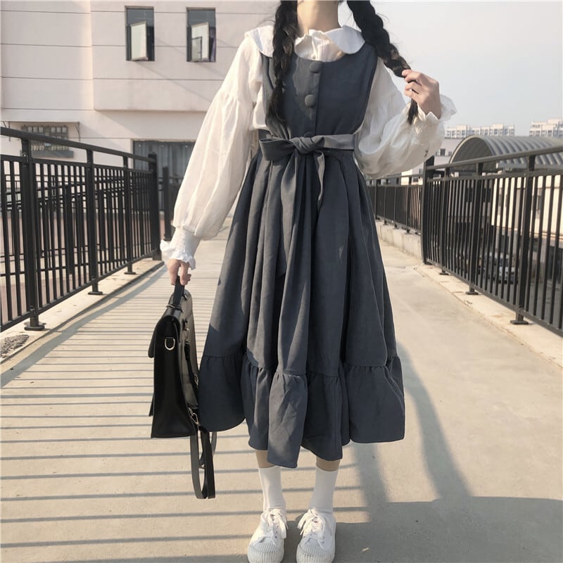 全3色 2種 ブラウス トップス 長袖 ワンピース ミモレ丈 ランタンスリーブ ウエストリボン フリル フロントボタン Aライン 長袖 ノースリーブ 可愛い カジュアル お出かけ ロリータ 韓国ファッション 秋 冬