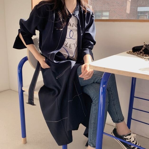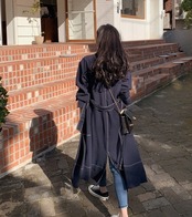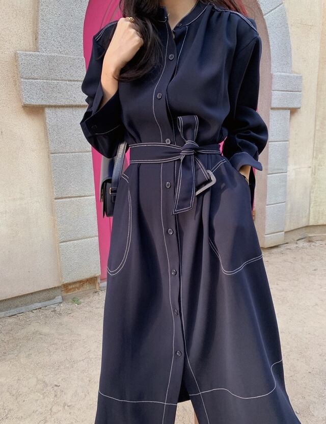 全2色 ワンピース アウター ミモレ丈 フロントボタン ウエストリボン スタンドカラー 長袖 ロングコート フレア Aライン 大人 上品 カジュアル エレガント お出かけ デート 女子会 韓国ファッション 秋 冬