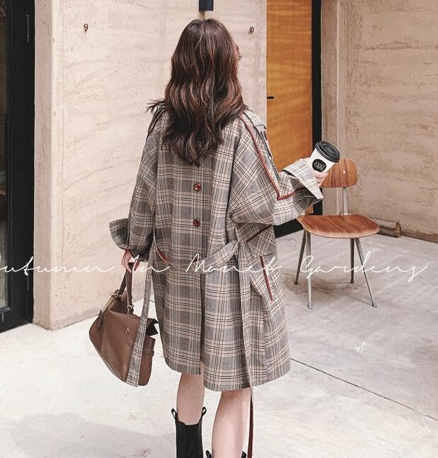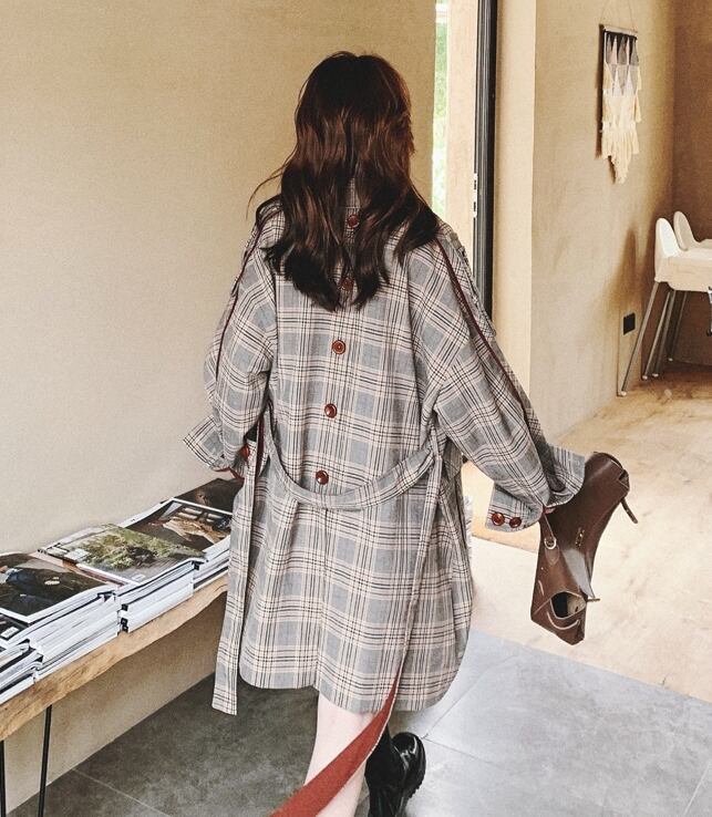チェック柄 コート ロングコートトレンチコート ウエストリボン カジュアル バックボタン バックコンシャス きれいめ 大人 お出かけ ボタン デート エレガント シック 上品 女子会 レトロ ユニーク 秋