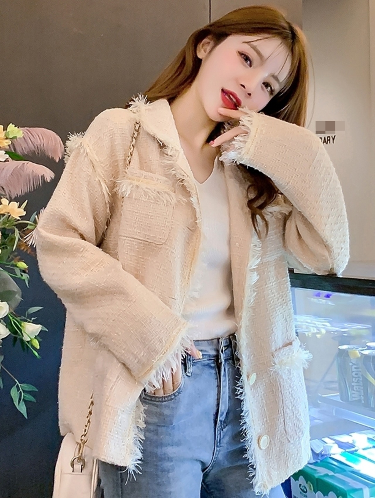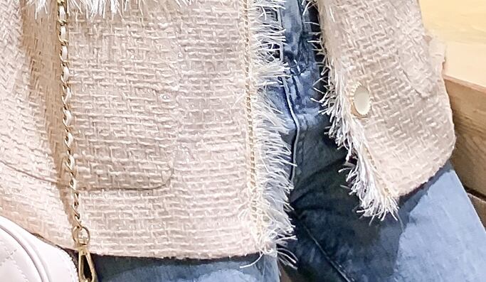 フリンジがポイントのツイードジャケット。
