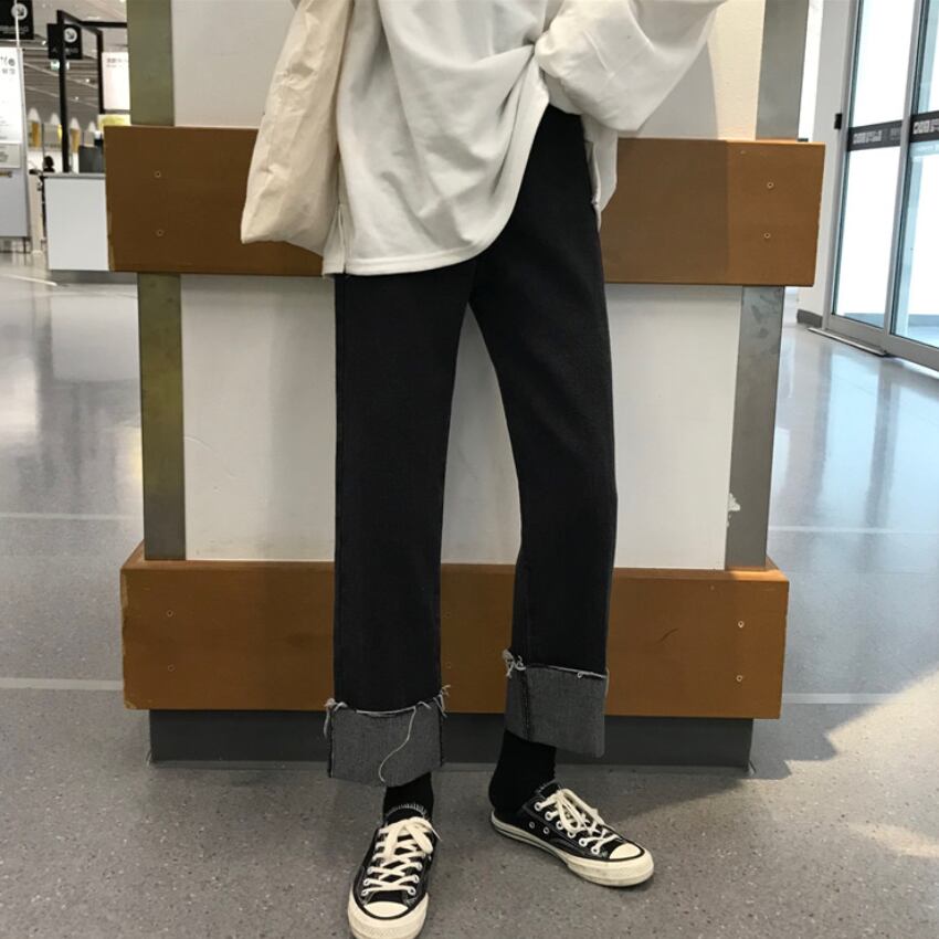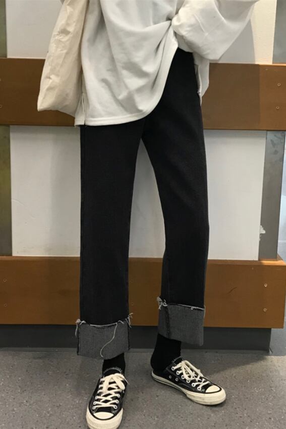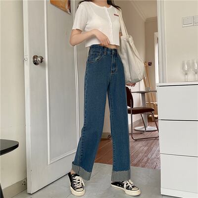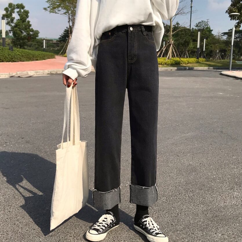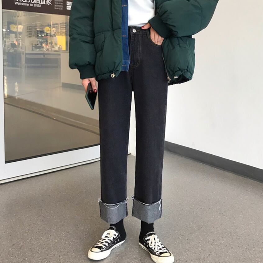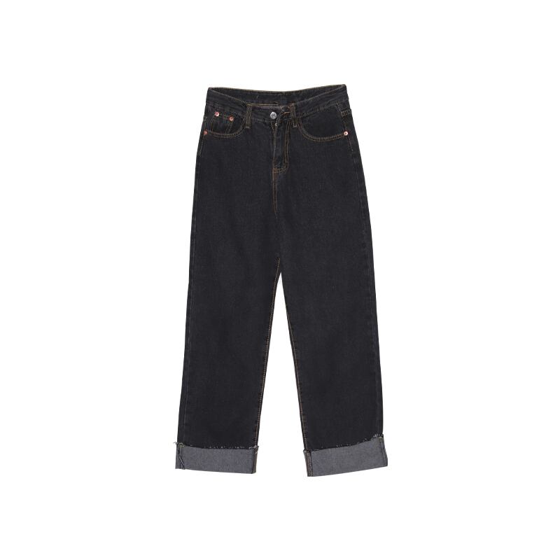 全2色 デニムパンツ パンツ ボトムス ジーンズ ハイウエスト ワイドパンツ ゆったりめ シンプル カジュアル ラフ デイリー 大人 メンズライク ストレート 通学 韓国ファッション ロールアップ レトロ 秋 冬