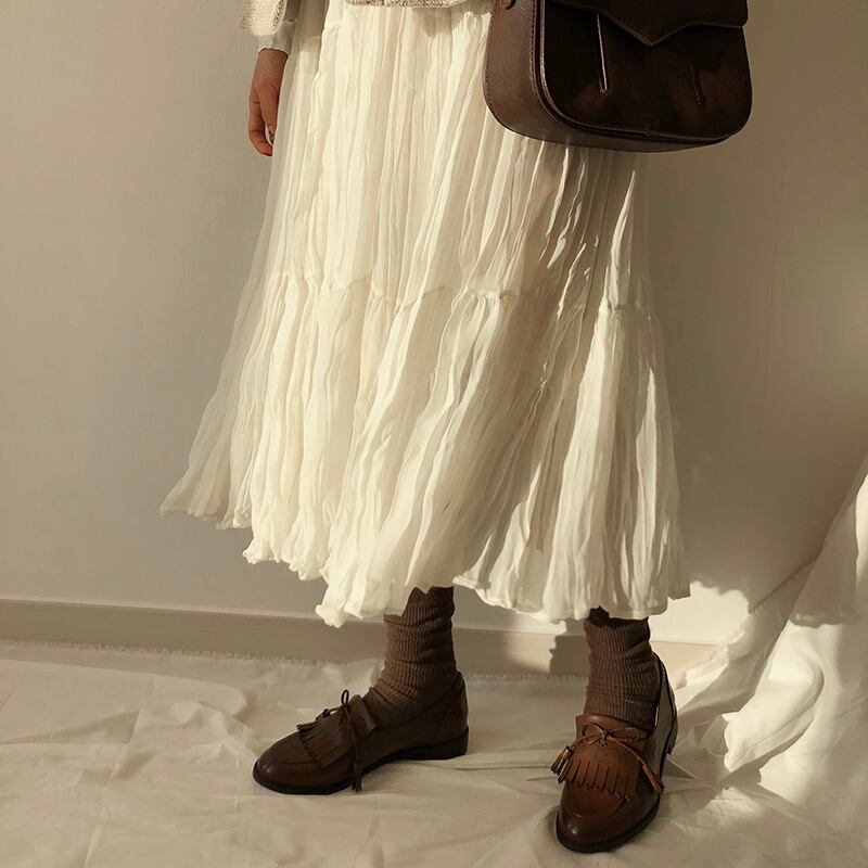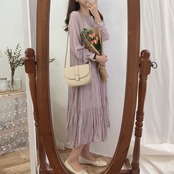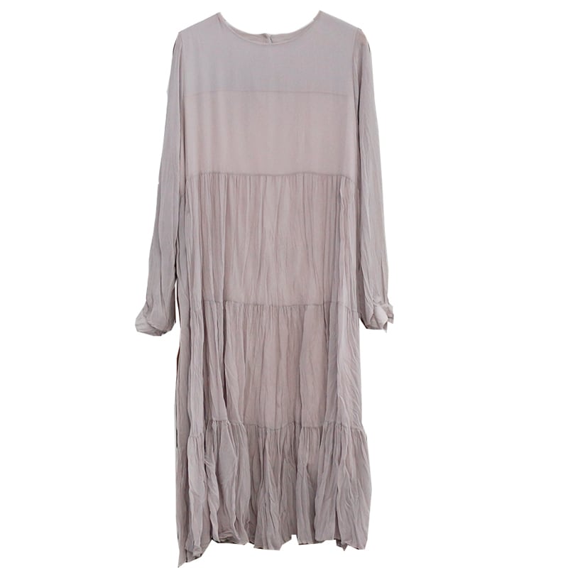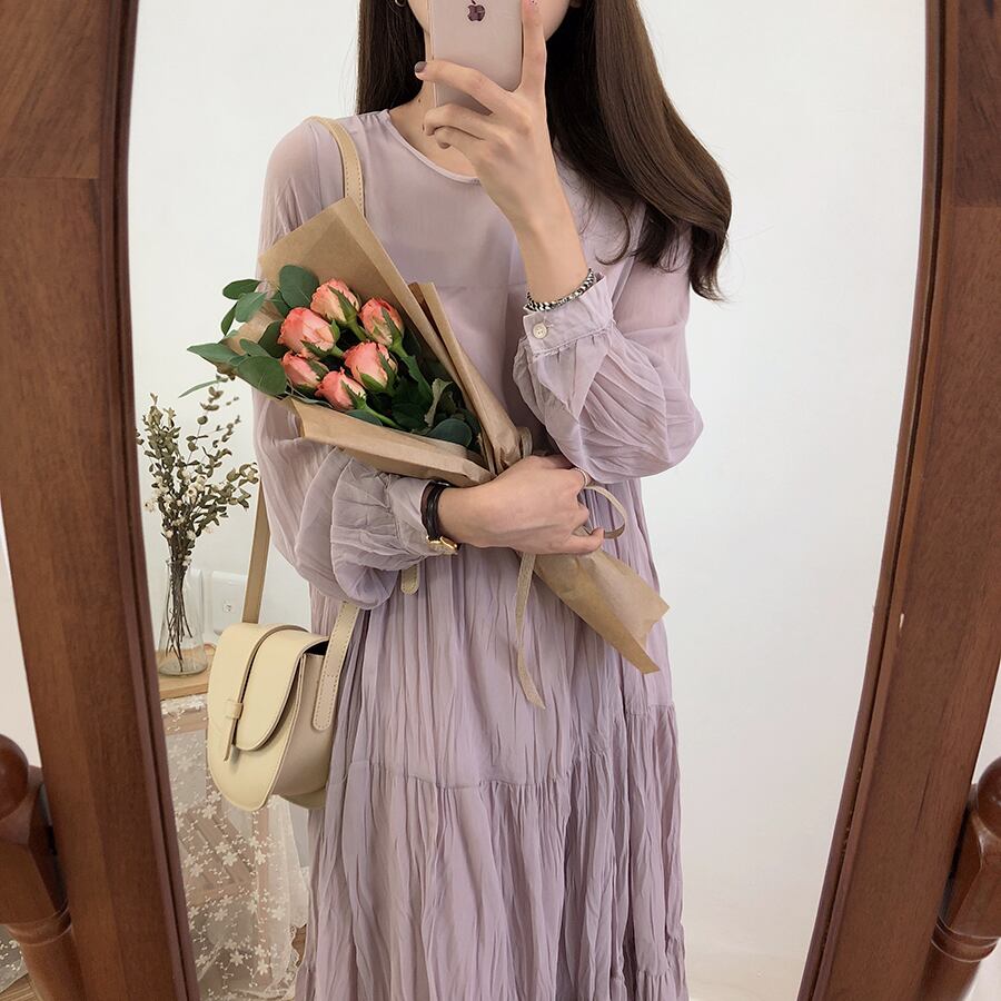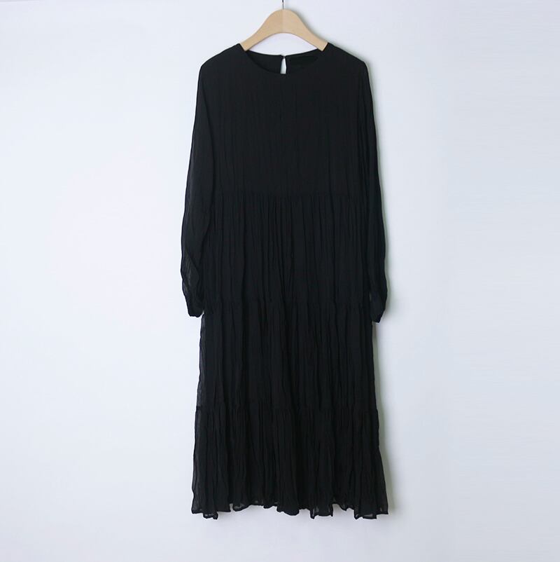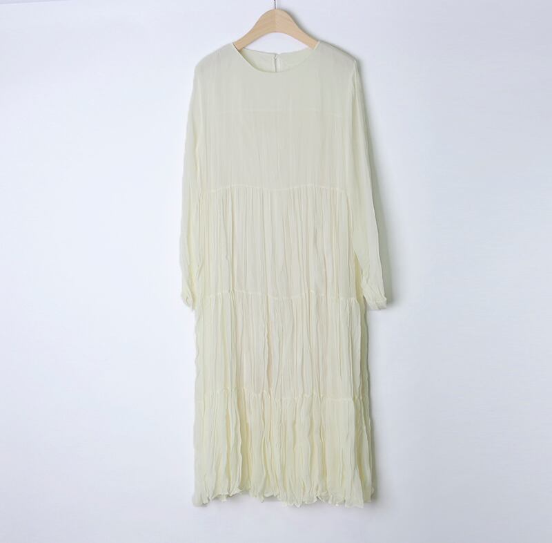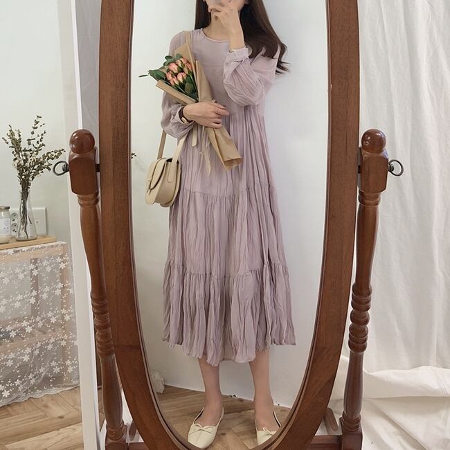 全3色 ワンピース ミモレ丈 ティアード 長袖 ラウンドネック 大人可愛い シフォン プリーツ レトロ カジュアル デイリー 大人 ゆったり リラクス 韓国ファッション 秋